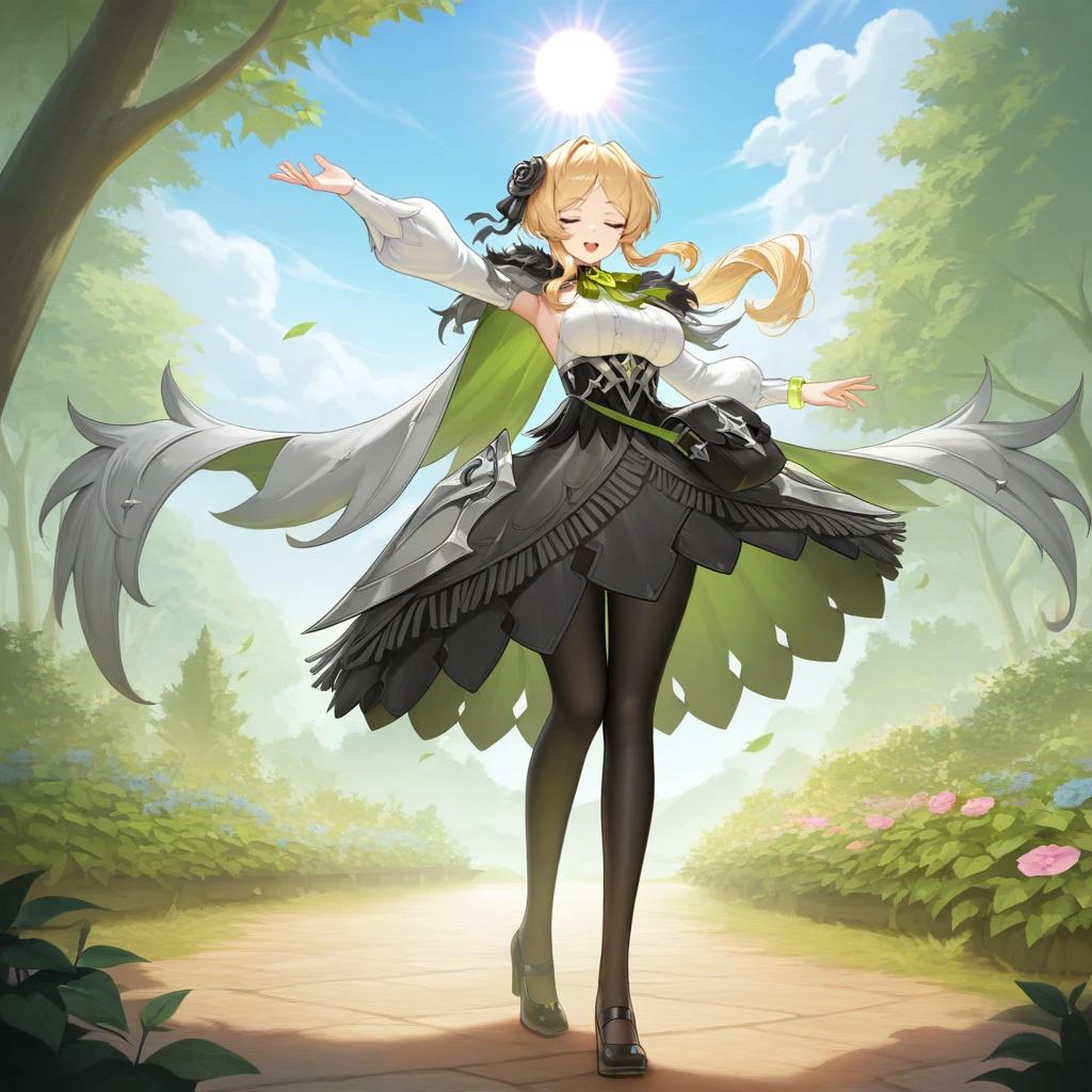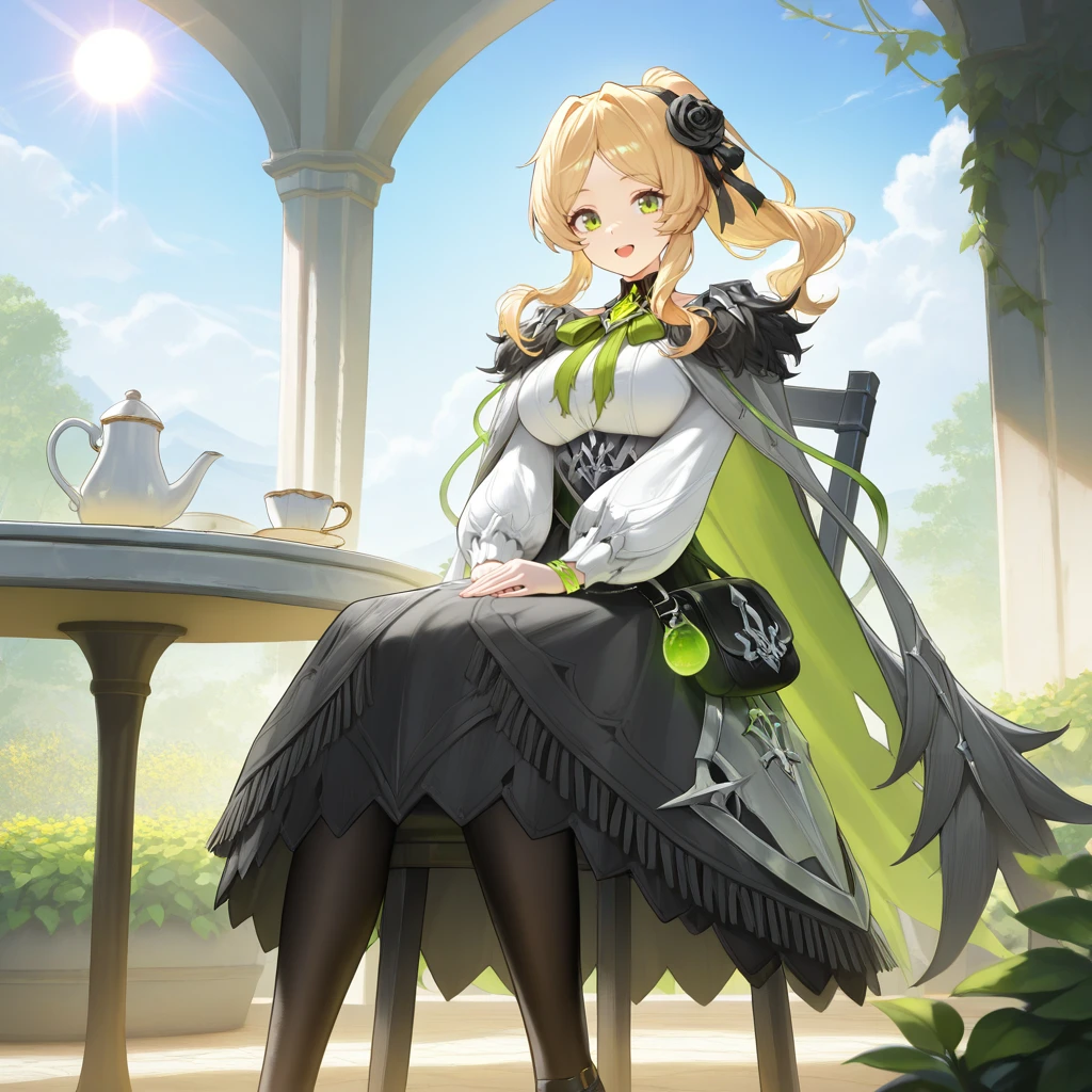 DaphneDNA, blonde hair, sidelocks, ponytail, black rose, black ribbon, hair ribbon, hair flower, green eyes, long hair, green ribbon, neck ribbon, bow ribbon, emblem, black collar, waist bag, vial, collared collar, armored skirt, sleeveless shirt, white shirt, fur-trimmed cape, grey cape, two-sided cape, high-waist skirt, medium skirt, black skirt, corset, silver trim, off shoulder, puffy long sleeves, bracelet, fringe trim, black pantyhose, pantyhose, black footwear, high heels, mary janes,The results of your generations are dependent on the additional LoRAs, weights, and models you use, so it may not work or come out as consistent as my sample images.