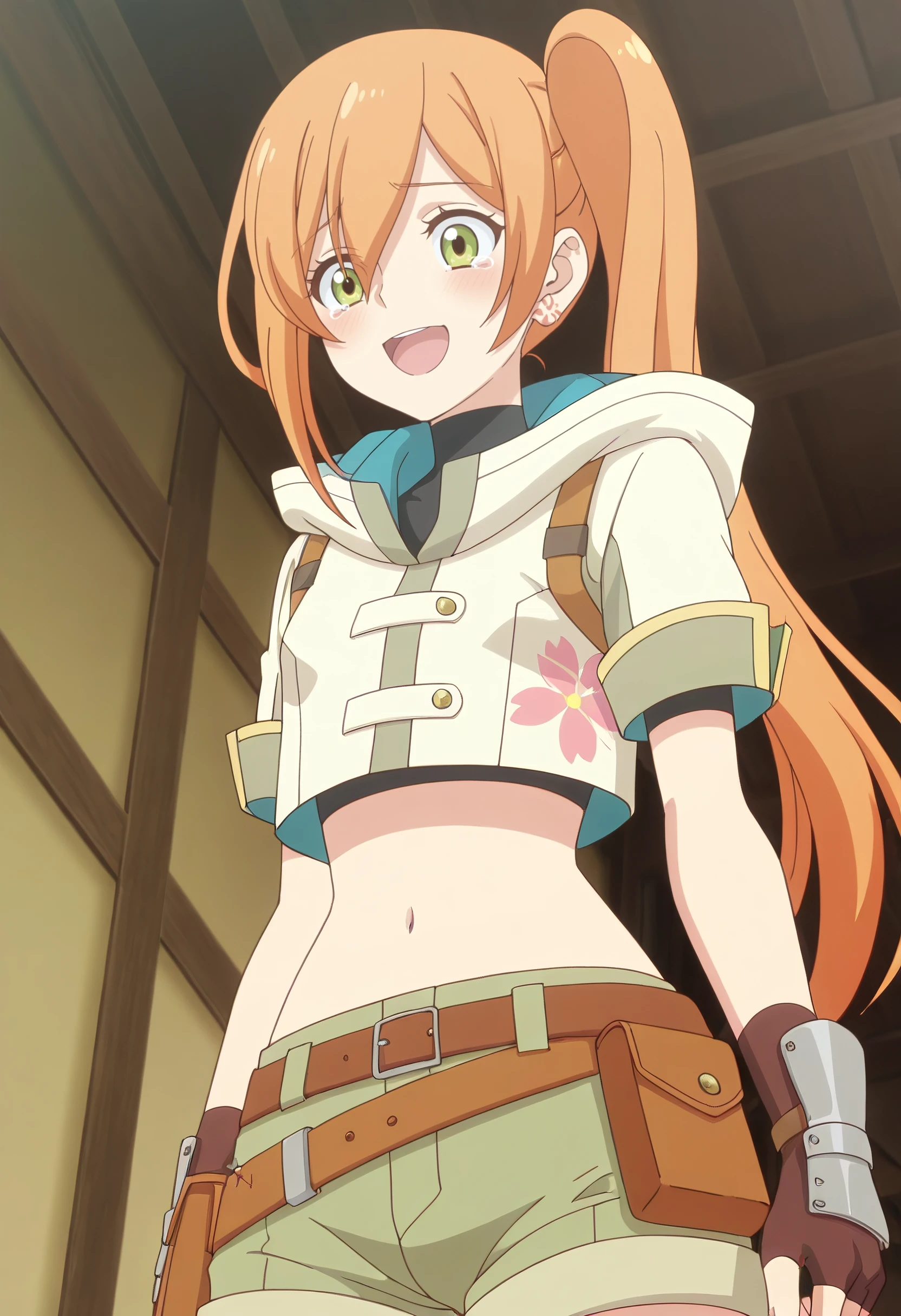 SinaOutfit, hood, white jacket, short sleeves, brown gloves, crop top, midriff, hood down, cropped jacket, black shirt, navel, earrings, jewelry, brown belt, hooded jacket, fingerless gloves, green shorts, cropped shirt, black undershirt, turtleneck, pouch, flower earrings,