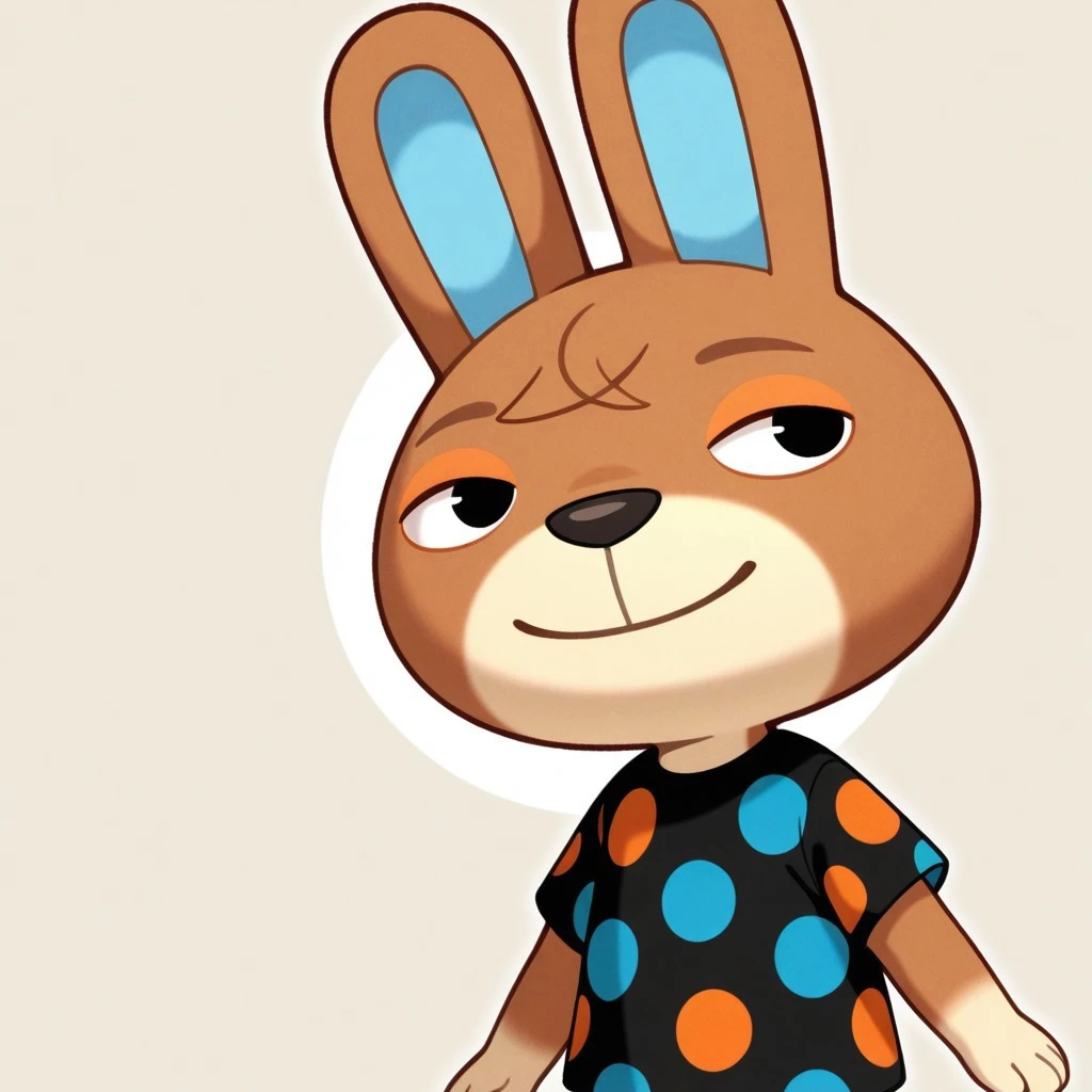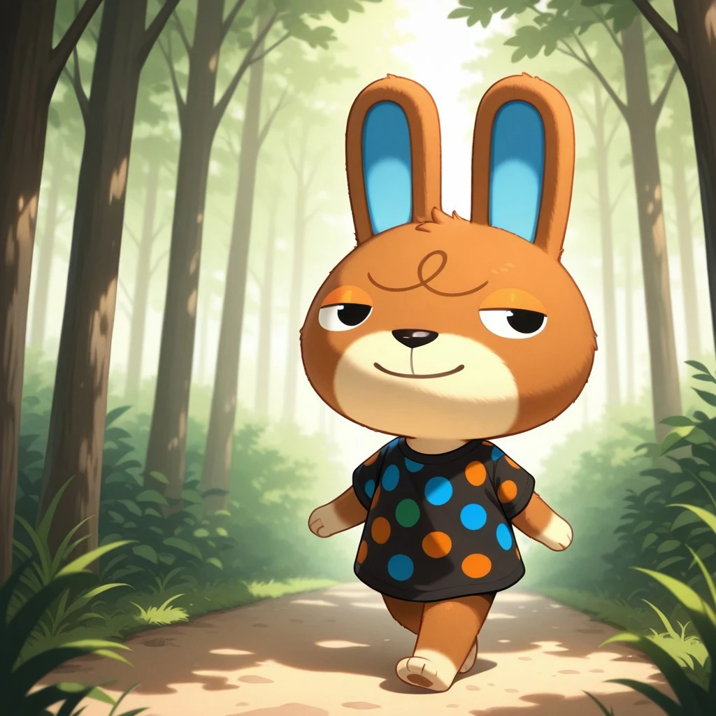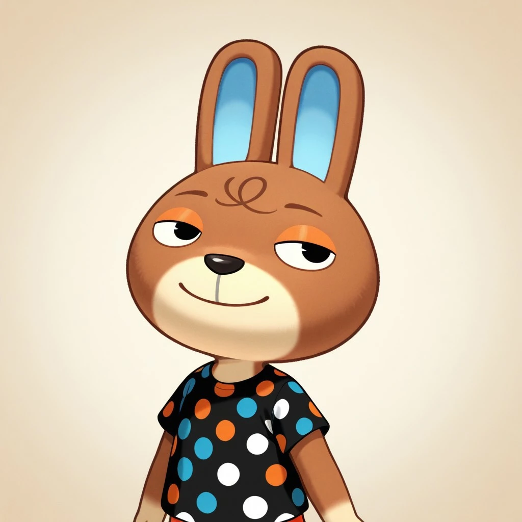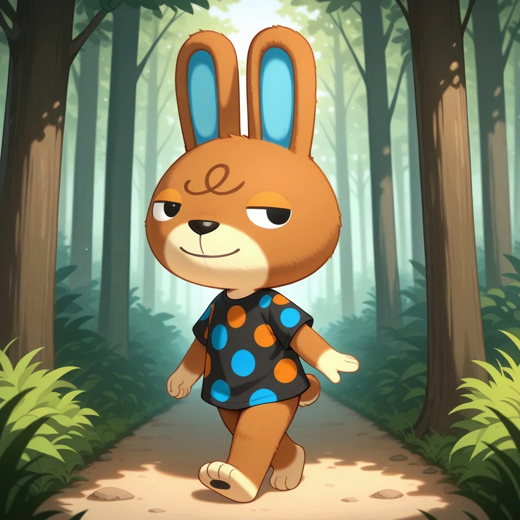 solo,male,anthro rabbit,Brown fur,tan mouth,tan hands,blue inner ears,rabbit ears,black nose,lazy eyes,black eyes,black polka shirt,smile,head tutfs,light-orange eyelid