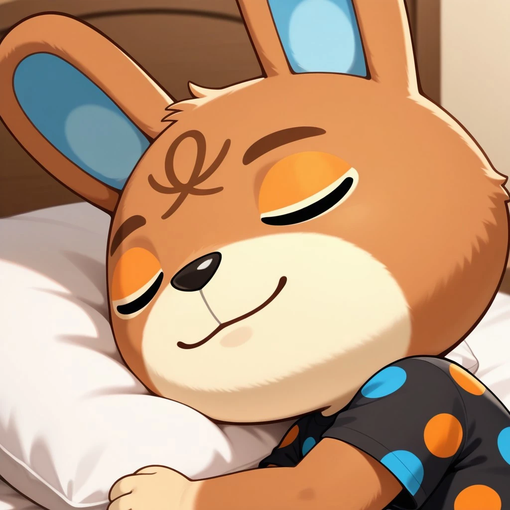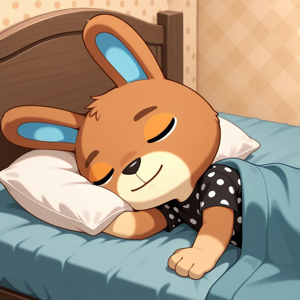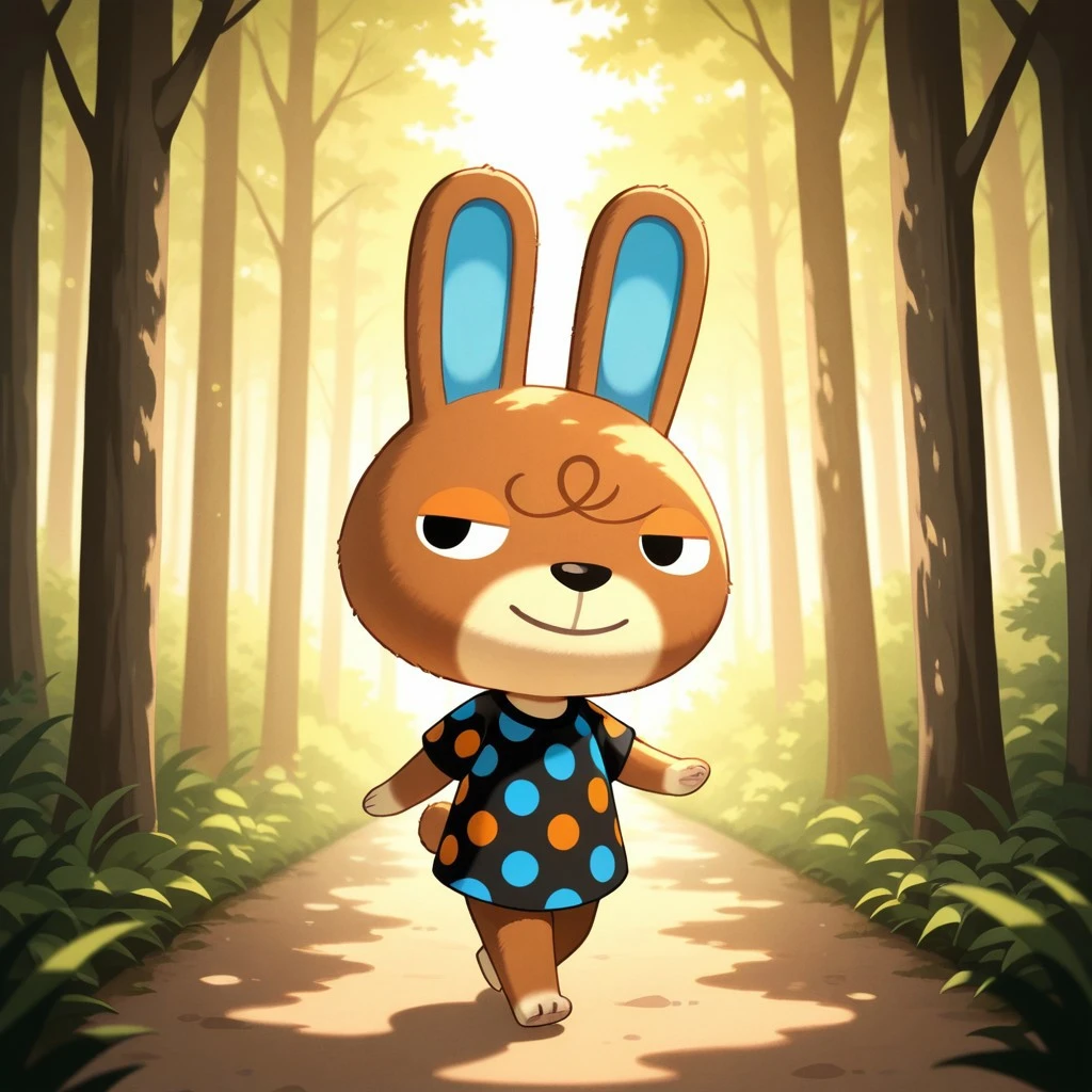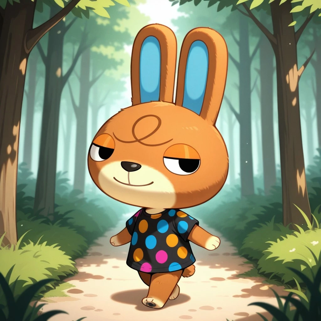 solo,male,anthro rabbit,Brown fur,tan mouth,tan hands,blue inner ears,rabbit ears,black nose,lazy eyes,black eyes,black polka shirt,smile,head tutfs,light-orange eyelid
