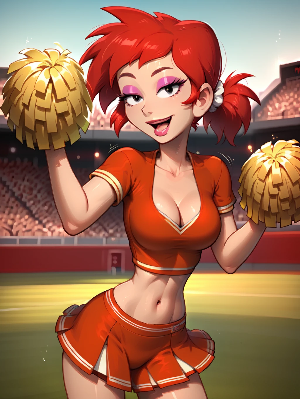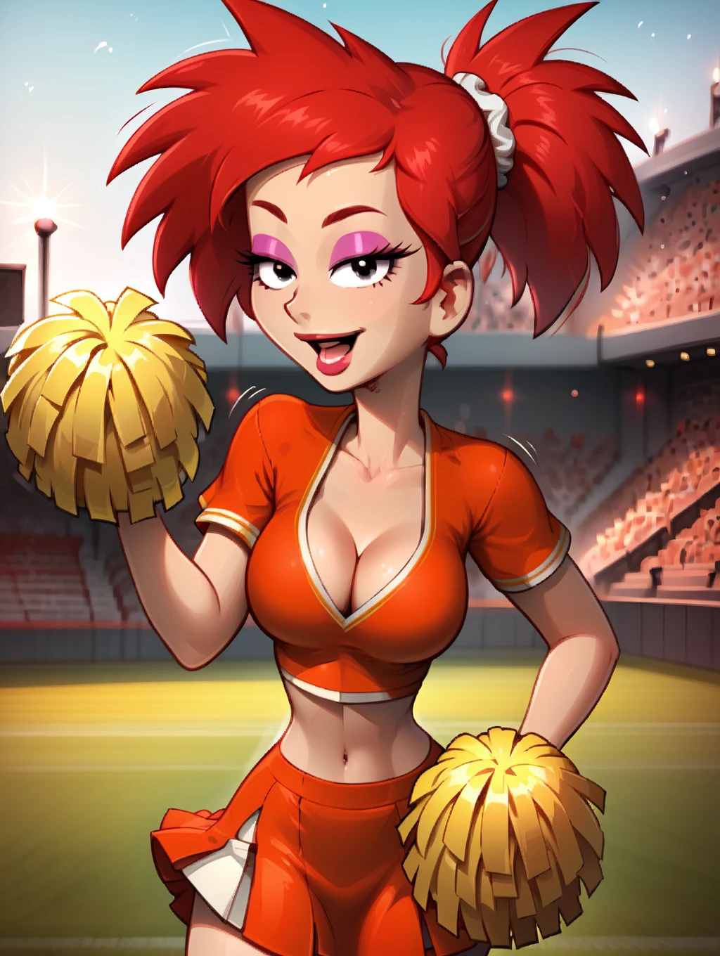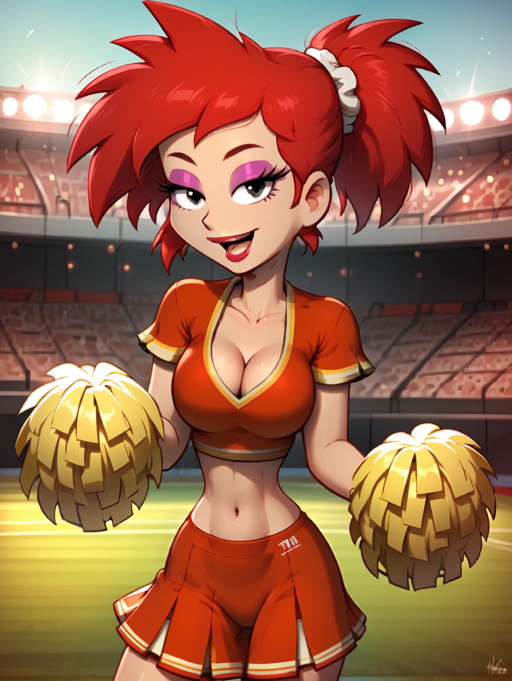 rita, red hair, narrow waist, 1girl, toon (style), flat color, medium breasts, black eyes, long eyelashes, rita hair, short ponytail