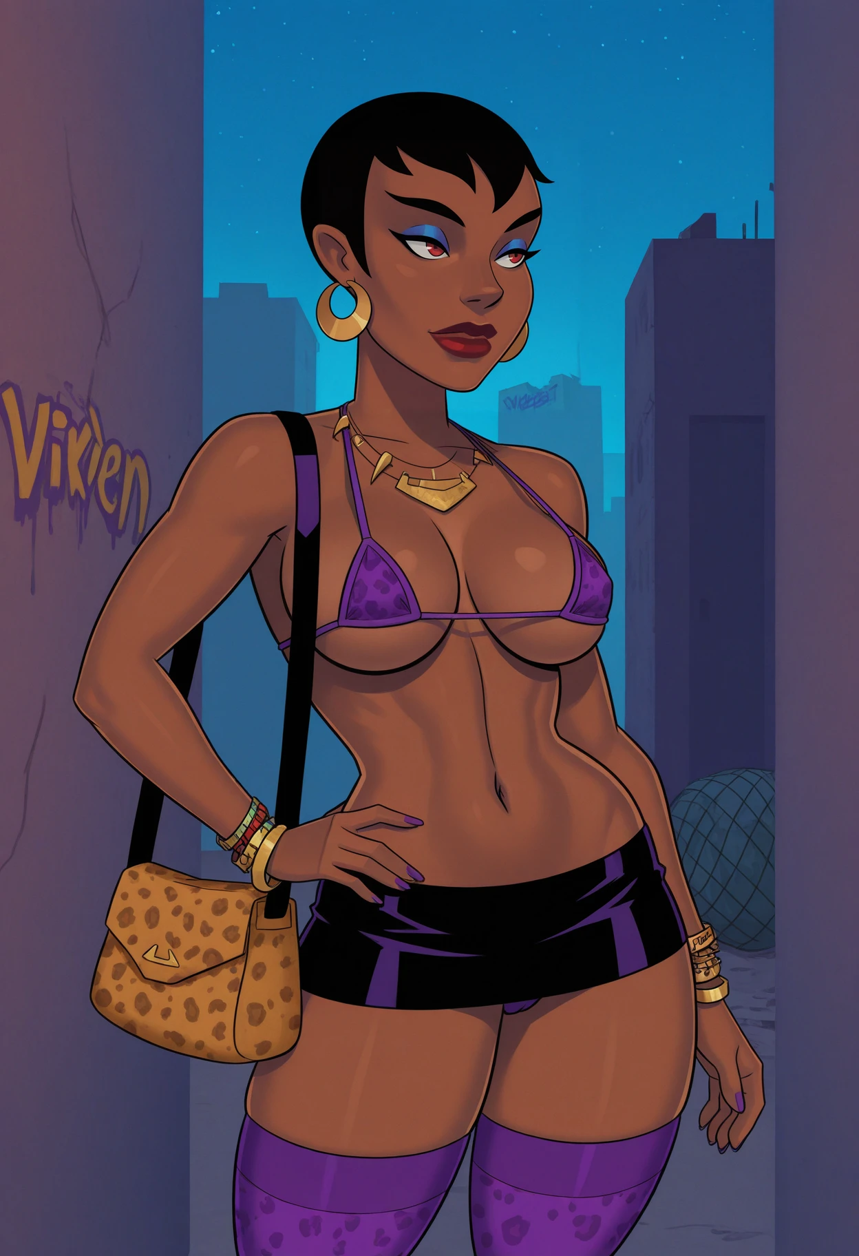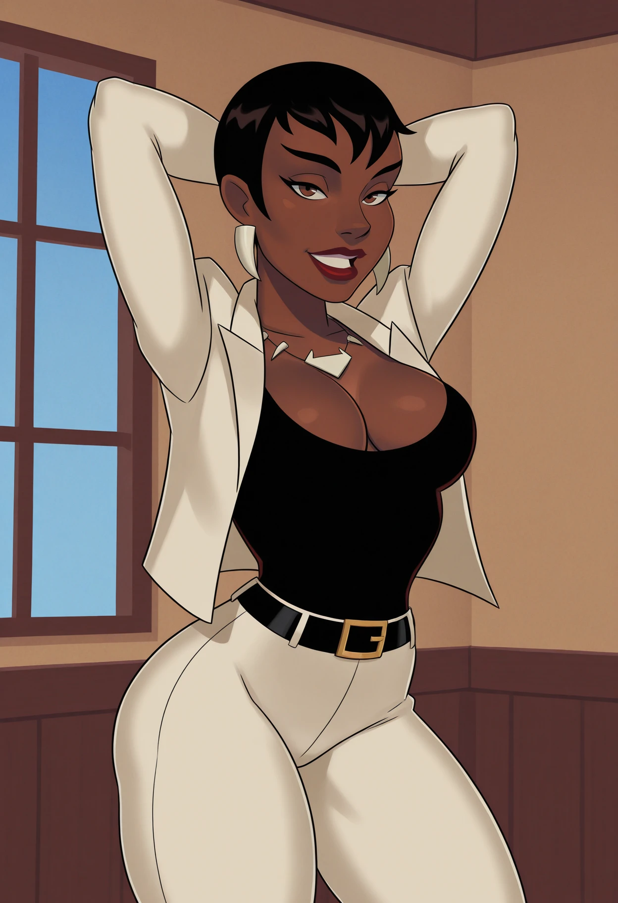 1girl, solo, dark skin, dark-skinned female, very dark skin, brown eyes, black hair, short hair, breasts, large breasts, lips, eyeshadow, lipstick, red lips,main outfit tags: