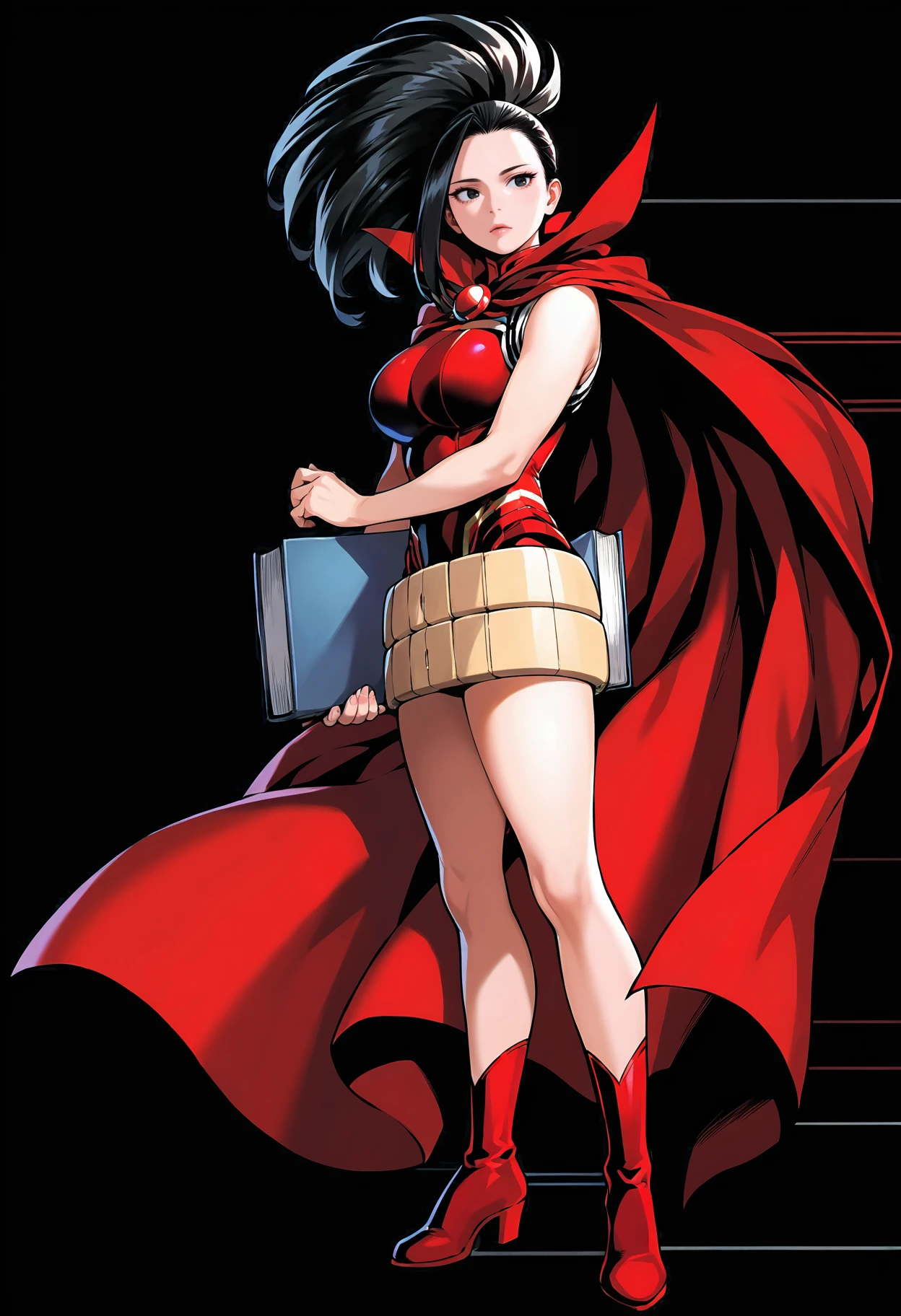 cape,breasts,red footwear,leotard,bare shoulders,red leotard,boots,high heels,hair pulled back,book,belt,high heel boots,red cape,sleeveless,superhero,bare arms,bare legs,beltskirt