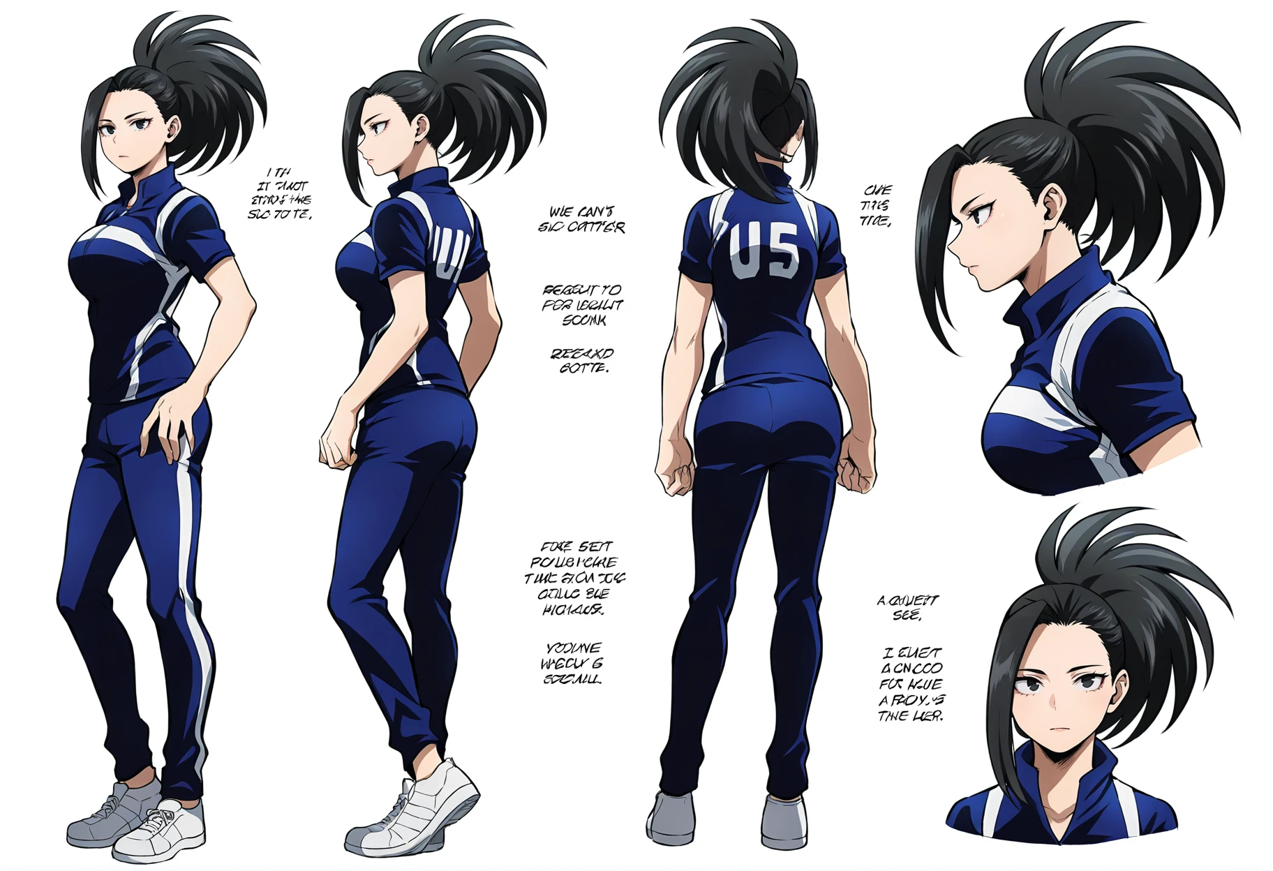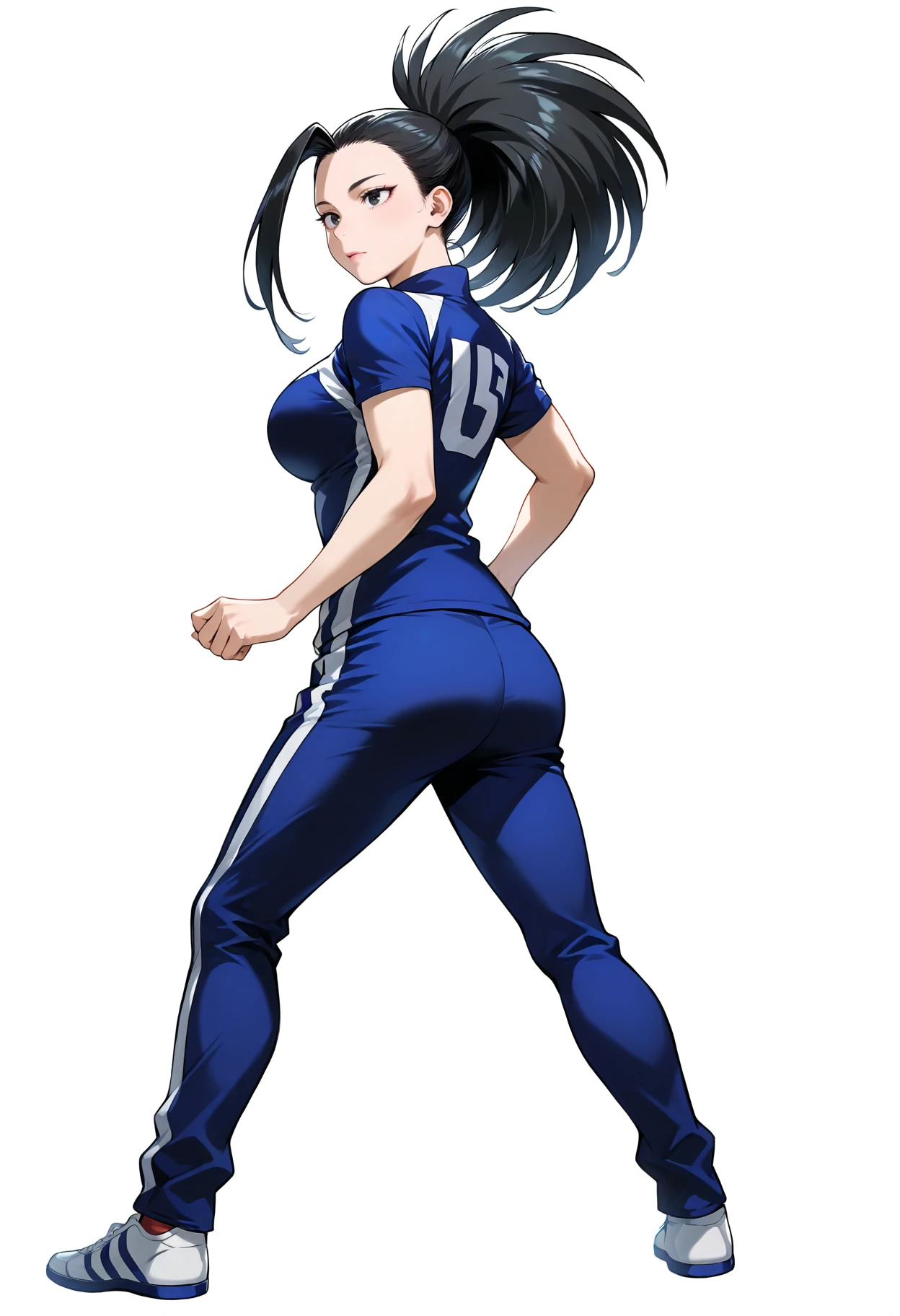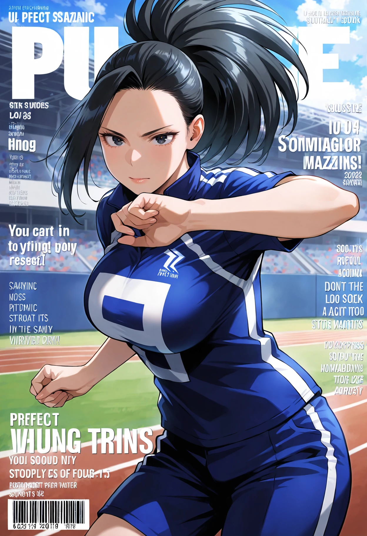 breasts,blue shirt,shirt,sportswear,blue pants,pants,short sleeves,hair pulled back,jersey,blue shorts,track pants,shorts,u.a. gym uniform