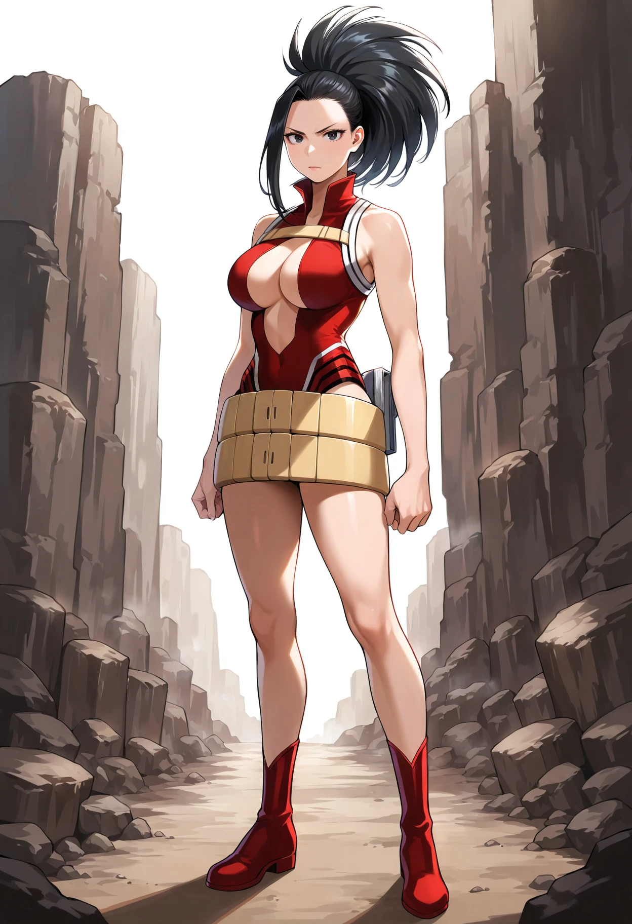 breasts,center opening,hair pulled back,red leotard,red footwear,boots,leotard,bare arms,bare shoulders,belt,beltskirt,v-shaped eyebrows,turtleneck,medium hair,high collar,halterneck,bare legs
