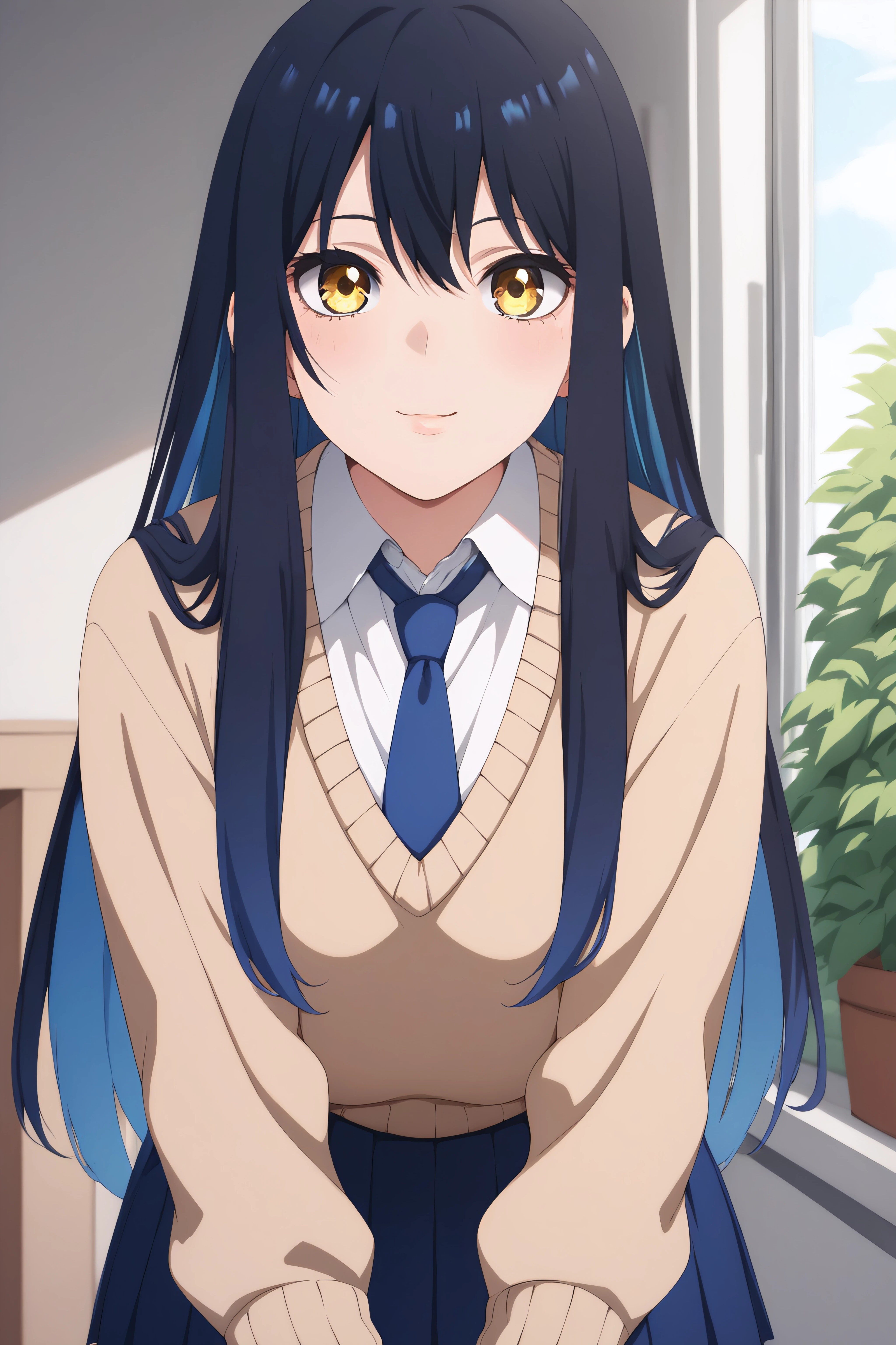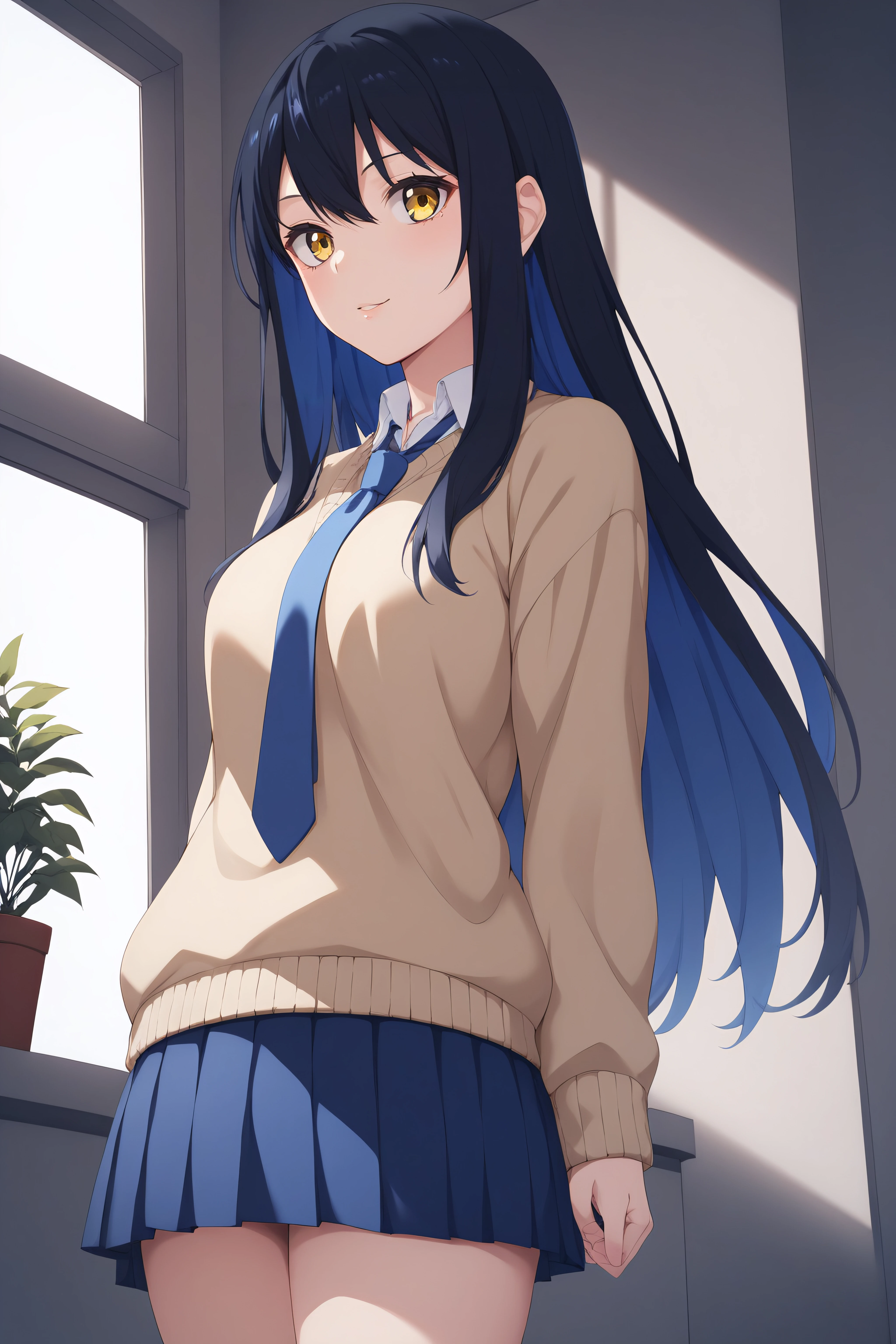 score_9, score_8_up, score_7_up, score_6_up, score_5_up, score_4_up, BREAK source_anime, miko yotsuya, yellow eyes, black hair, blue hair, multicolored hair, long hair, blue pleated skirt, beige sweater, blue necktie,