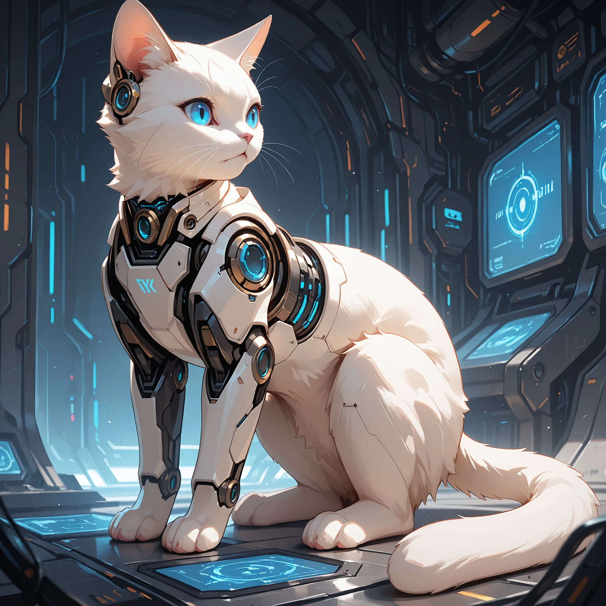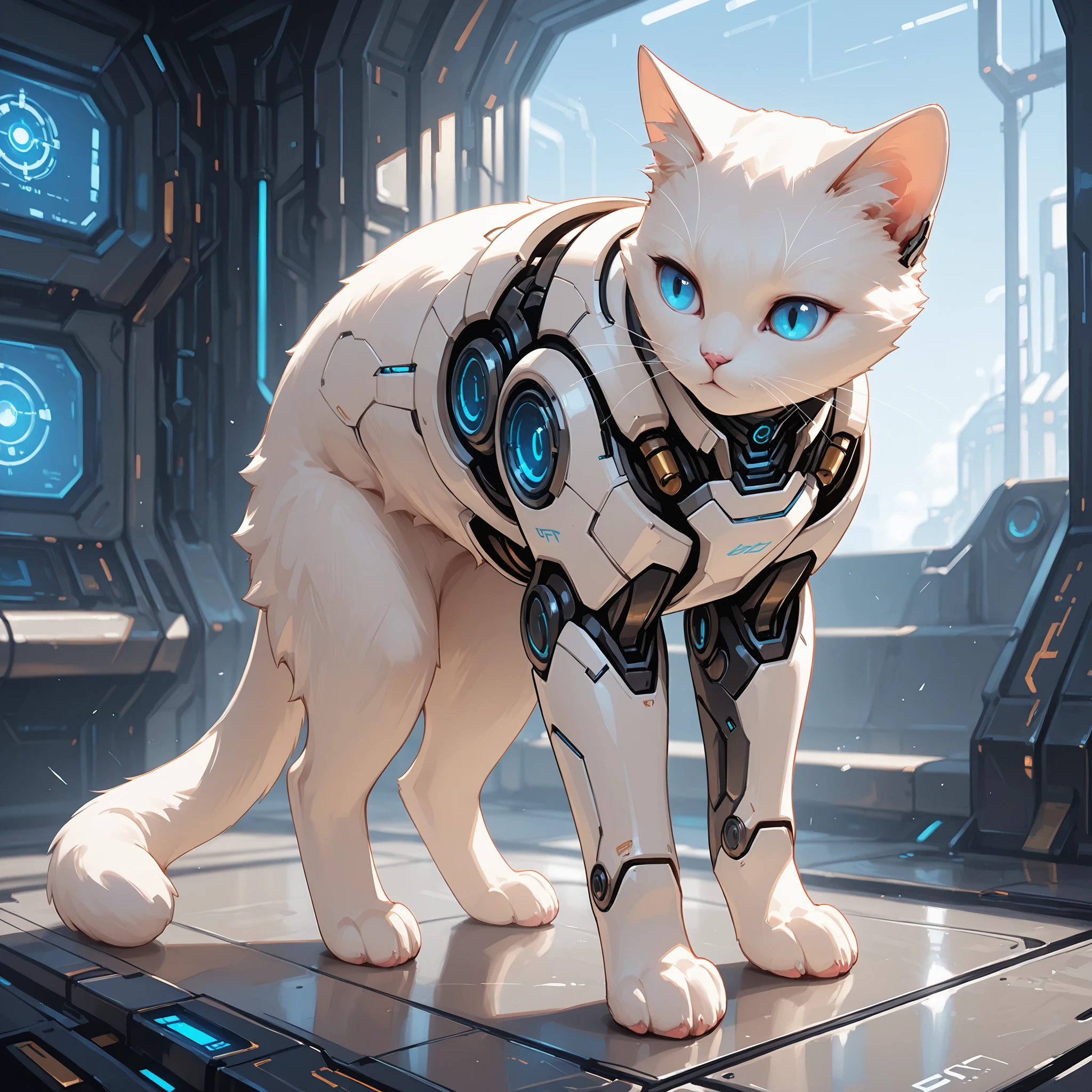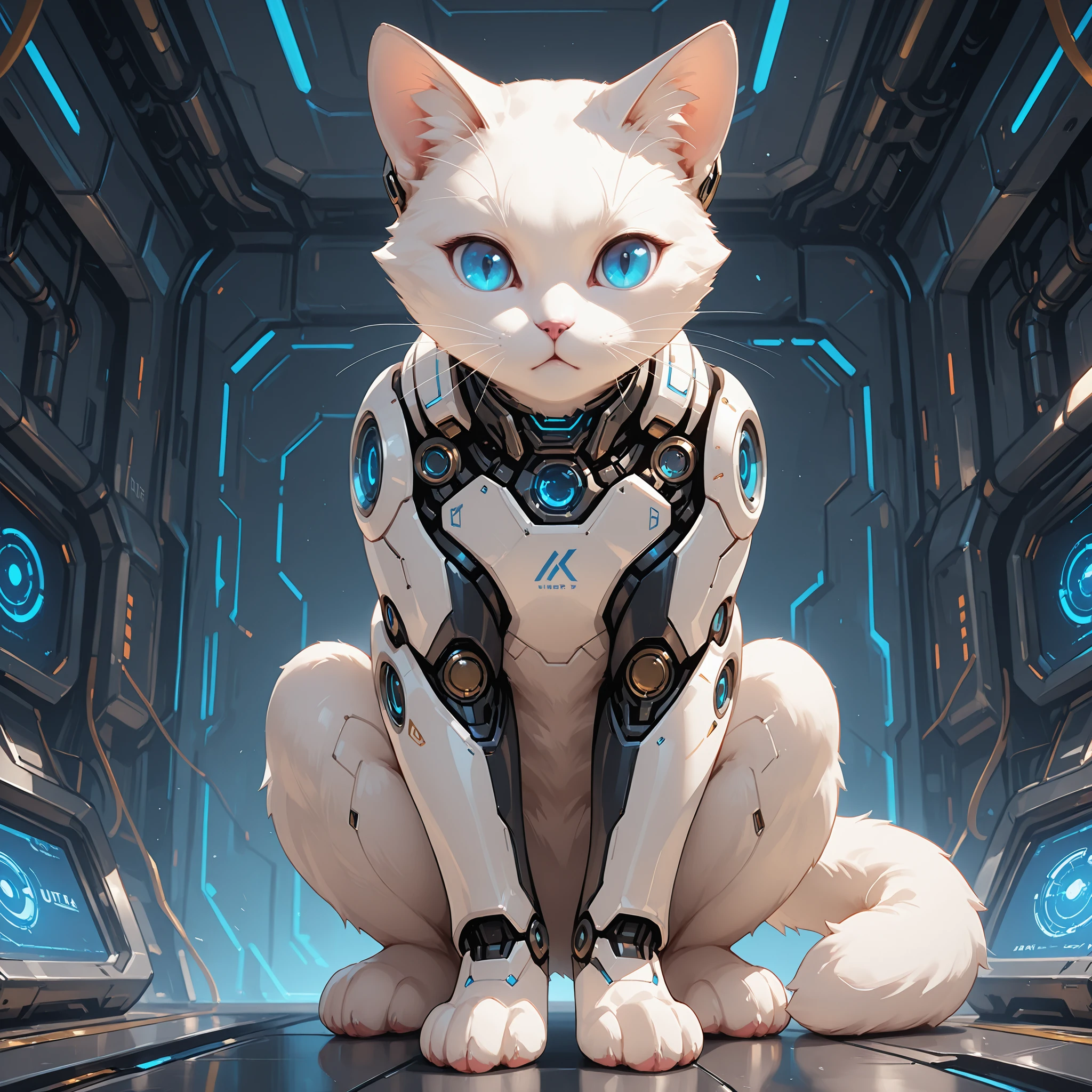 1 cat, Cyborg, solo, sci-fi, White cat, blue eyes,