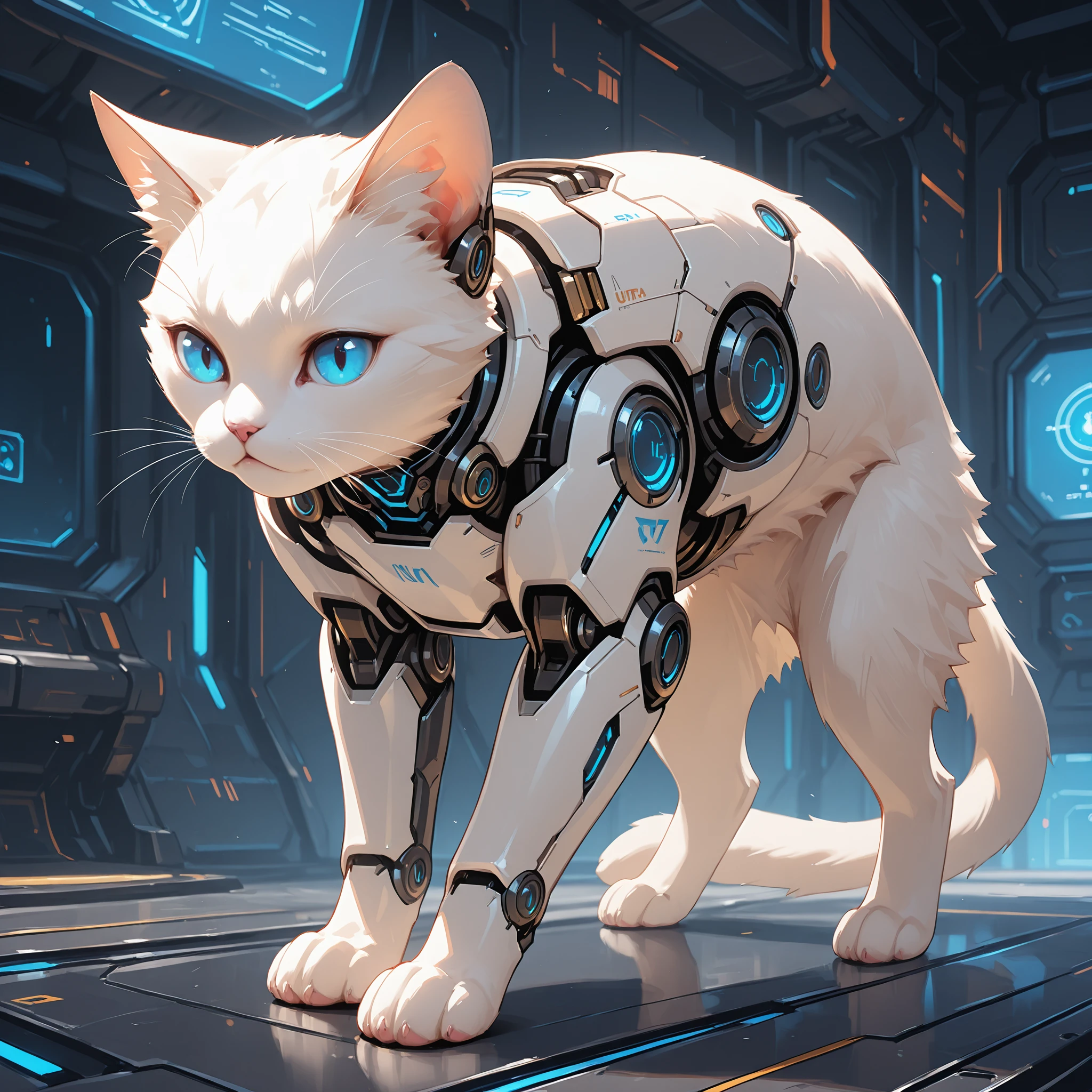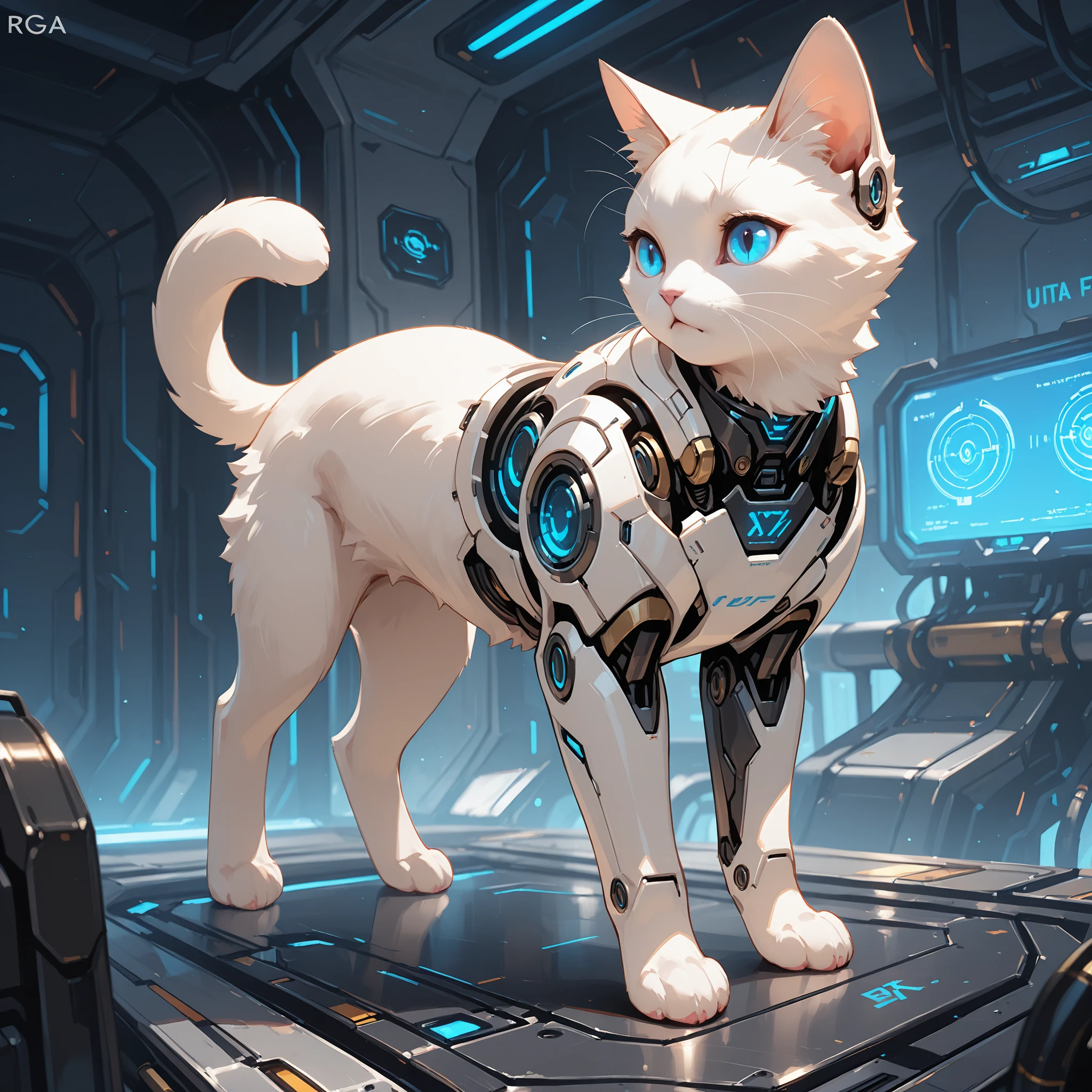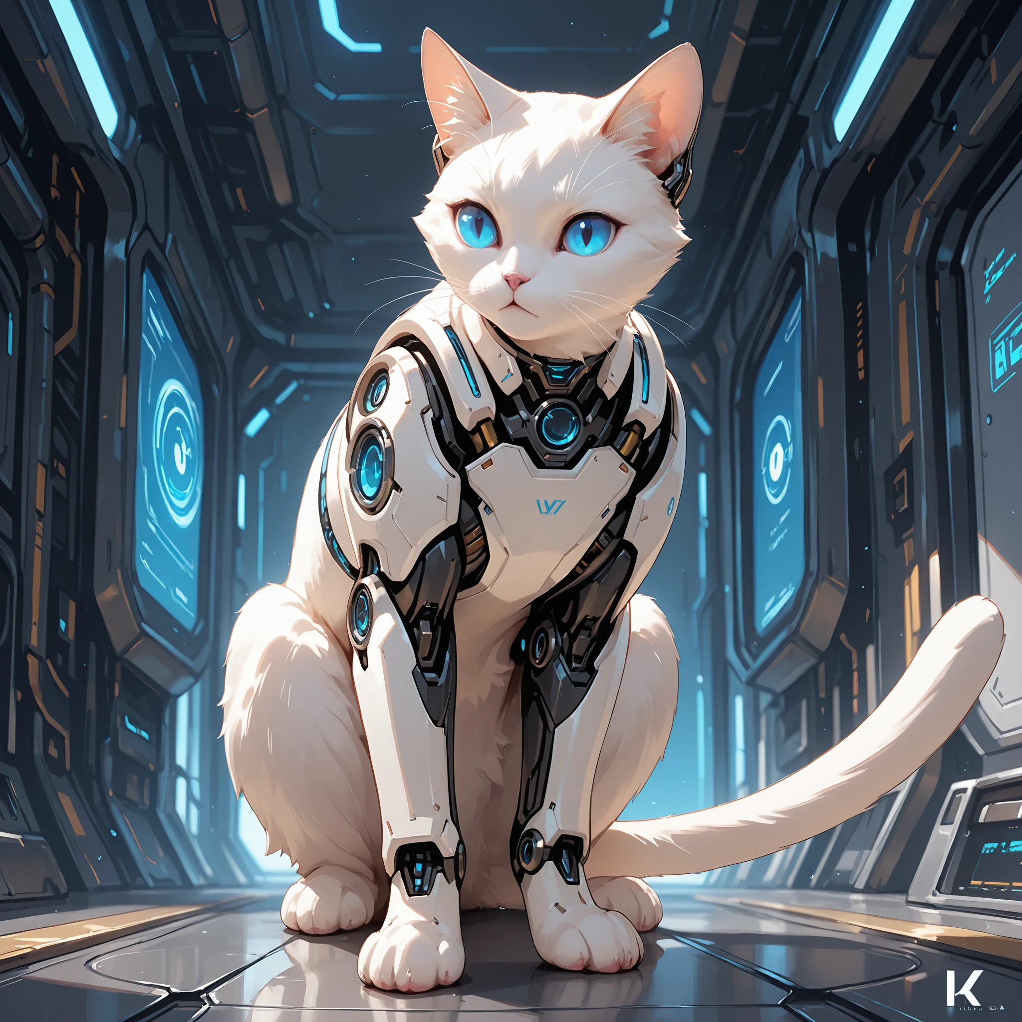 1 cat, Cyborg, solo, sci-fi, White cat, blue eyes,