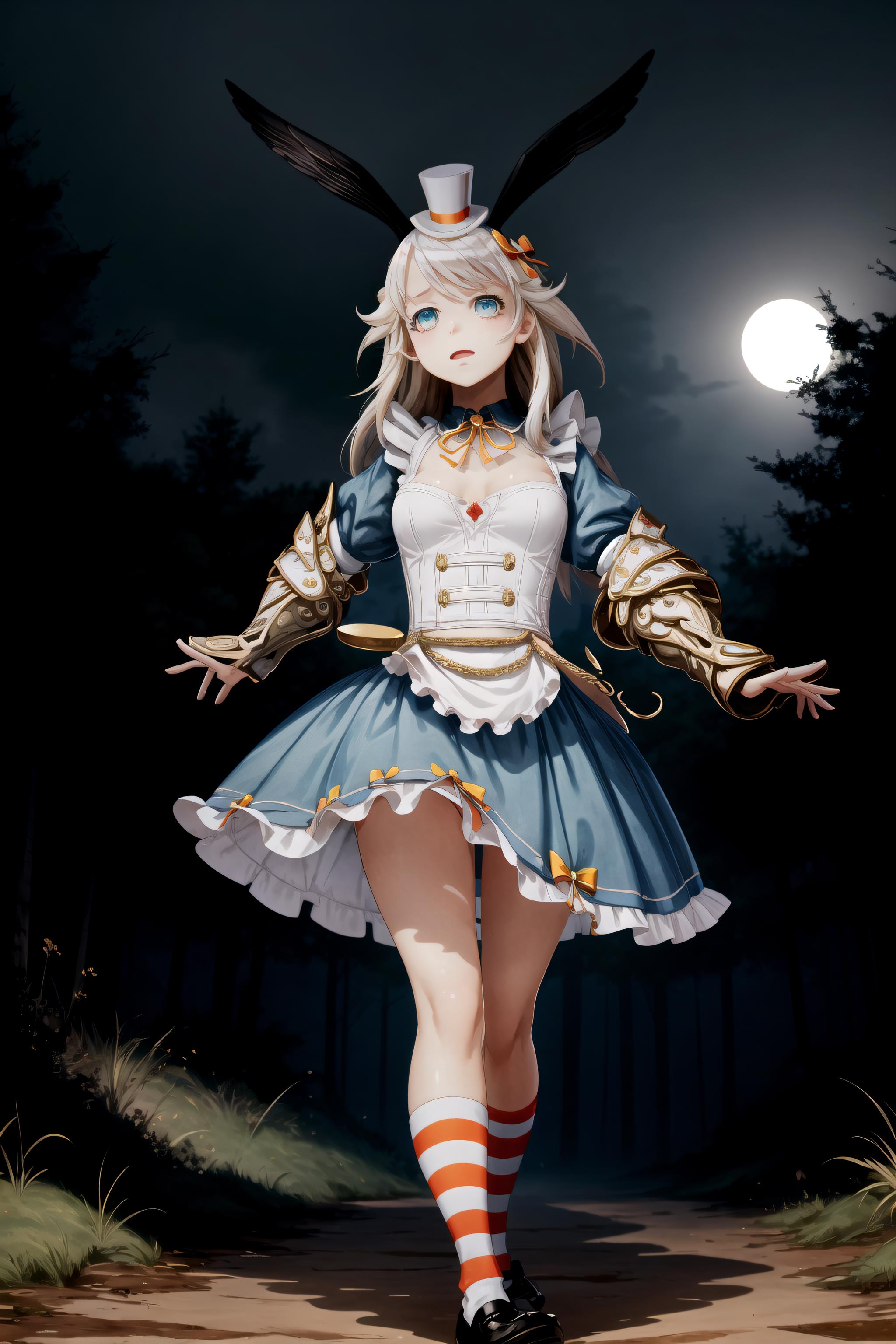 Shining Queen outfit (game) - gabrielalice, golden gauntlets, blue skirt, striped panties, striped socks, mini hat, mary janes