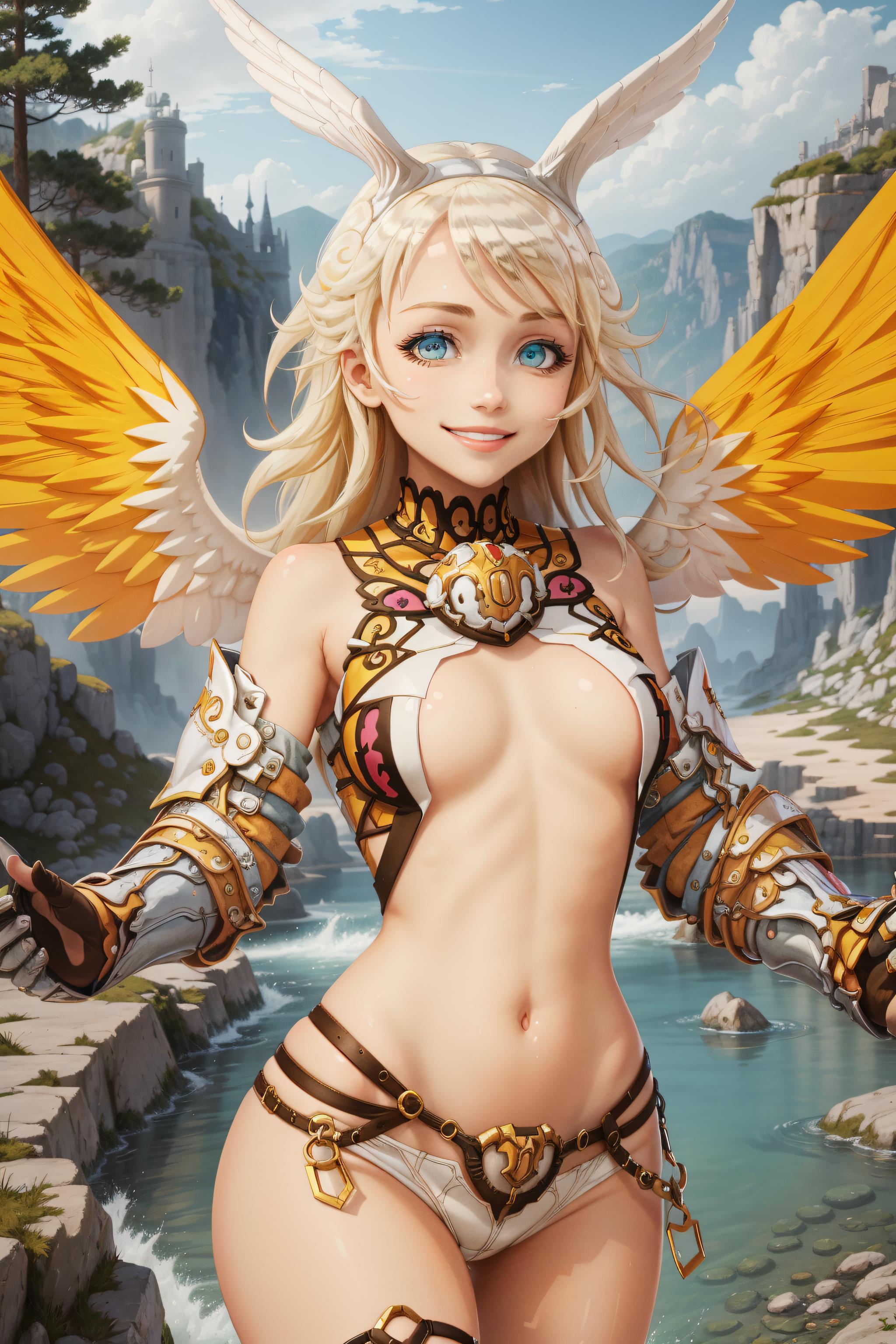 Angel Prefect outfit (game) - gabrielprefect, orange microskirt, underboob, mecha gauntlets, winged boots