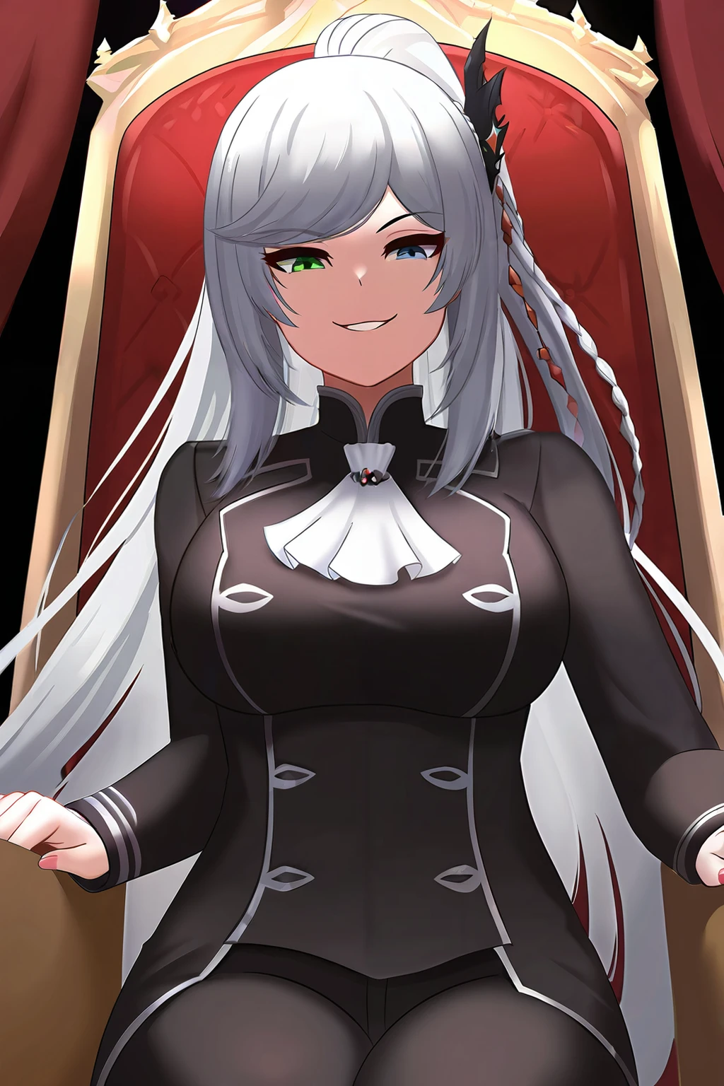 livia_wz, very long hair, grey hair, heterochromia, blue eyes, green eyes, hair ornament, large breasts, white ascot,long sleeves, black jacket, jewelry, black pants