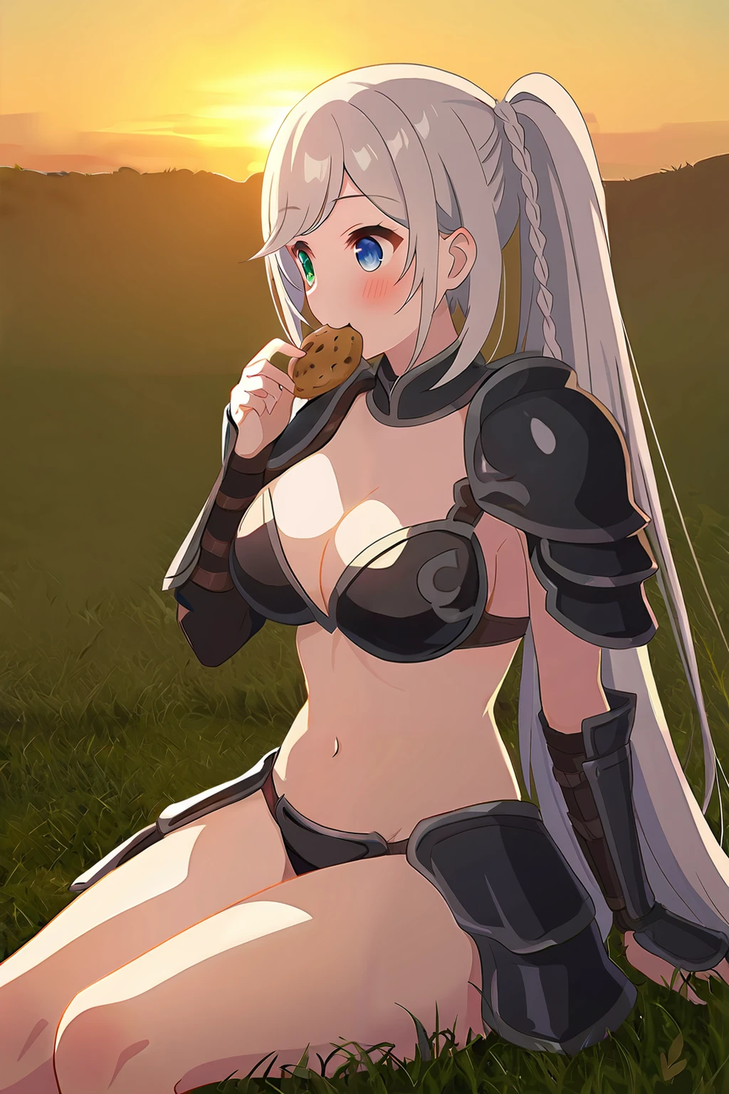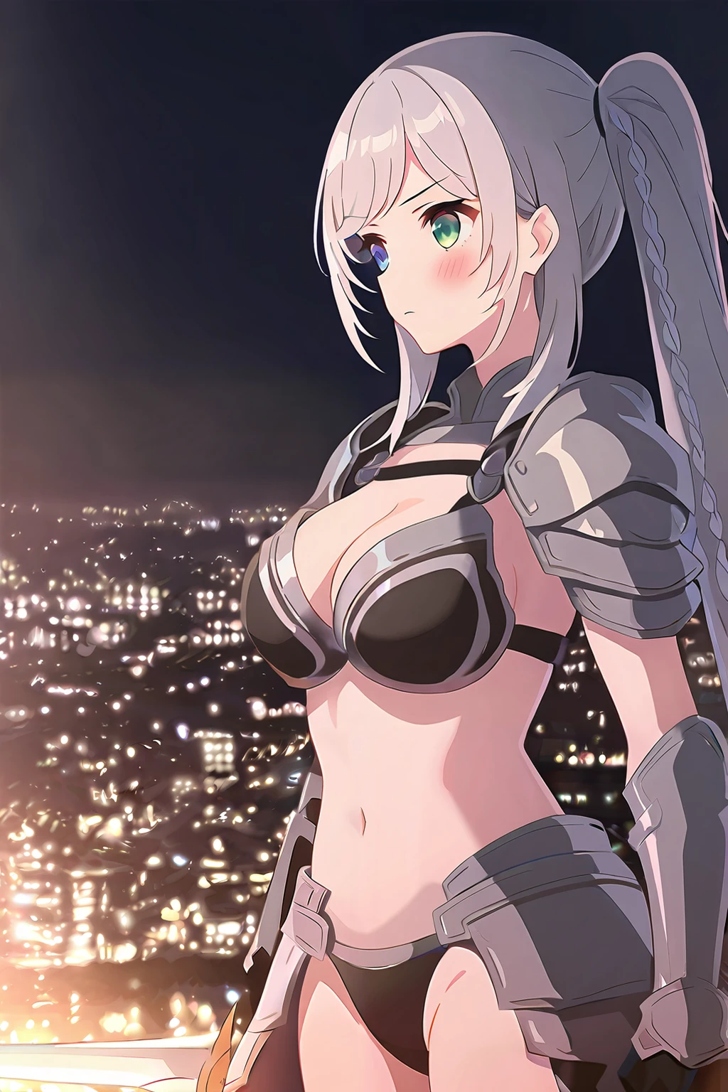 livia_wz, very long hair, side ponytail, grey hair, heterochromia, blue eyes, green eyes, braid, large breasts
