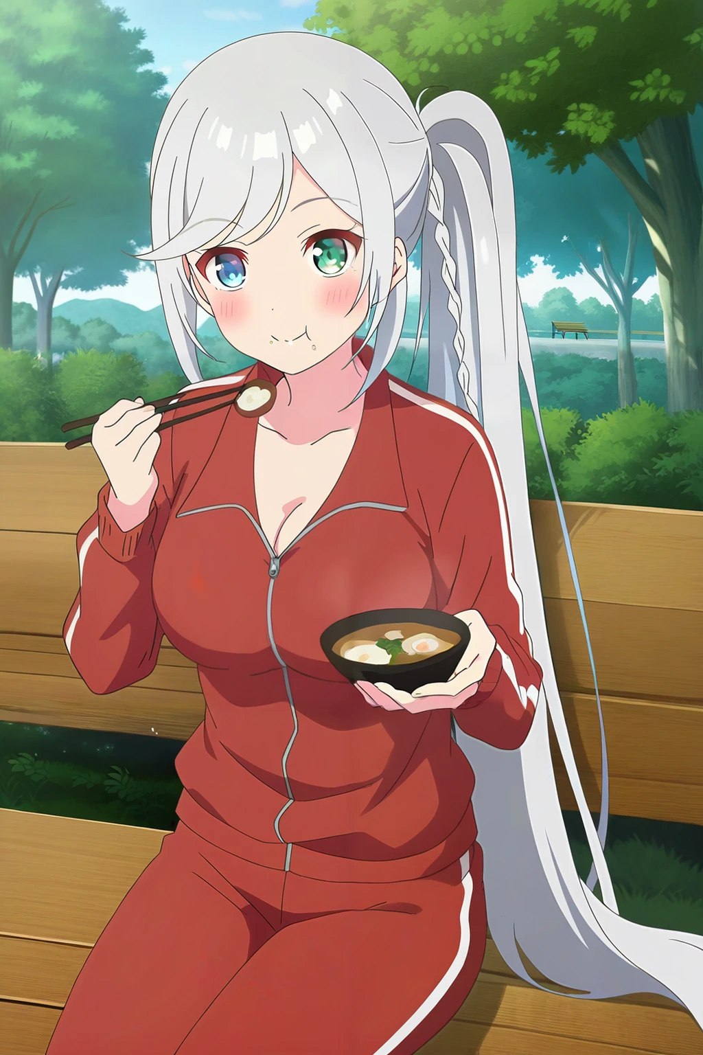 livia_wz, very long hair, side ponytail, grey hair, heterochromia, blue eyes, green eyes, braid, large breasts, red jacket, track jacket, track suit, red pants, track pants, cleavage, long sleeves