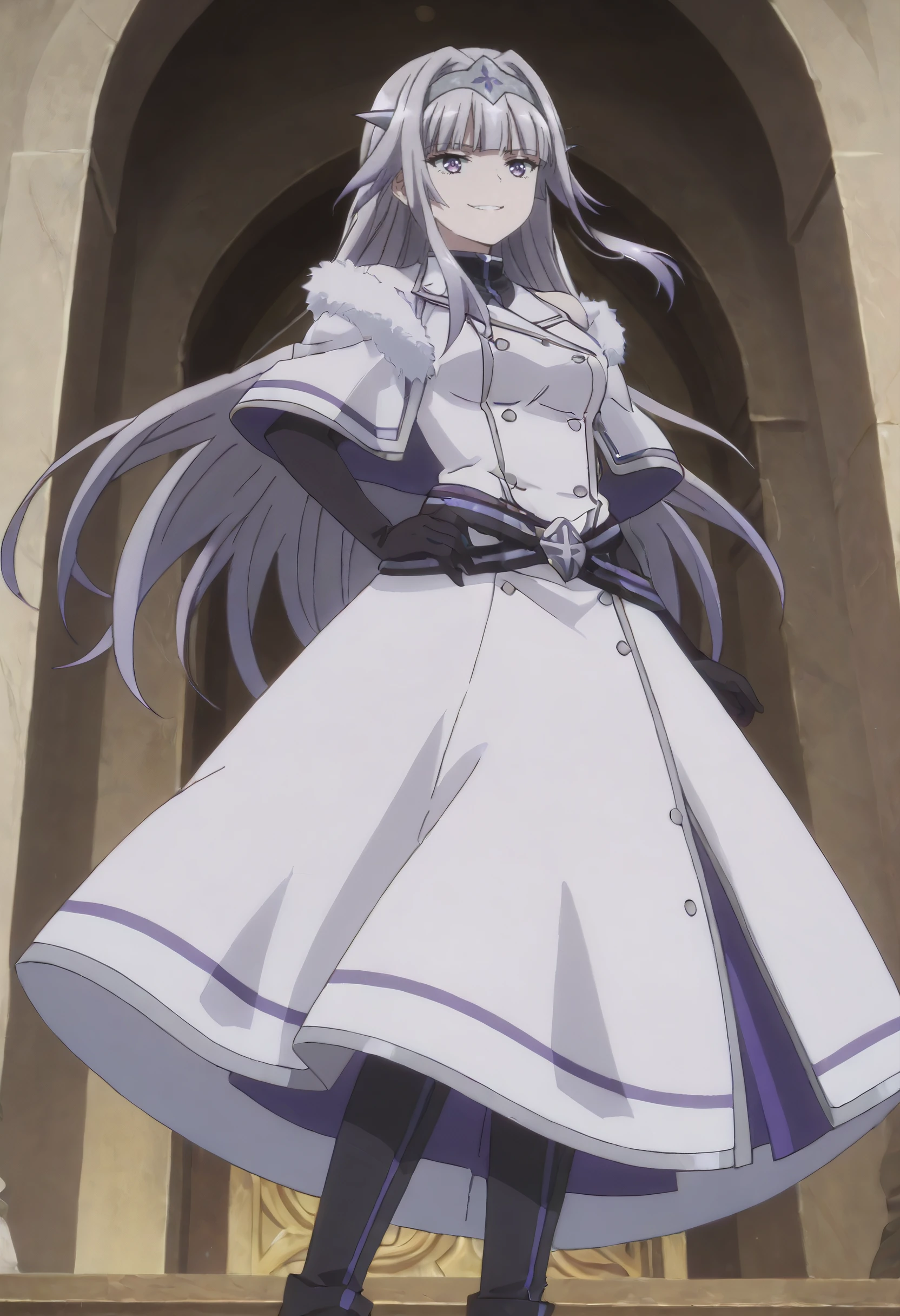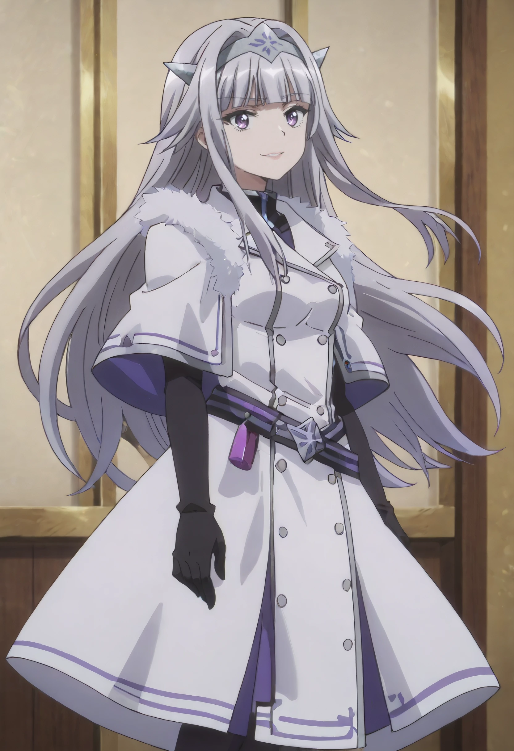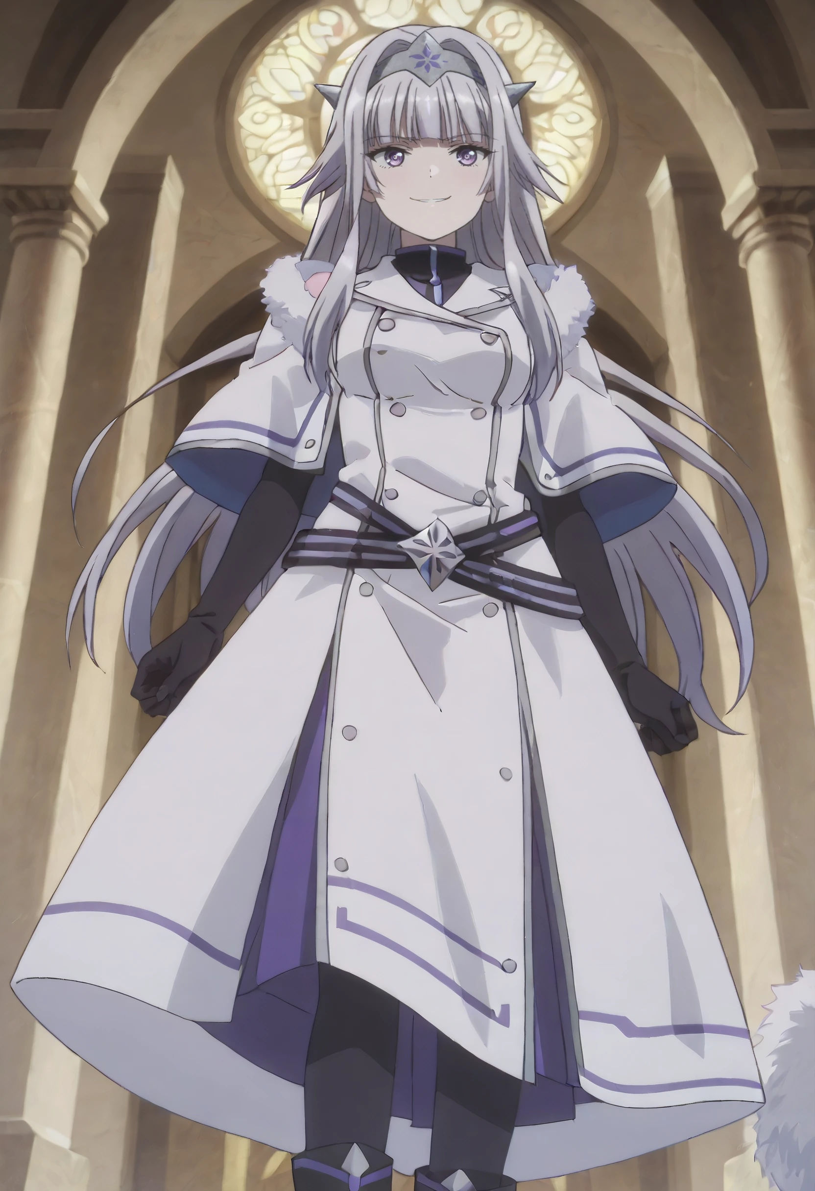 SurlymOutfit, fur trim, coat, hairband, white coat, fur-trimmed coat, black gloves, gloves, capelet, elbow gloves, dress, white capelet, coat dress, double-breasted, fur-trimmed capelet, white dress, white jacket, fatui coat, buttons, jacket, winter coat, black shirt, belt, pantyhose, black pantyhose, boots, black footwear, long dress,