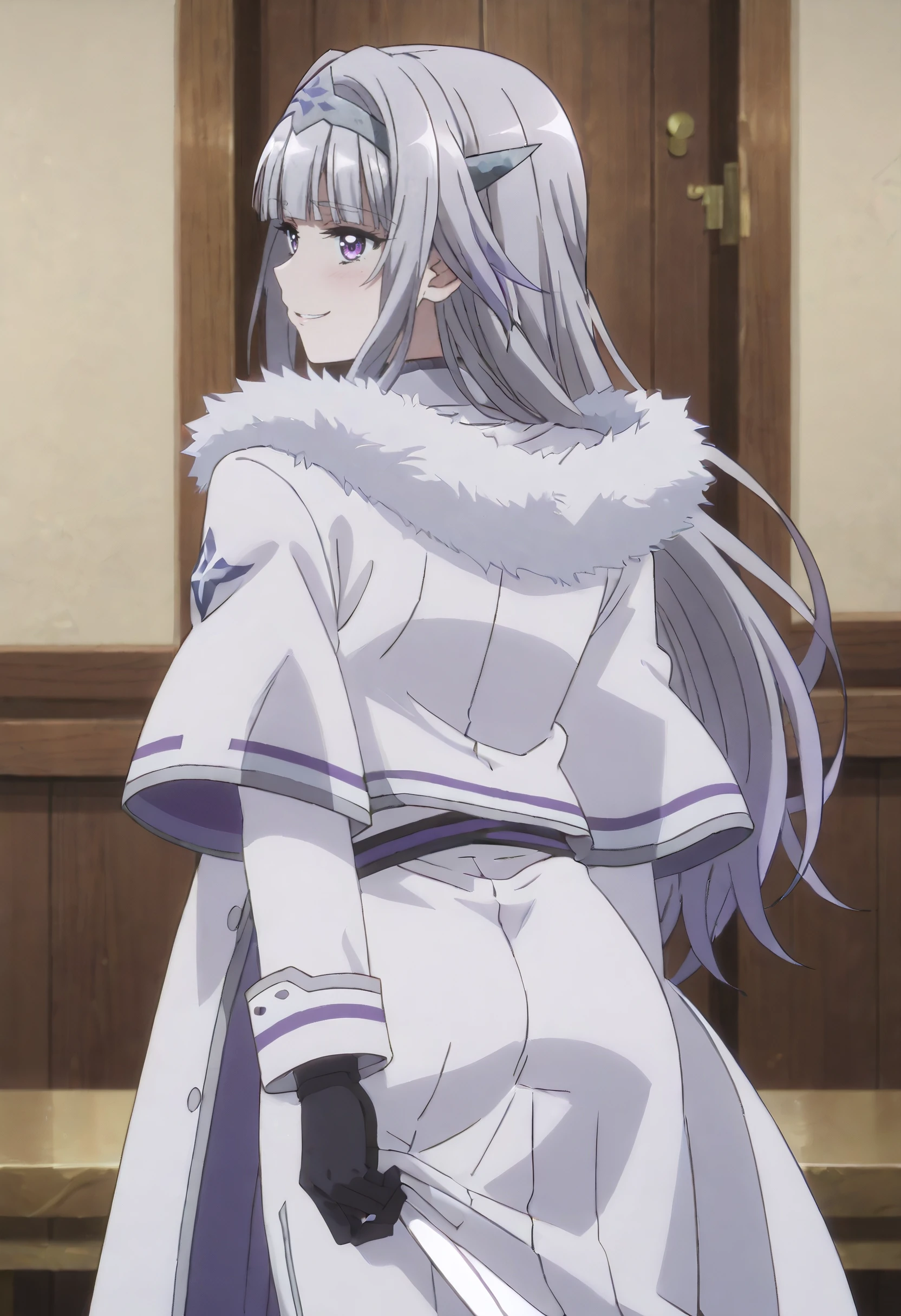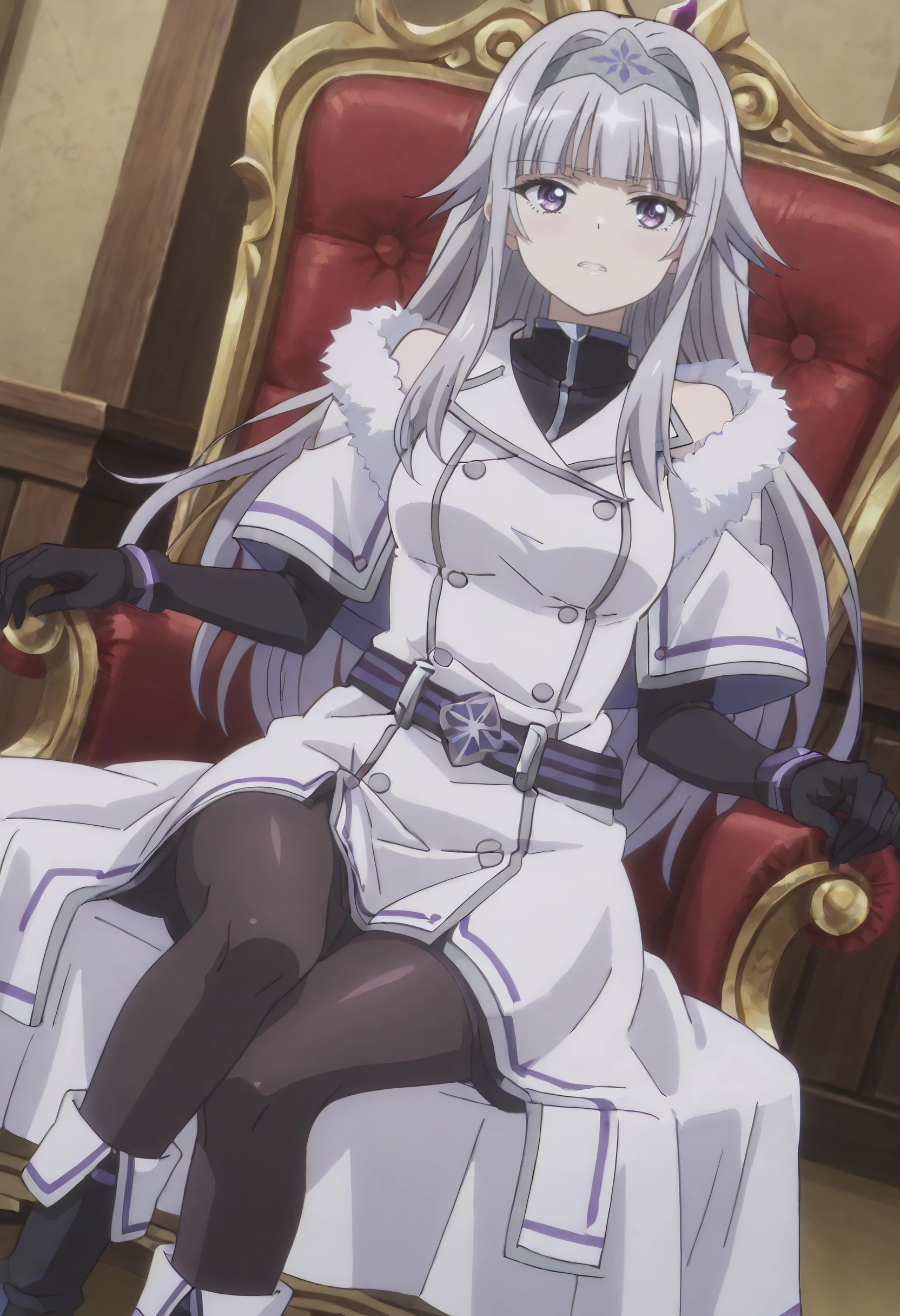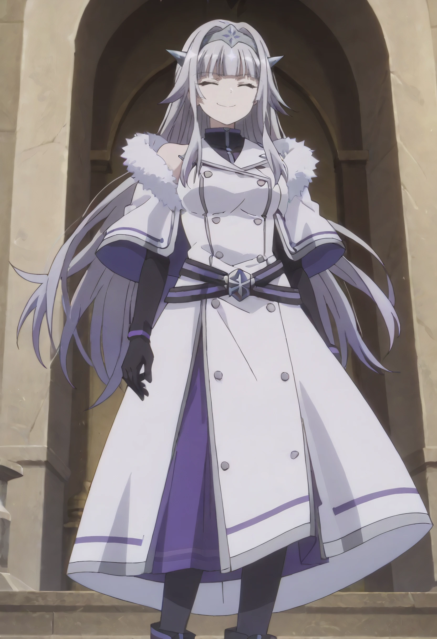 SurlymOutfit, fur trim, coat, hairband, white coat, fur-trimmed coat, black gloves, gloves, capelet, elbow gloves, dress, white capelet, coat dress, double-breasted, fur-trimmed capelet, white dress, white jacket, fatui coat, buttons, jacket, winter coat, black shirt, belt, pantyhose, black pantyhose, boots, black footwear, long dress,