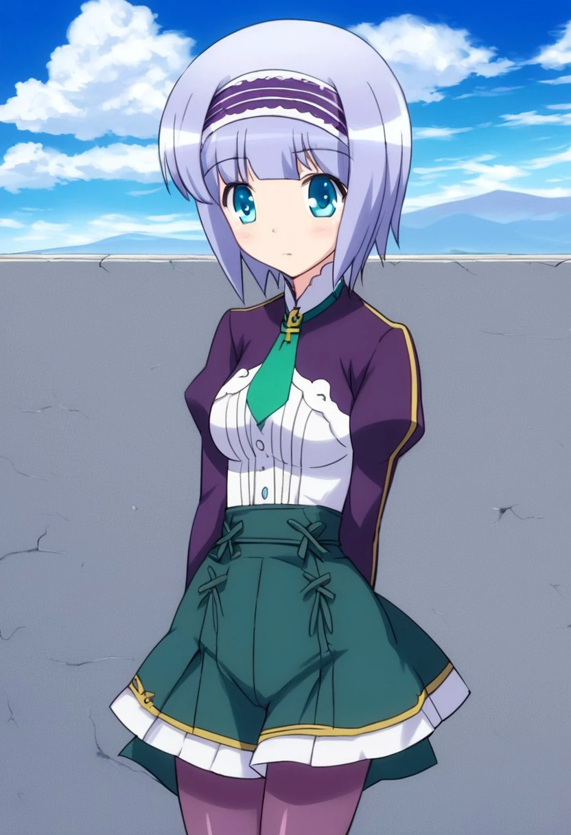 linze silhoueska, short hair, pantyhose, hairband, skirt, 1girl, sky, day, necktie, cloud, purple pantyhose, solo, blue eyes