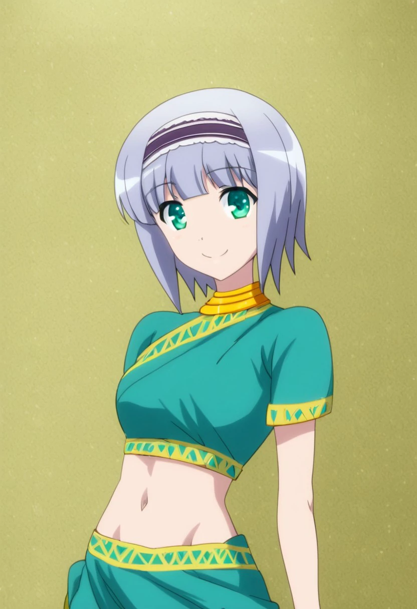 linze silhoueska, 1girl, solo, hairband, short hair, grey hair, smile, midriff, navel, alternate costume, green eyes, looking at viewer, jewelry, green clothes