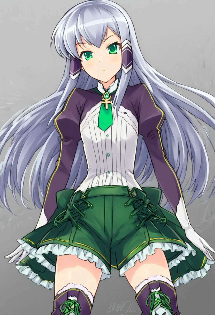 elze silhoueska ,silver hair,long hair, 1girl, solo,hair tubes,green eyes,long sleeves, white shirt, brooch,green necktie, white gloves, green skirt,frilled skirt, thighhighs,cross-laced footwear, knee boots