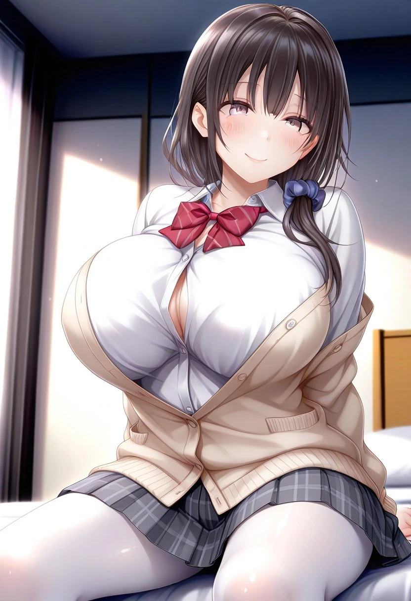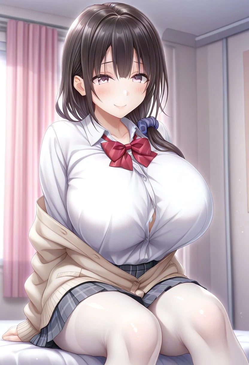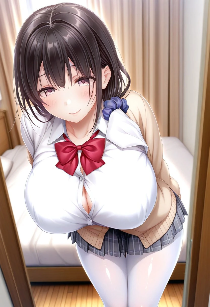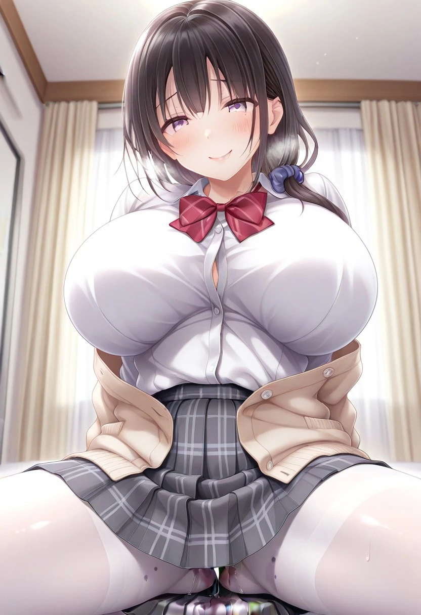 Recommend Prompt:Ikue Kogure, purple eyes, black hair, long hair, low sidetail, hair scrunchie, bangs,