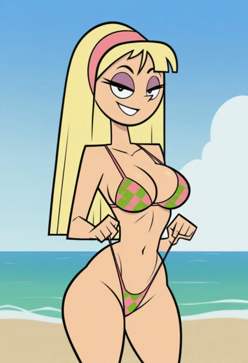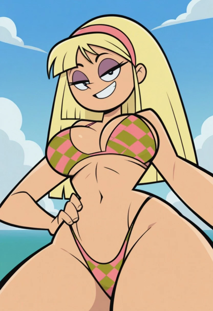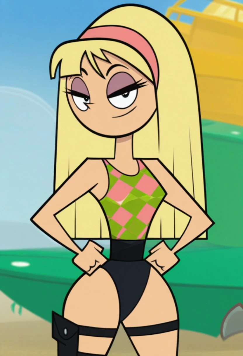 k3nd4ll, blonde hair, long hair, pink hairband, eyeshadow, tank top, checkered clothes, highleg leotard, black leotard, holster, thigh strap, high heel boots
