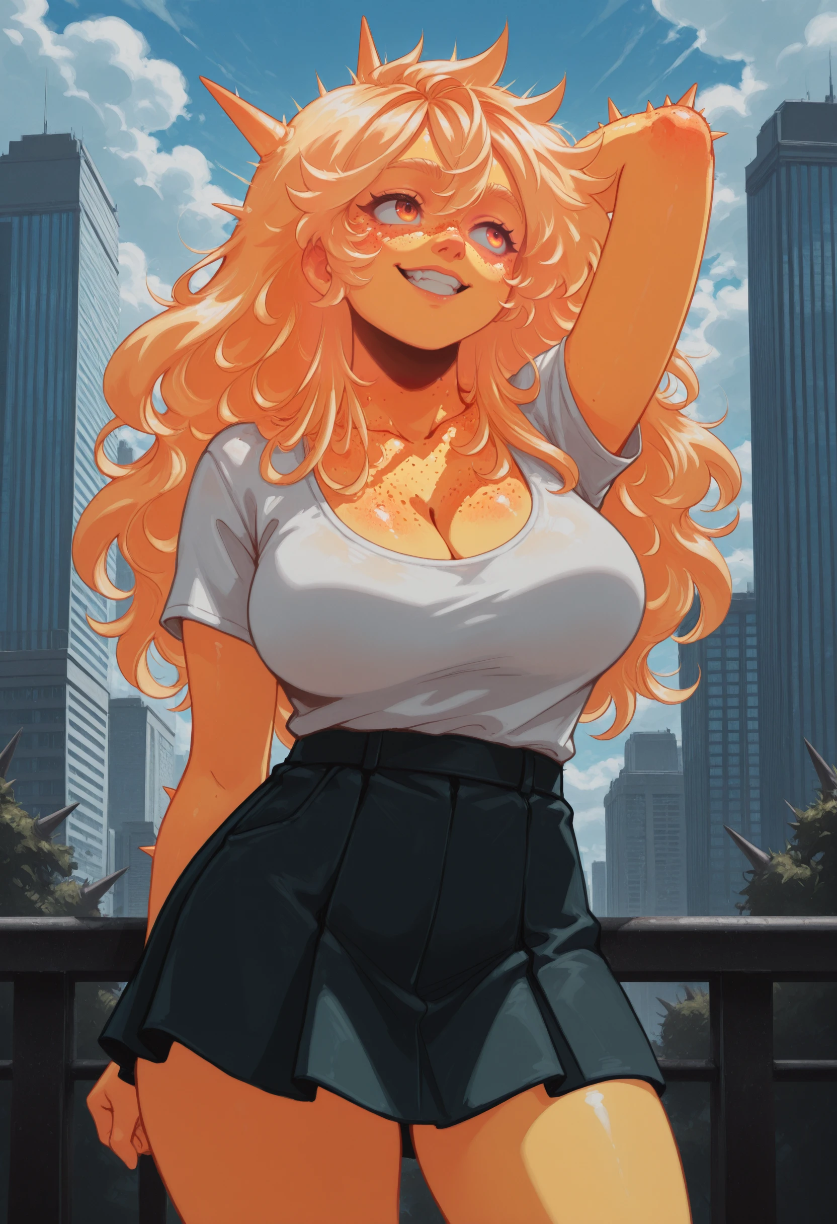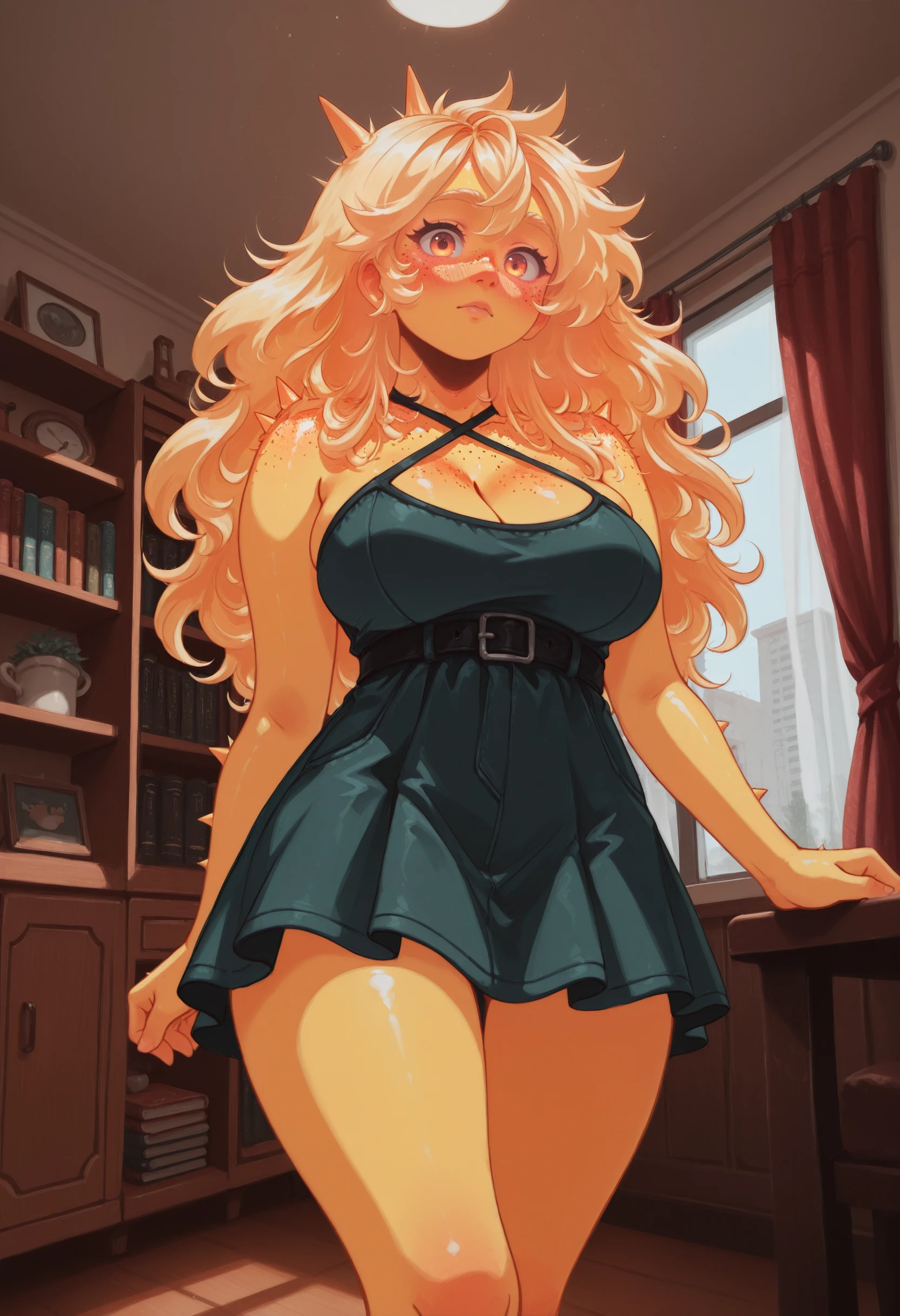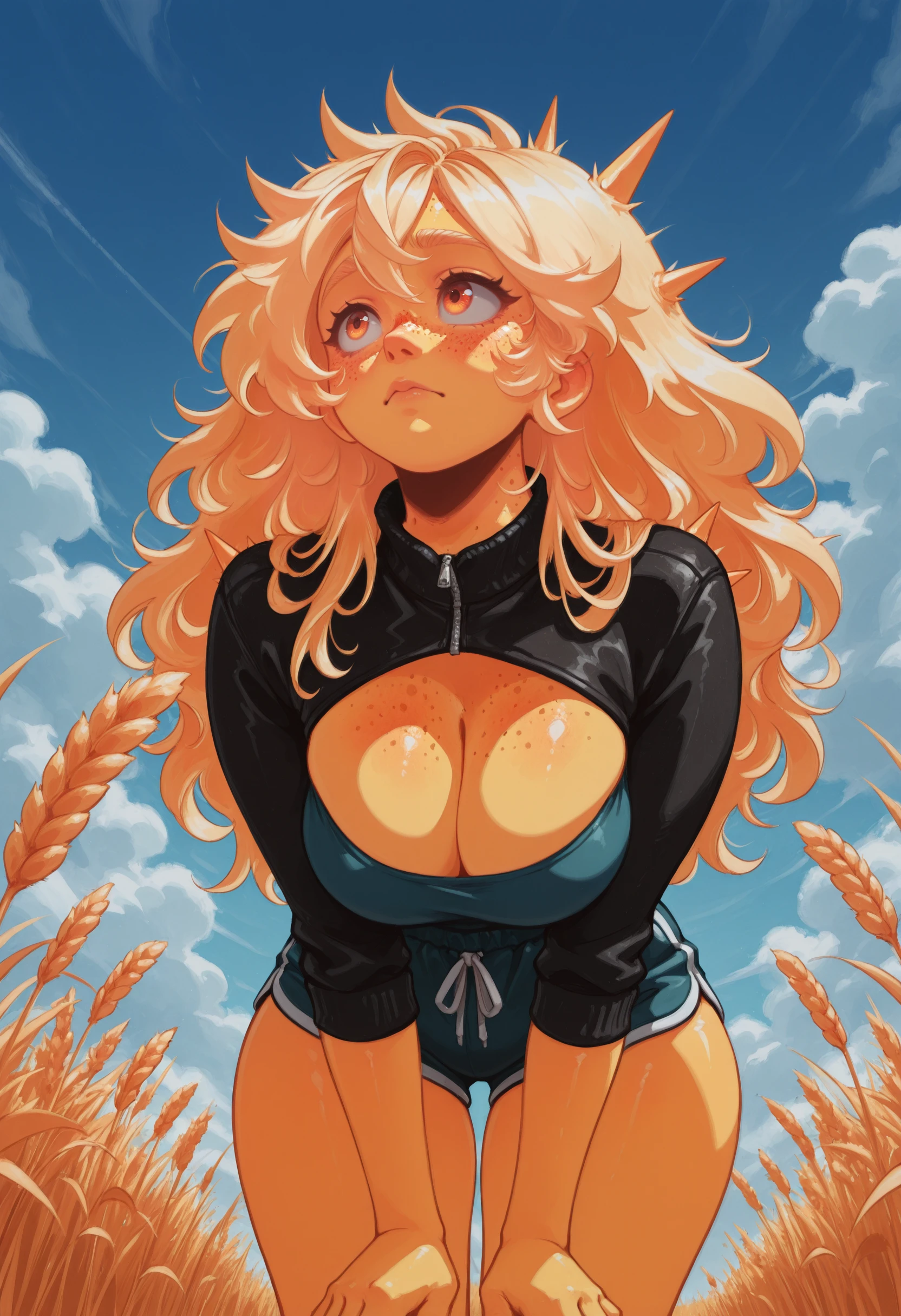(Positive Prompts) lynsunchan, personification, colored skin, yellow skin, glowing skin, body freckles, freckles, orange eyes, blonde hair, long hair, big hair, spiked hair, large breasts,