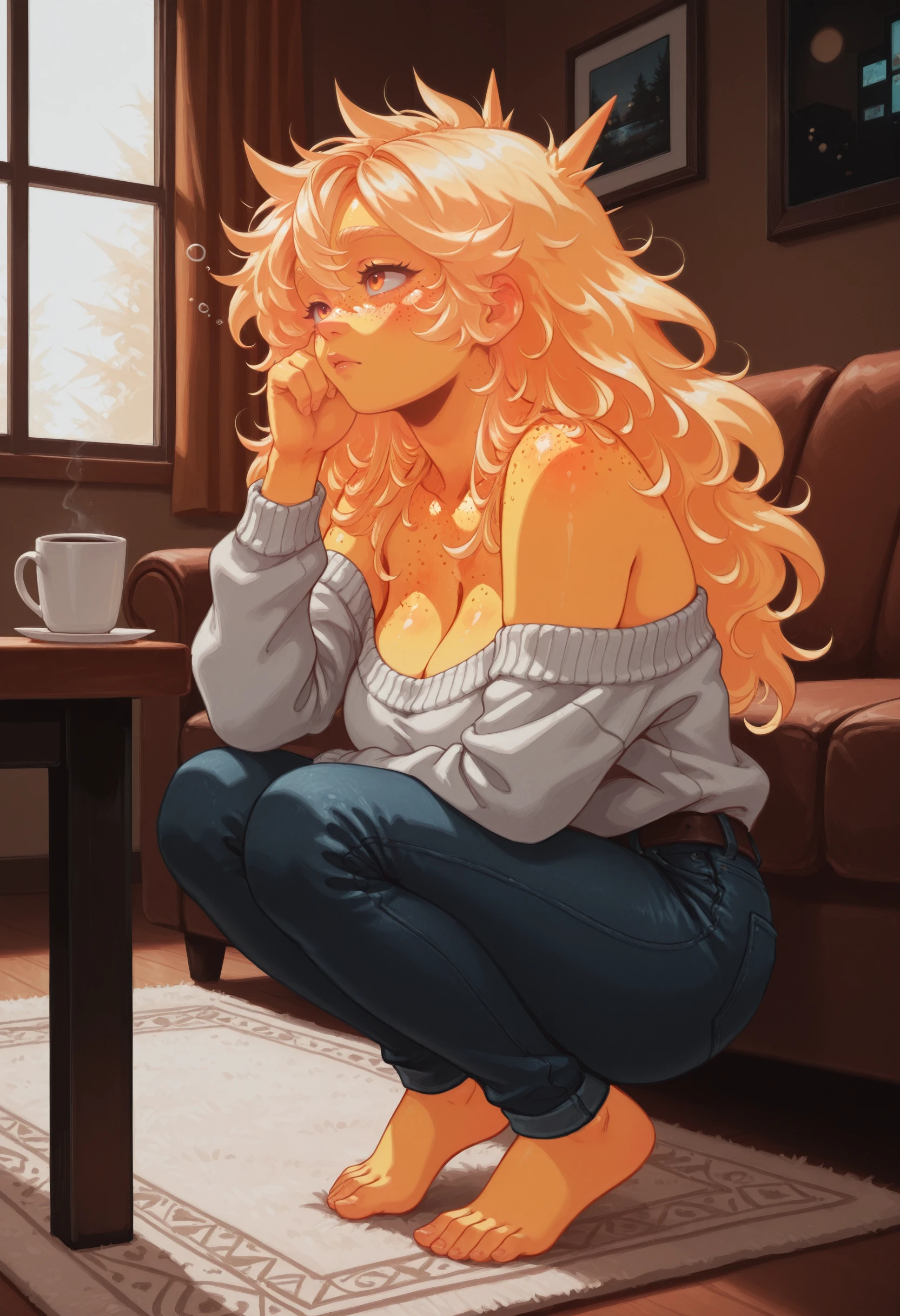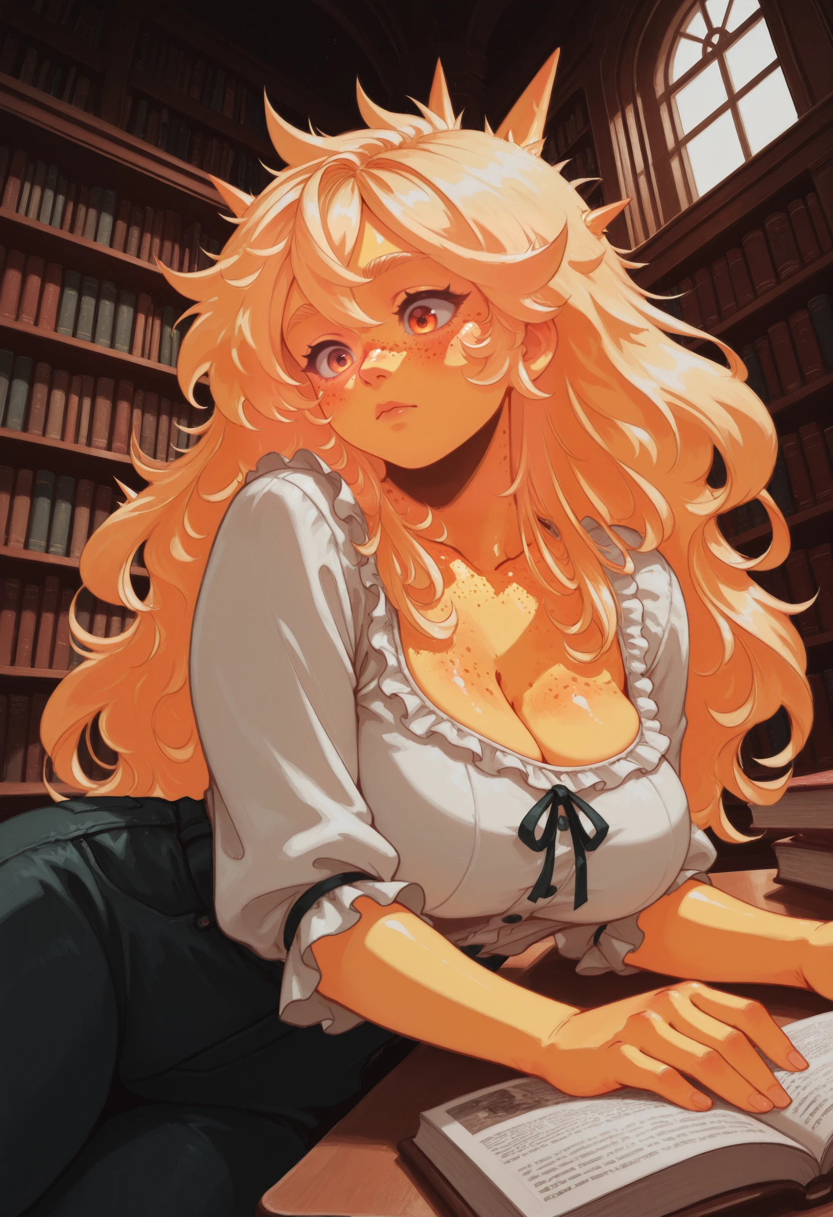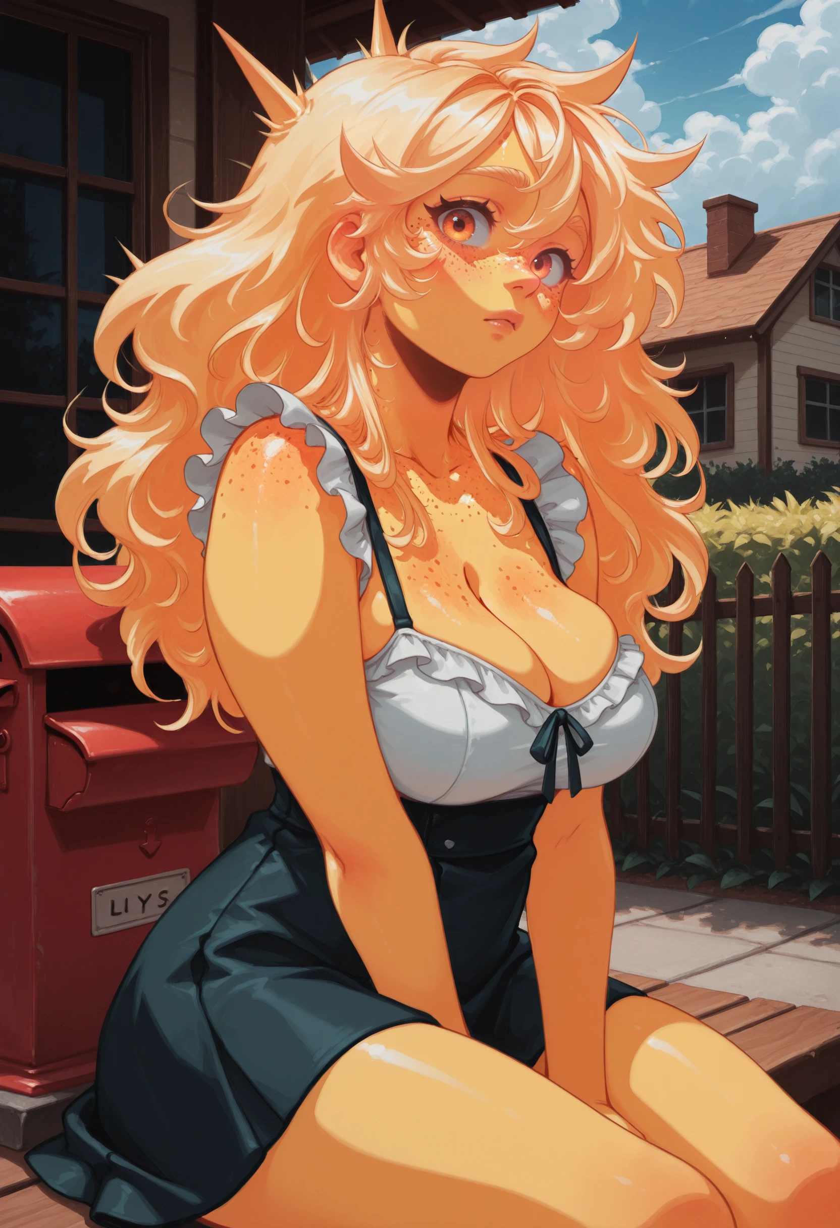 (Positive Prompts) lynsunchan, personification, colored skin, yellow skin, glowing skin, body freckles, freckles, orange eyes, blonde hair, long hair, big hair, spiked hair, large breasts,