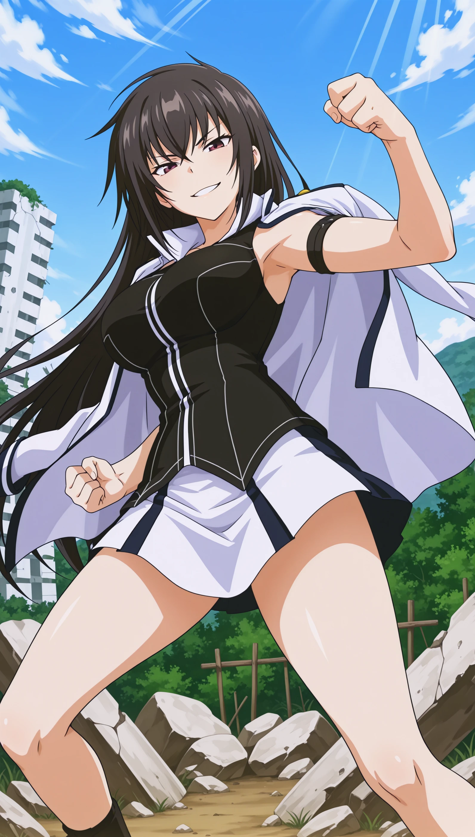 Trigger Words Optionnal: jacket, miniskirt, uniform, black footwear, sleeveless shirt, black shirt, jacket on shoulders, ankle boots