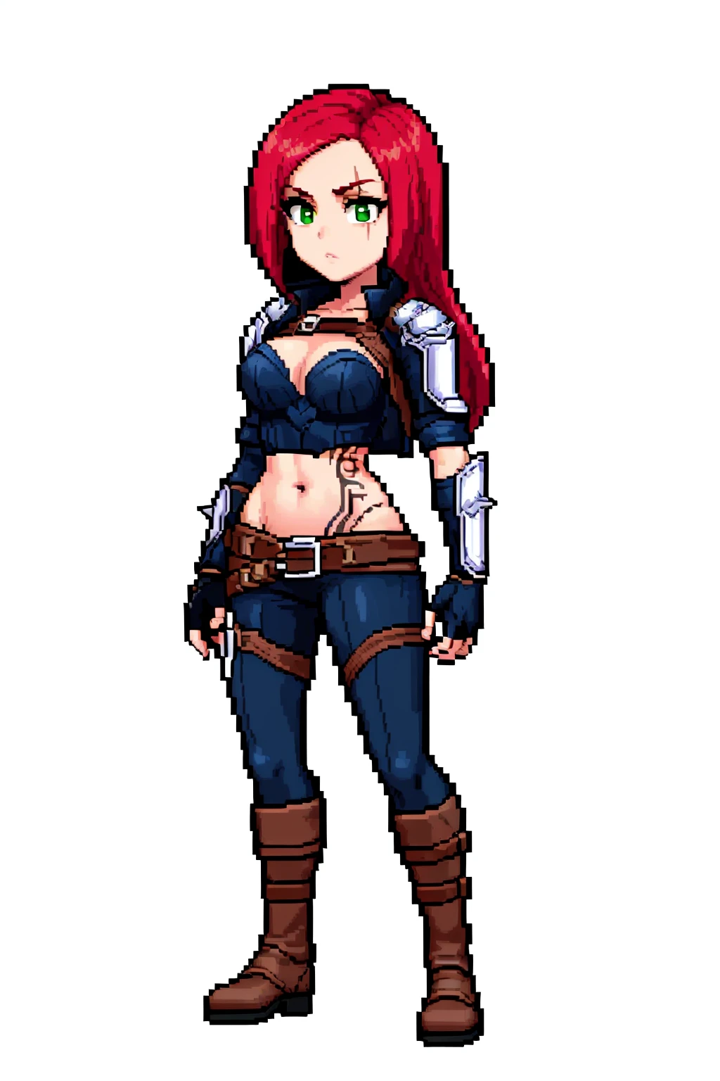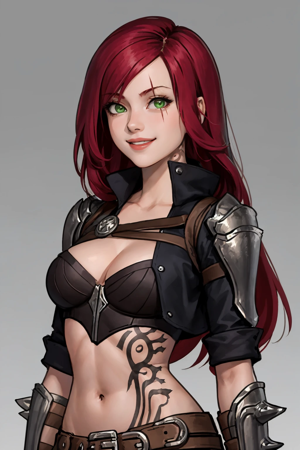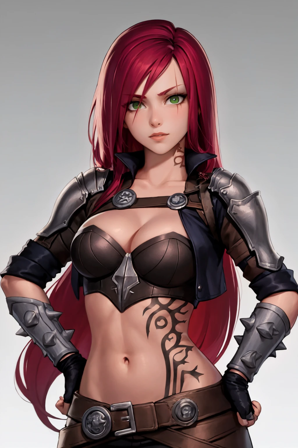 Outfit prompts : cropped jacket, armor, belt, black pants, cleavage, fingerless gloves, midriff, navel, tattoo, boots