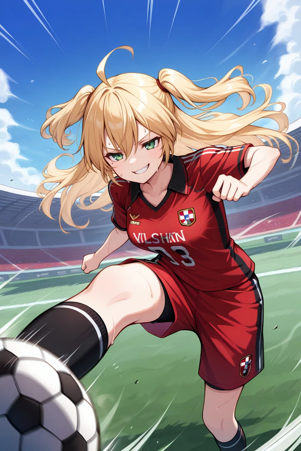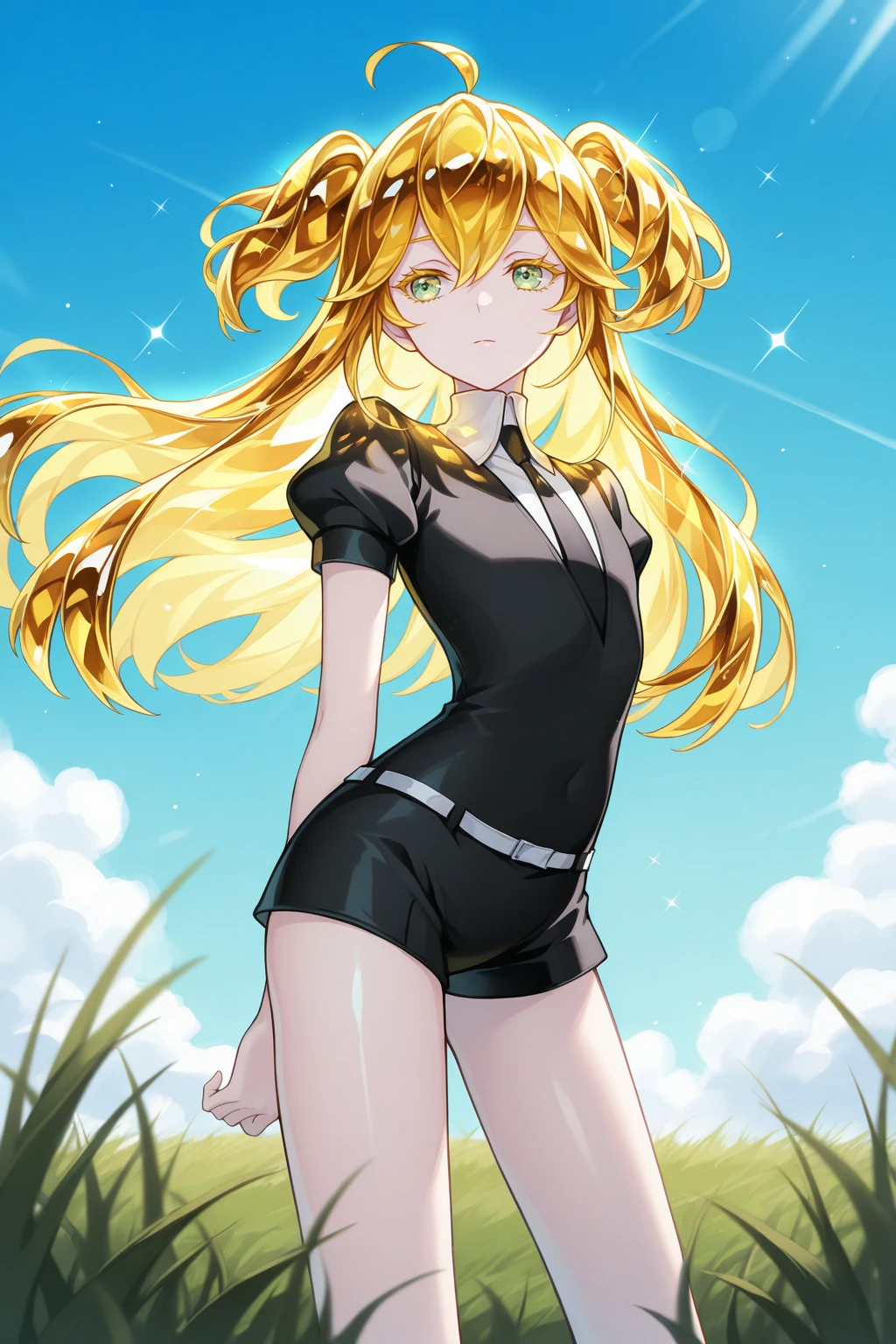 Appearance : h1pp3r, blonde hair, long hair, ahoge, hair between eyes, green eyes, two side up