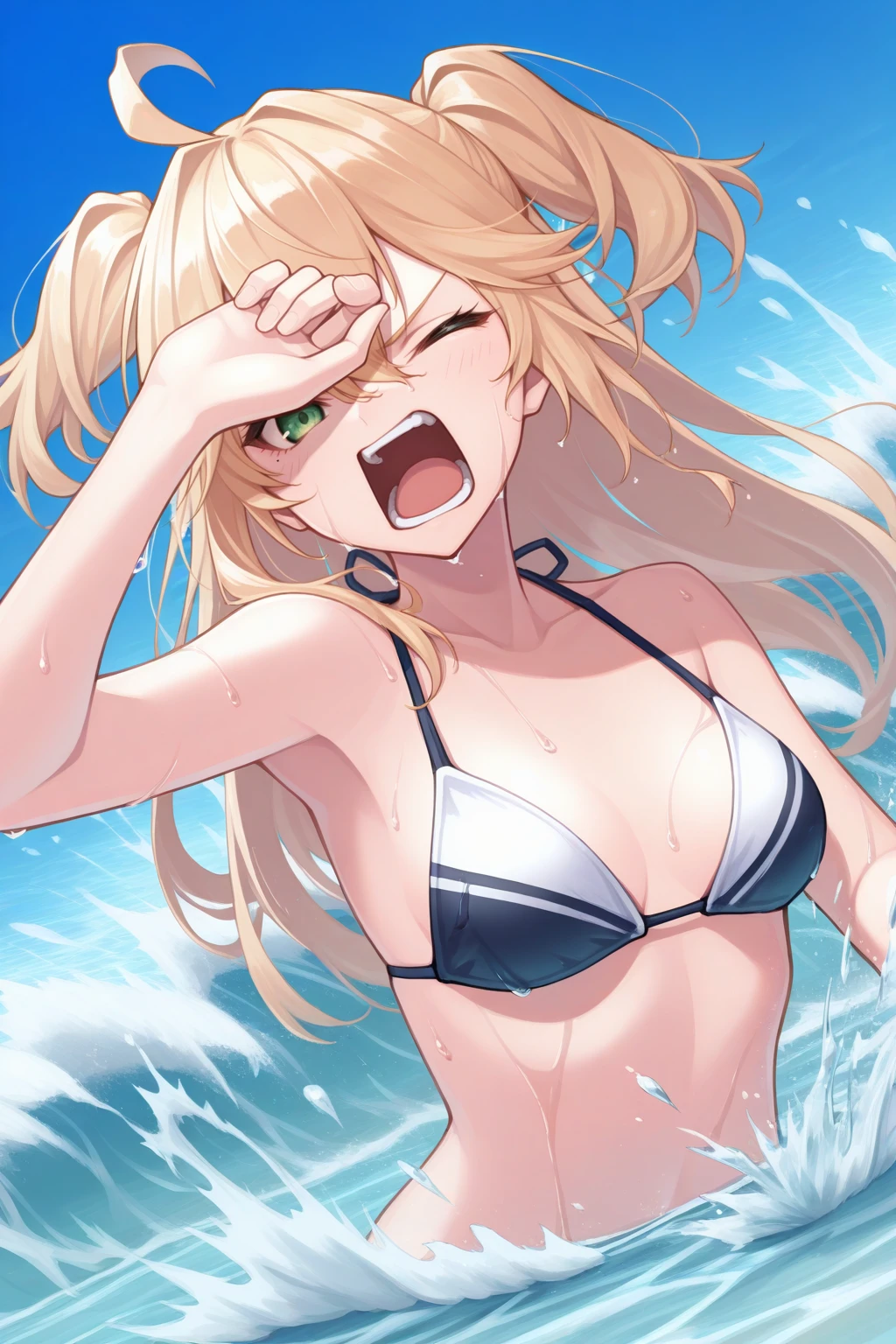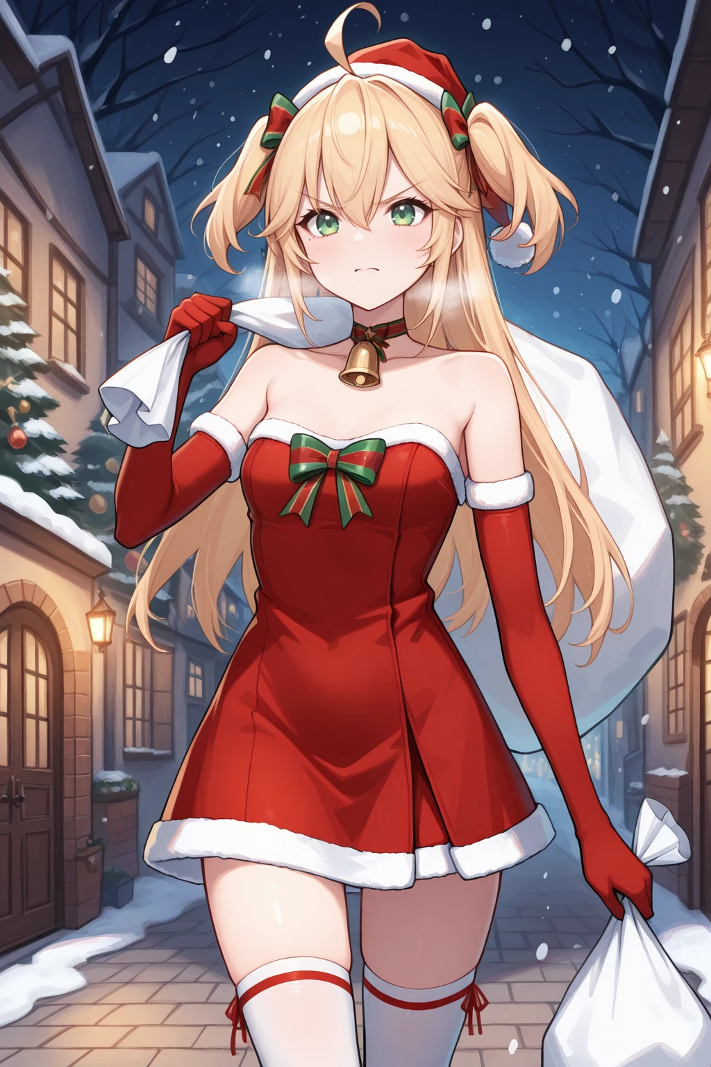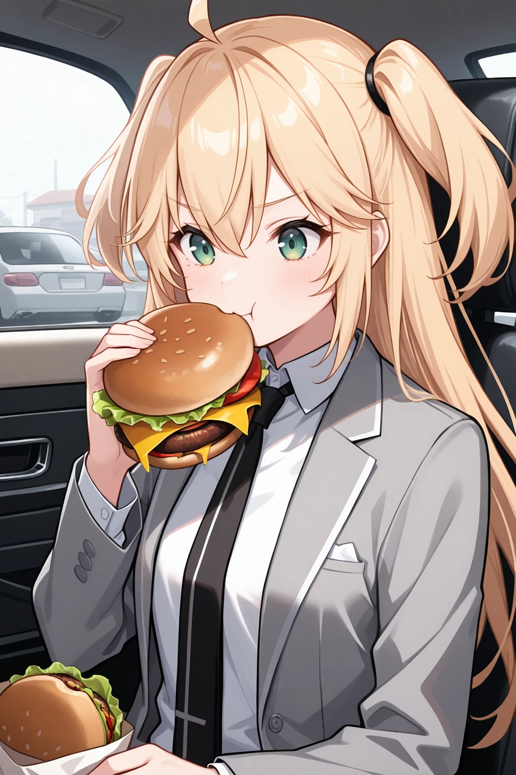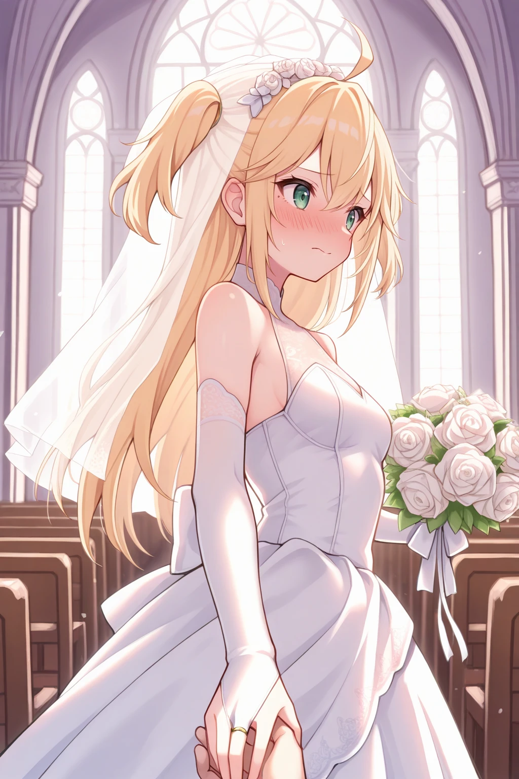 h1pp3r, blonde hair, long hair, ahoge, hair between eyes, green eyes, two side up