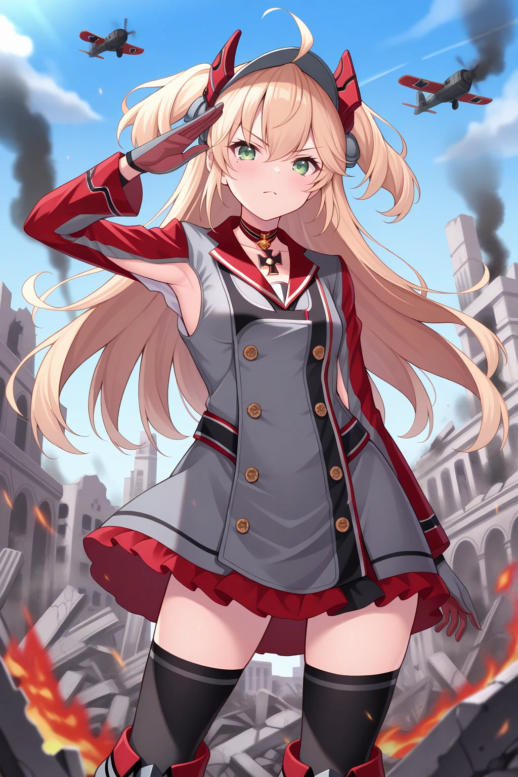 Outfit 1 : visor cap, headgear, cross choker, iron cross, multicolored dress, collared dress, grey dress, red dress, black dress, double-breasted, buttons, armpit cutout, sleeves rolled up, two-tone gloves, red gloves, grey gloves, black thighhighs, knee boots