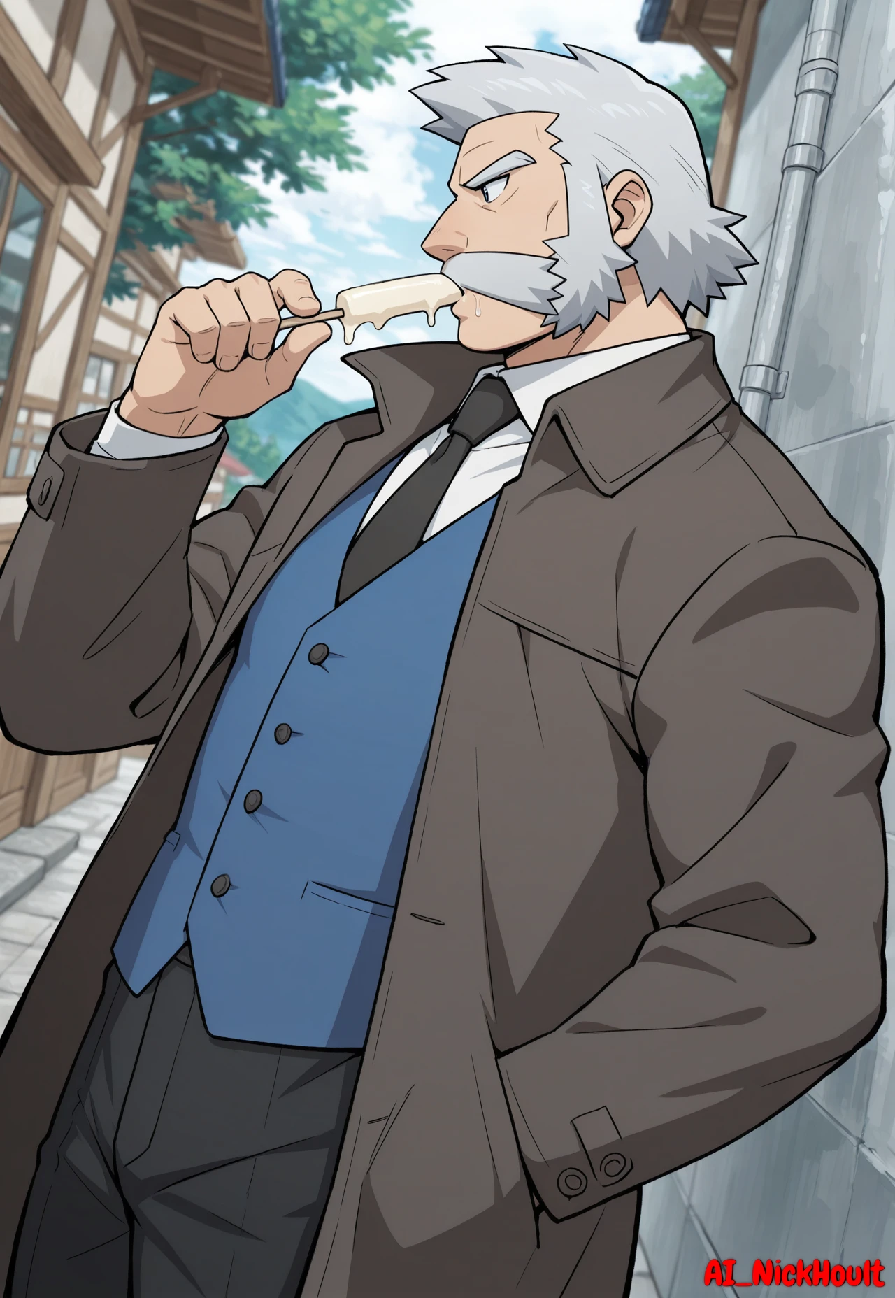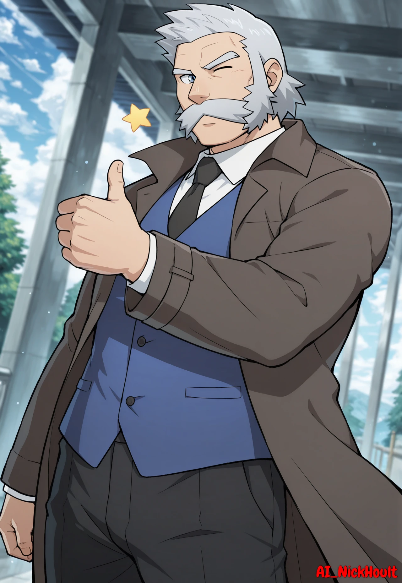 Rowan, old man, short gray hair, ((thick gray mustache, prominent sideburns)), blue eyes, ((no goatee, no beard)),