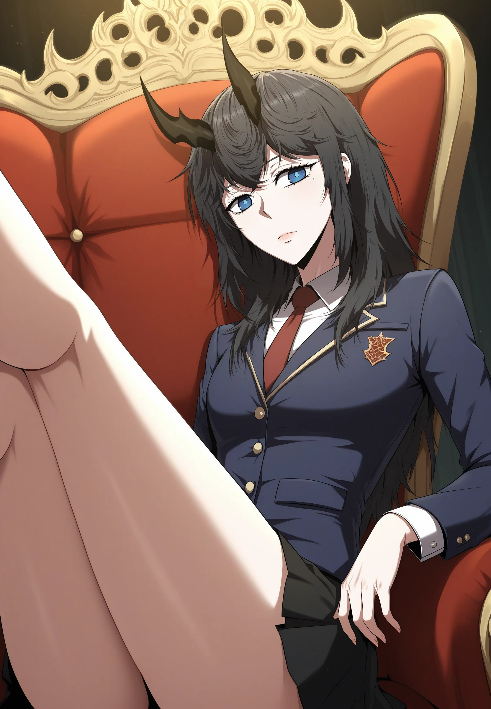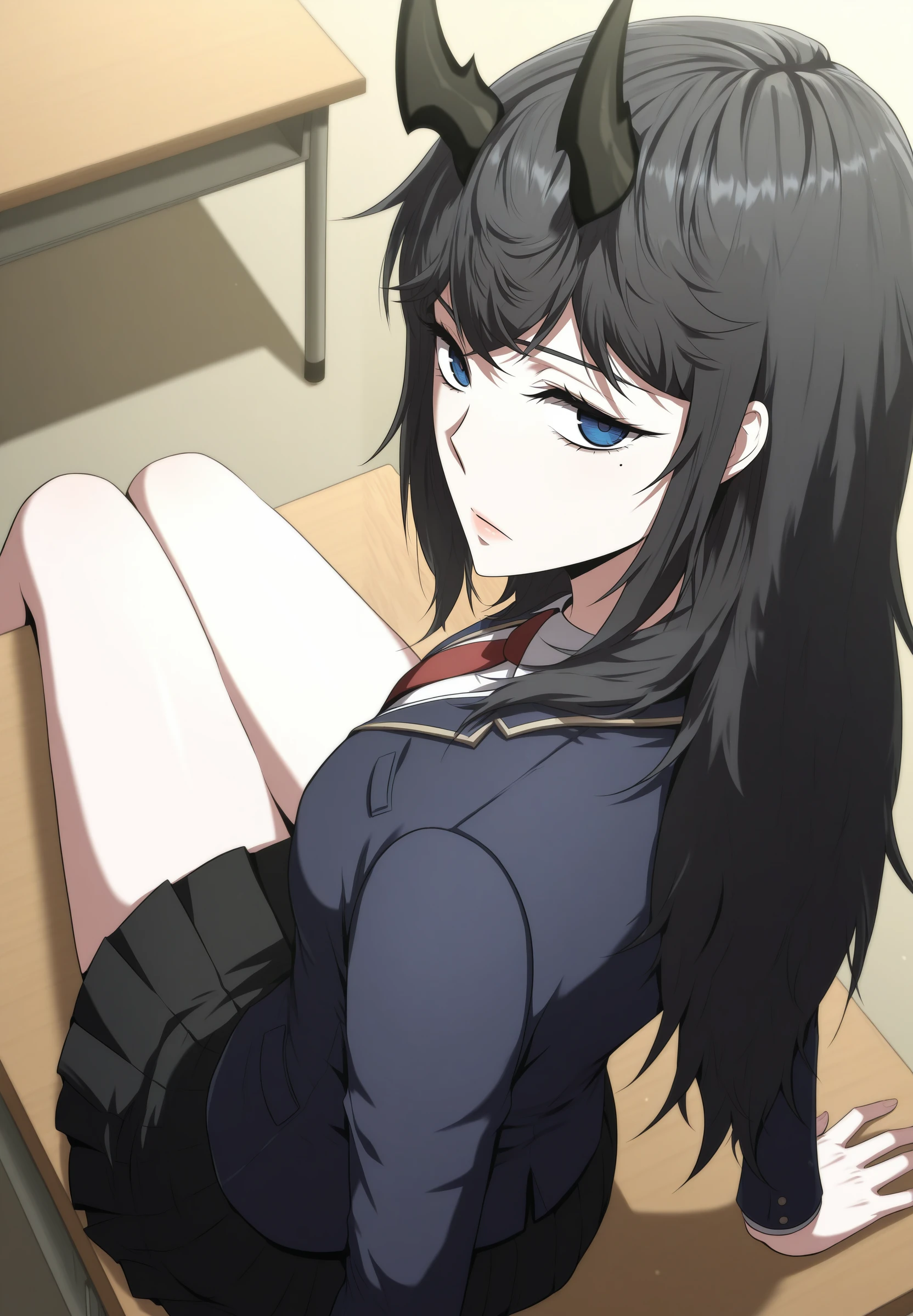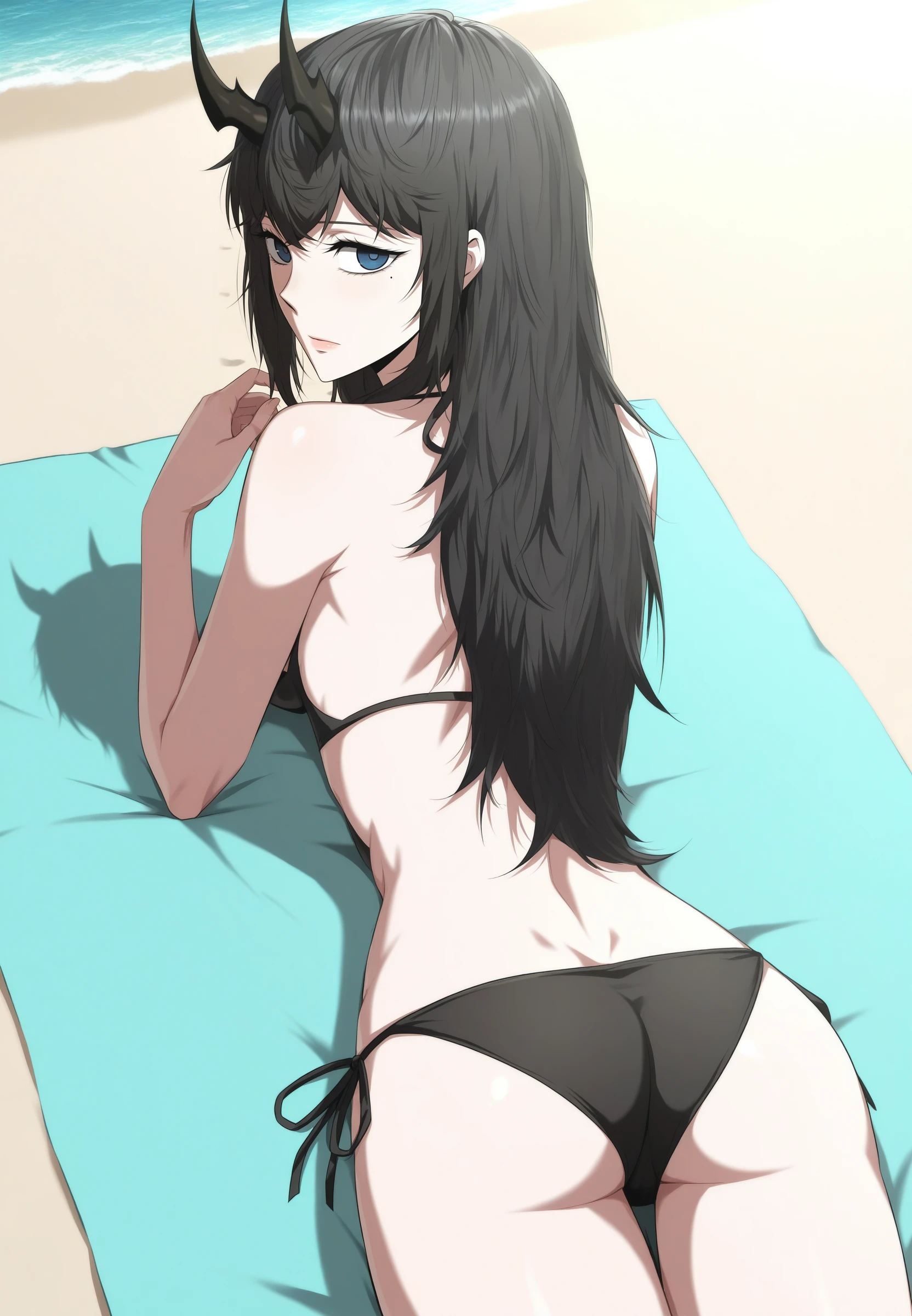 reneebares, 1girl, long hair, horns, blue eyes, black hair, mole under eye