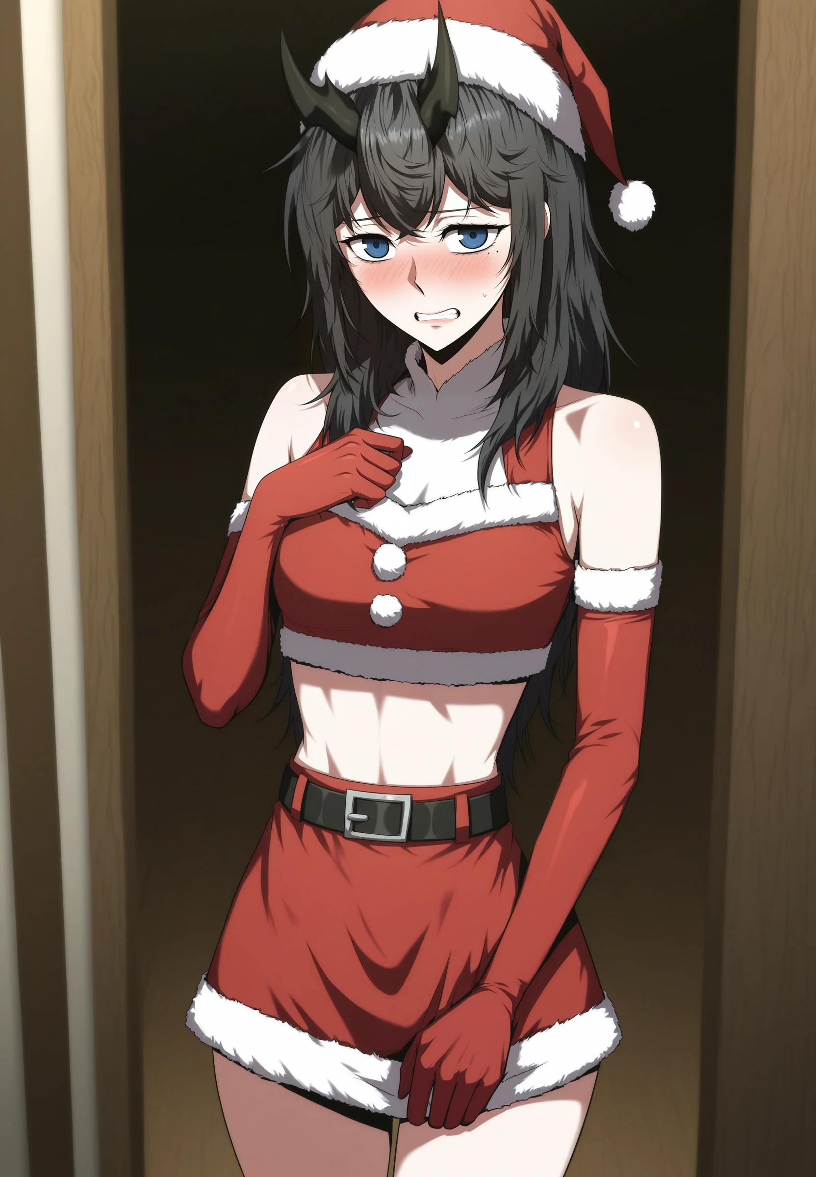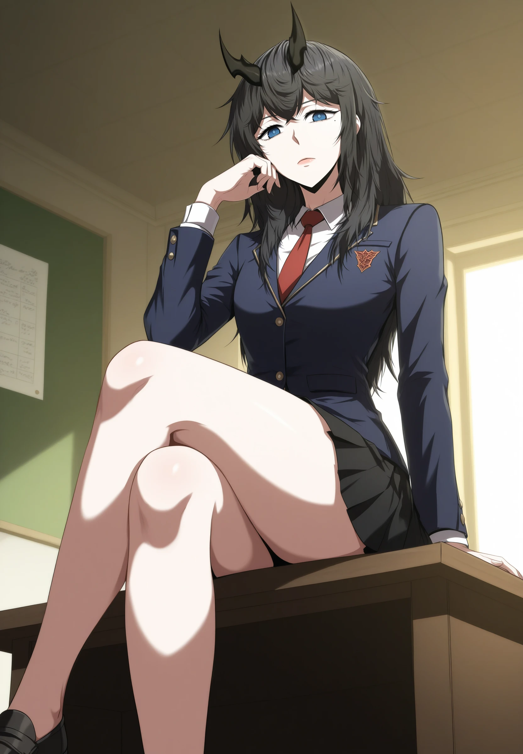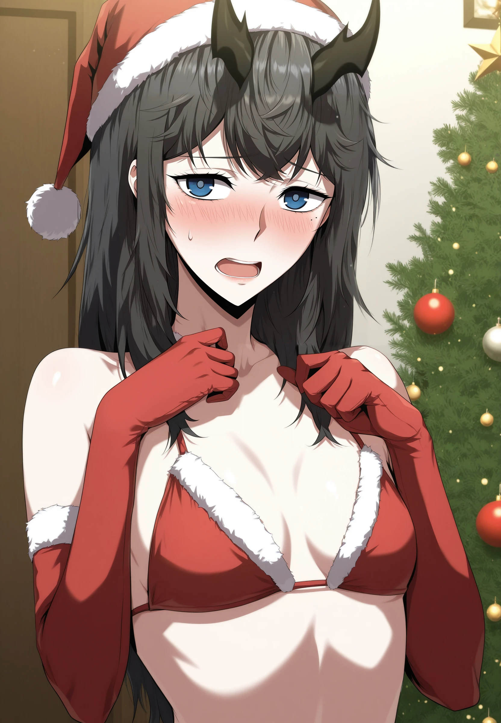 reneebares, 1girl, long hair, horns, blue eyes, black hair, mole under eye