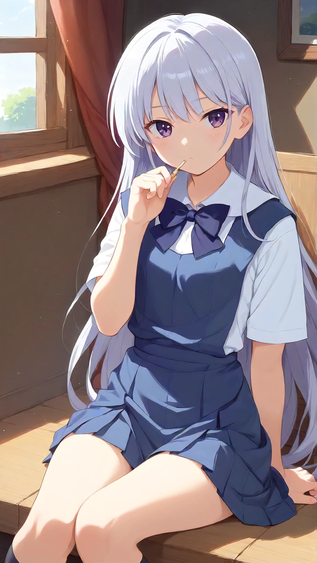 kazami_kazuki, an anime girl, 1girl, solo, long hair, white hair, purple eyes, looking at viewer, skirt, bow, sitting, school uniform, socks