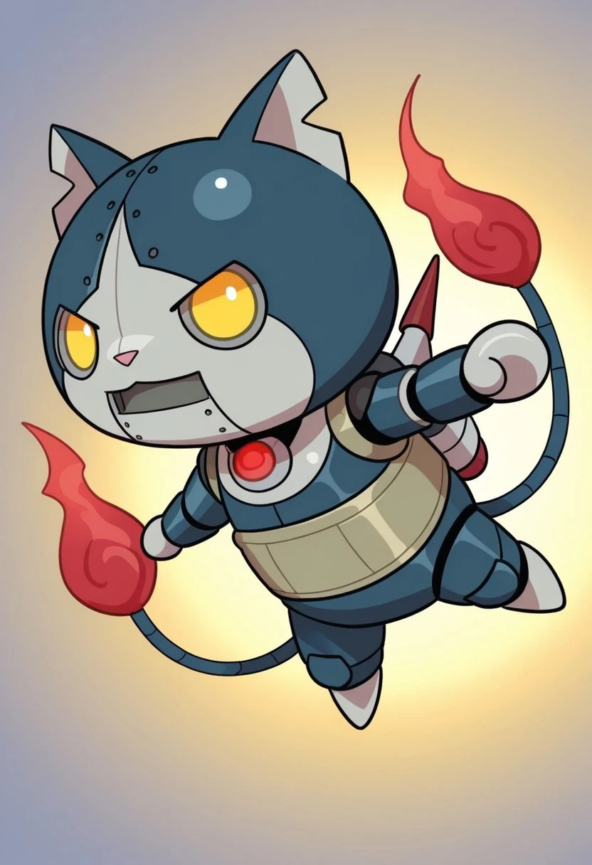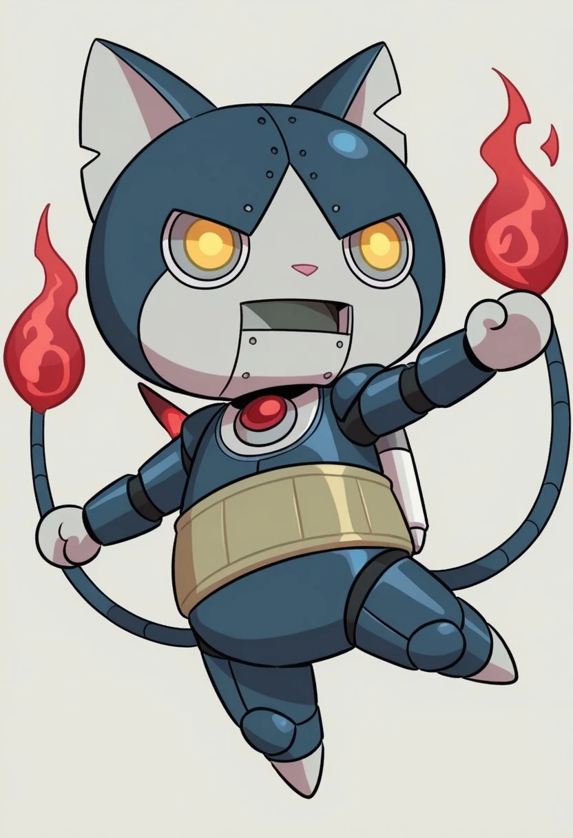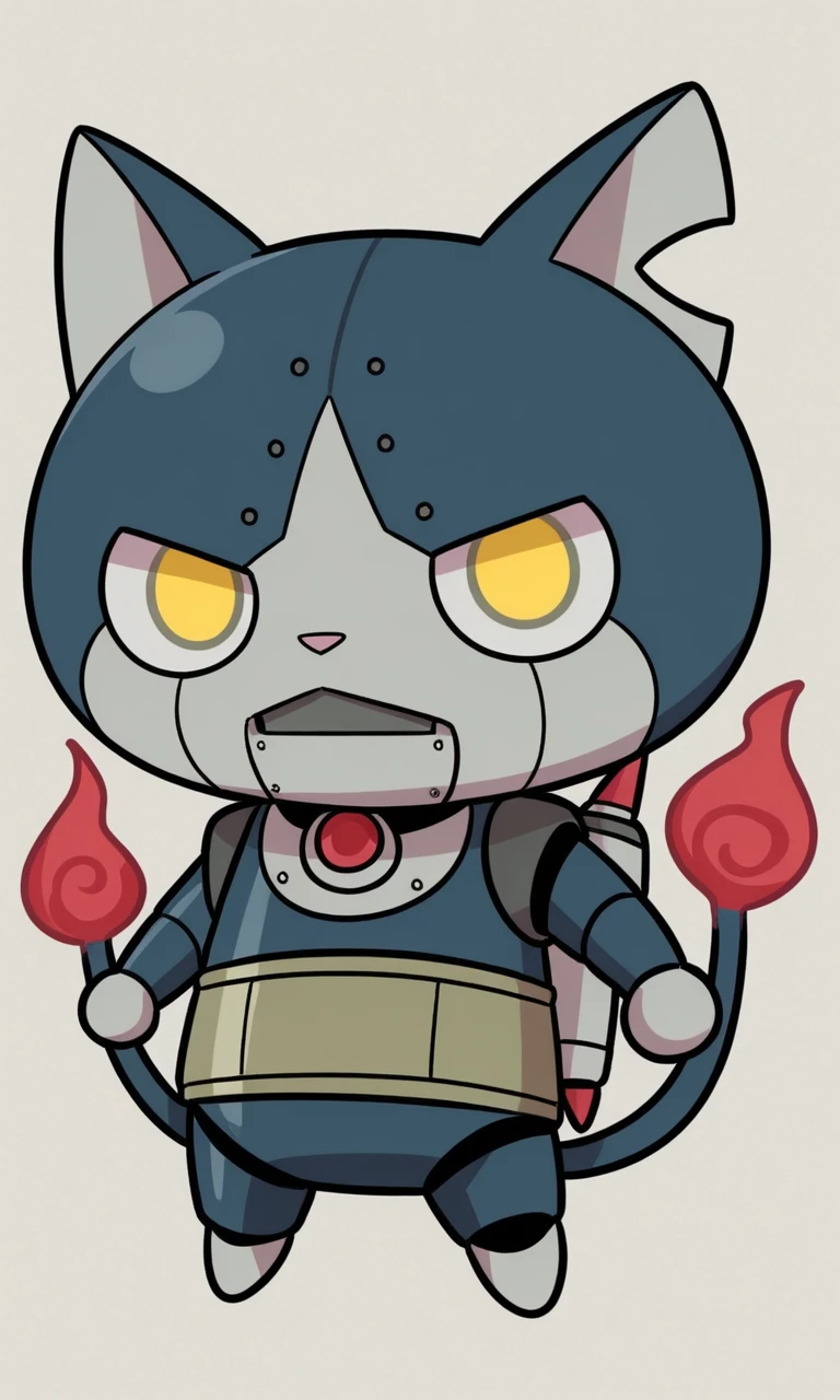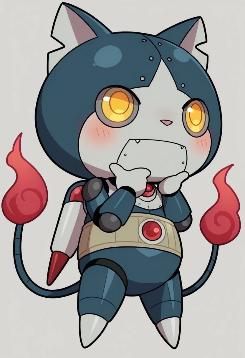 solo,male,anthro cat,robot,chibi,dark-blue body,gray face,white scleras,yellow pupils,two tails,red flame tipped tail,harakami sash,gray hands,gray paws,pink nose,jetpack,gray chest
