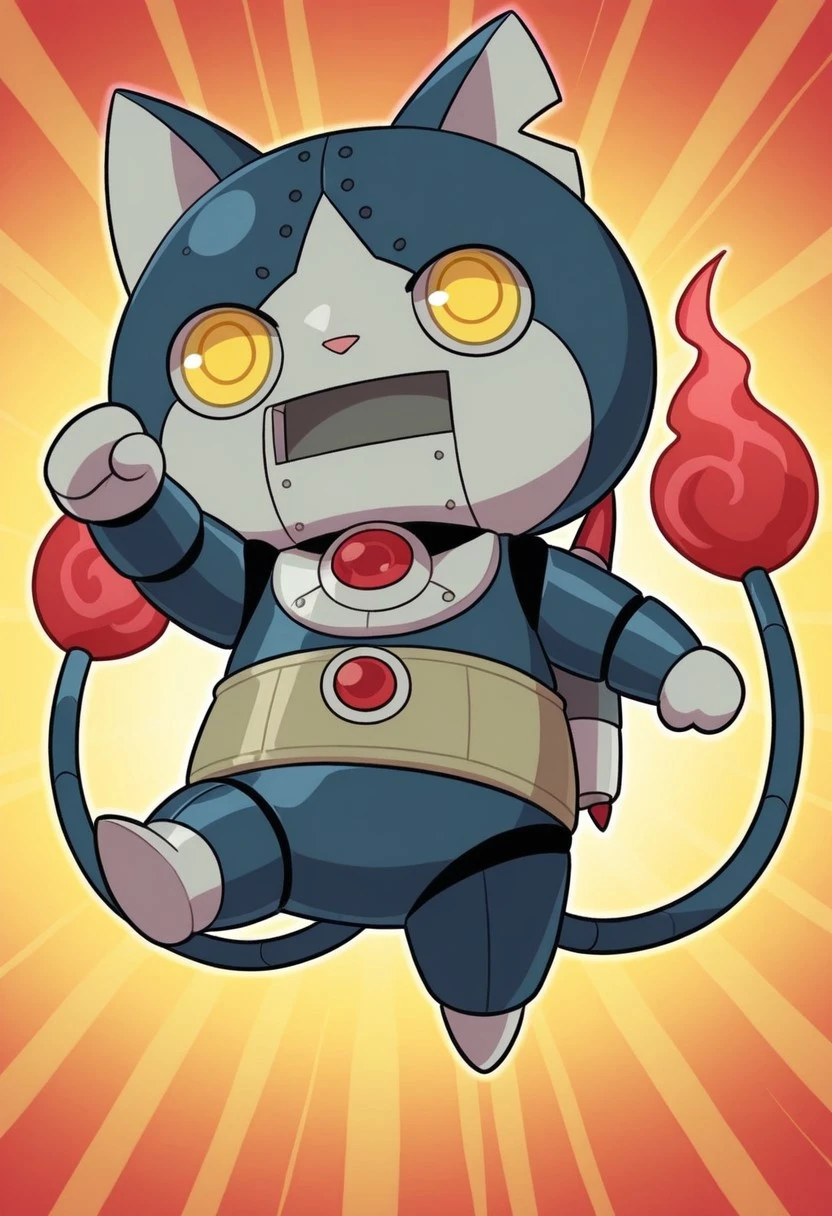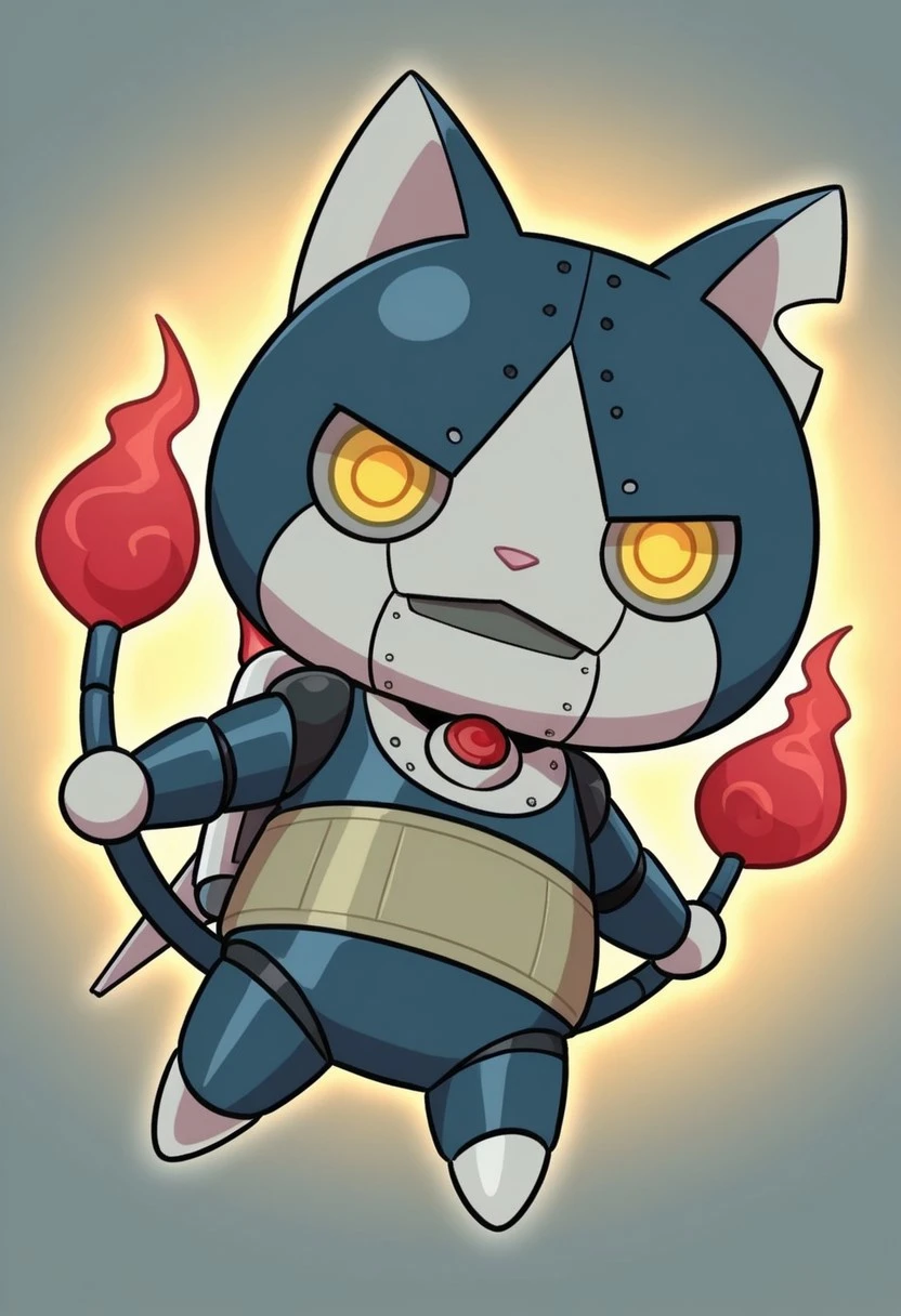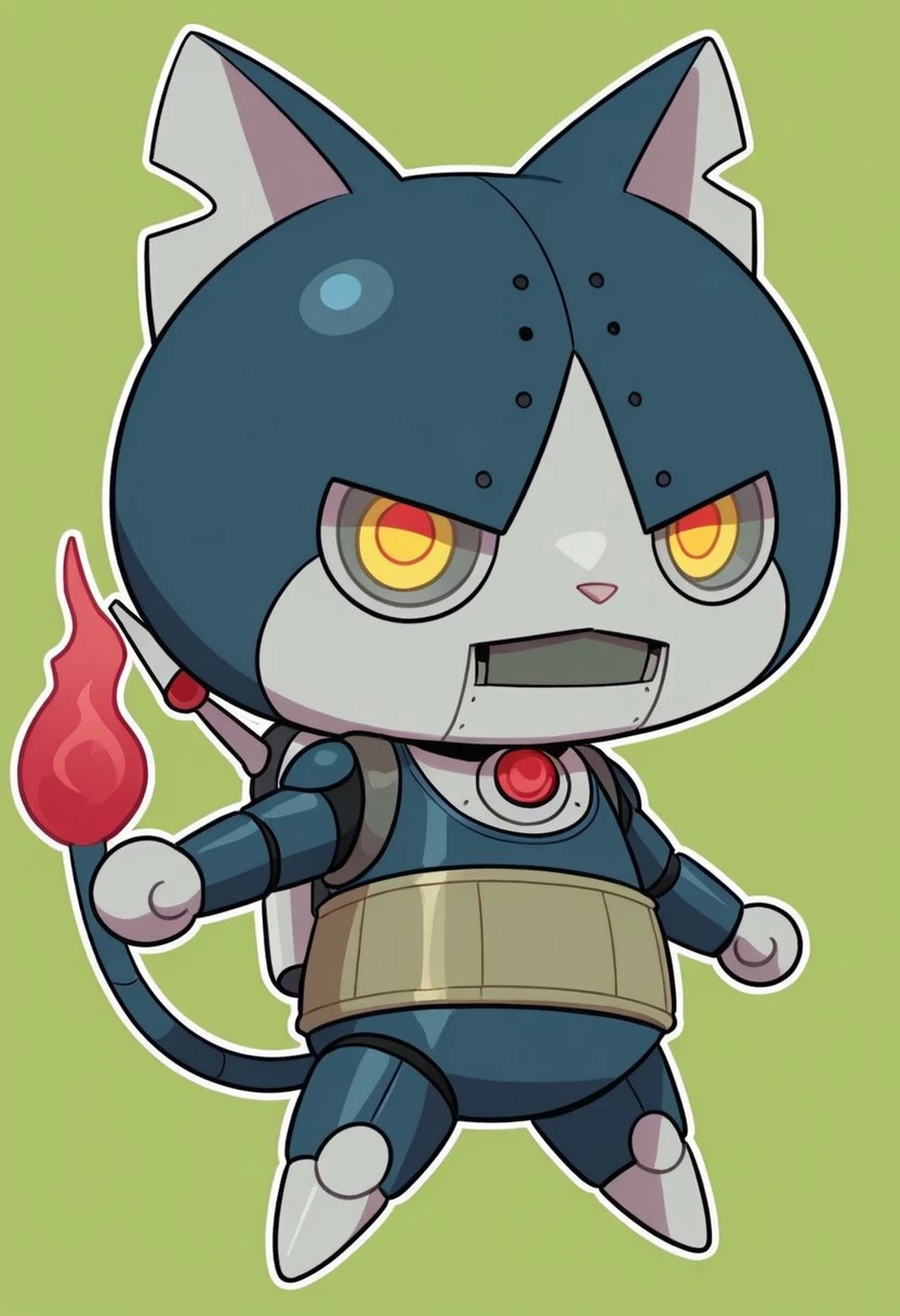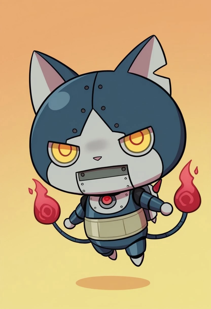 solo,male,anthro cat,robot,chibi,dark-blue body,gray face,white scleras,yellow pupils,two tails,red flame tipped tail,harakami sash,gray hands,gray paws,pink nose,jetpack,gray chest