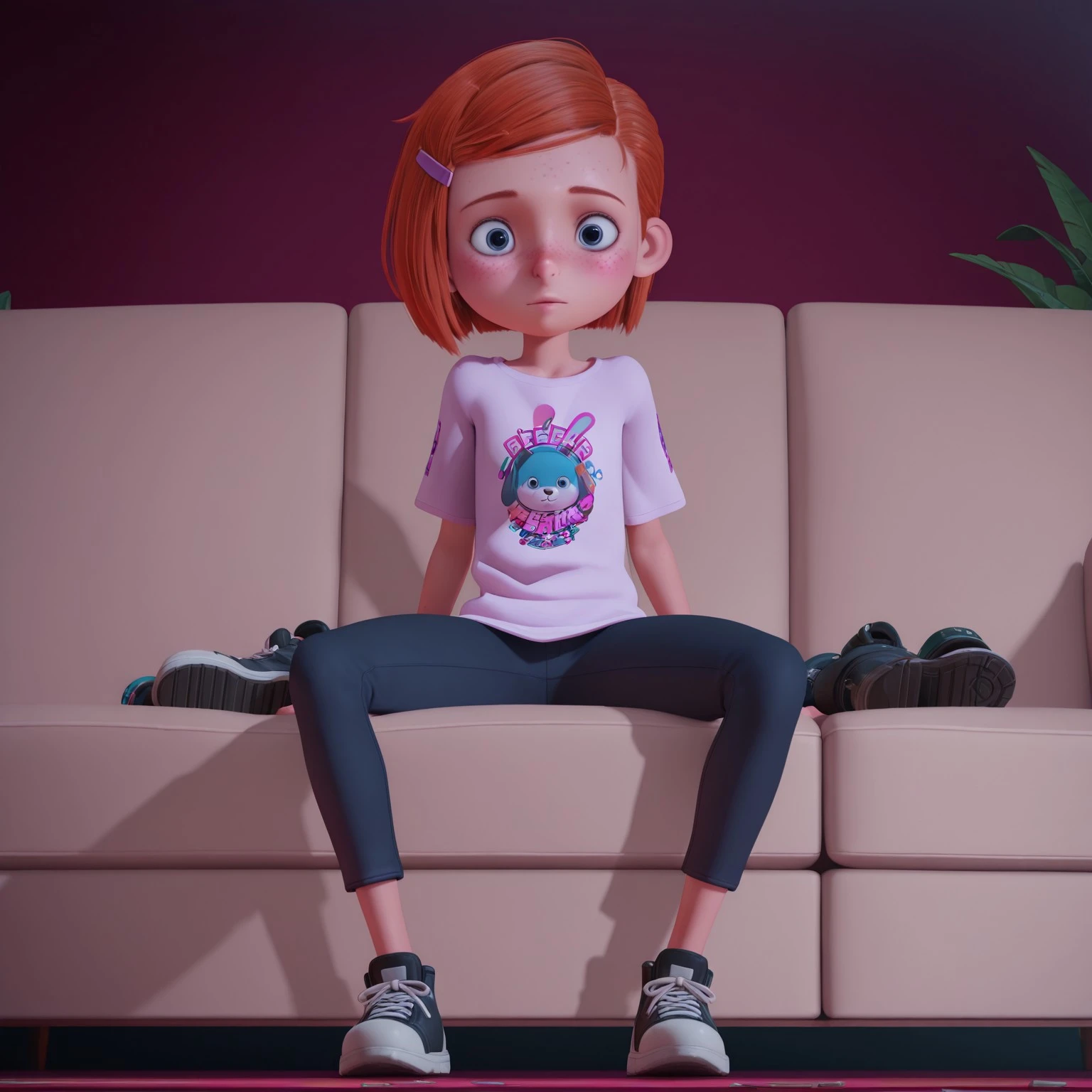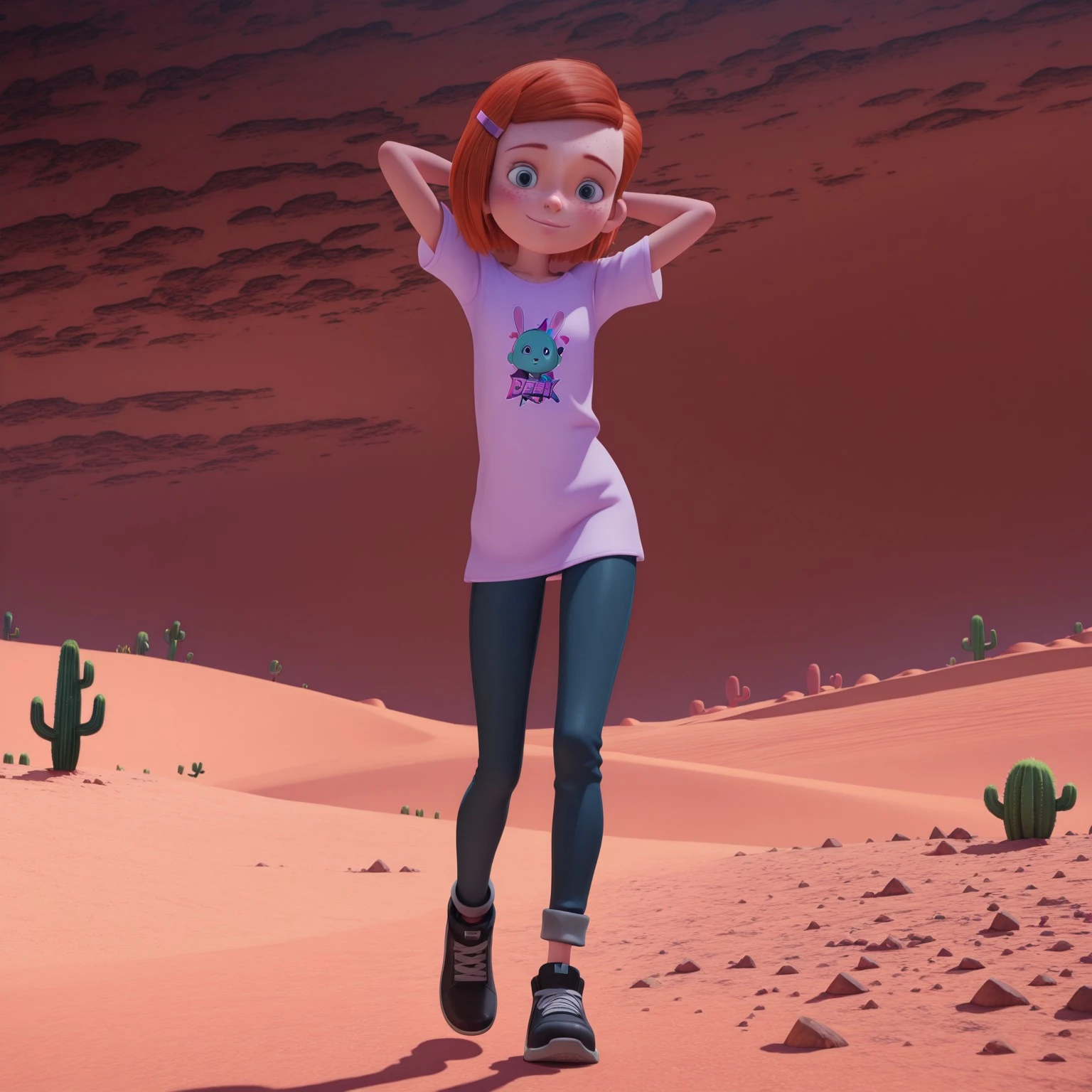 ell_rgw, orange hair, hairclip, blue eyes, freckles, t-shirt, pants, shoes