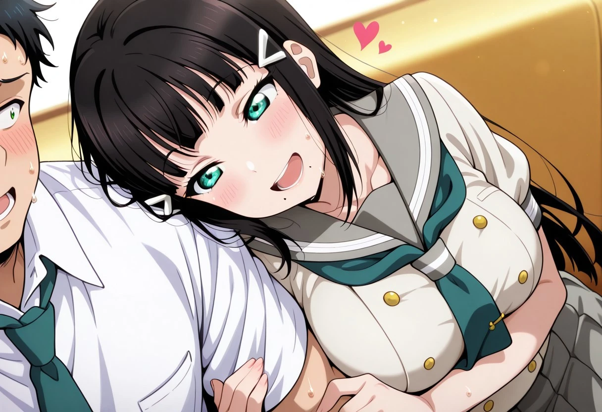 long hair, bangs, black hair, hair ornament, green eyes, sidelocks, hairclip, blunt bangs, mole, mole under mouth, breasts, mature female,