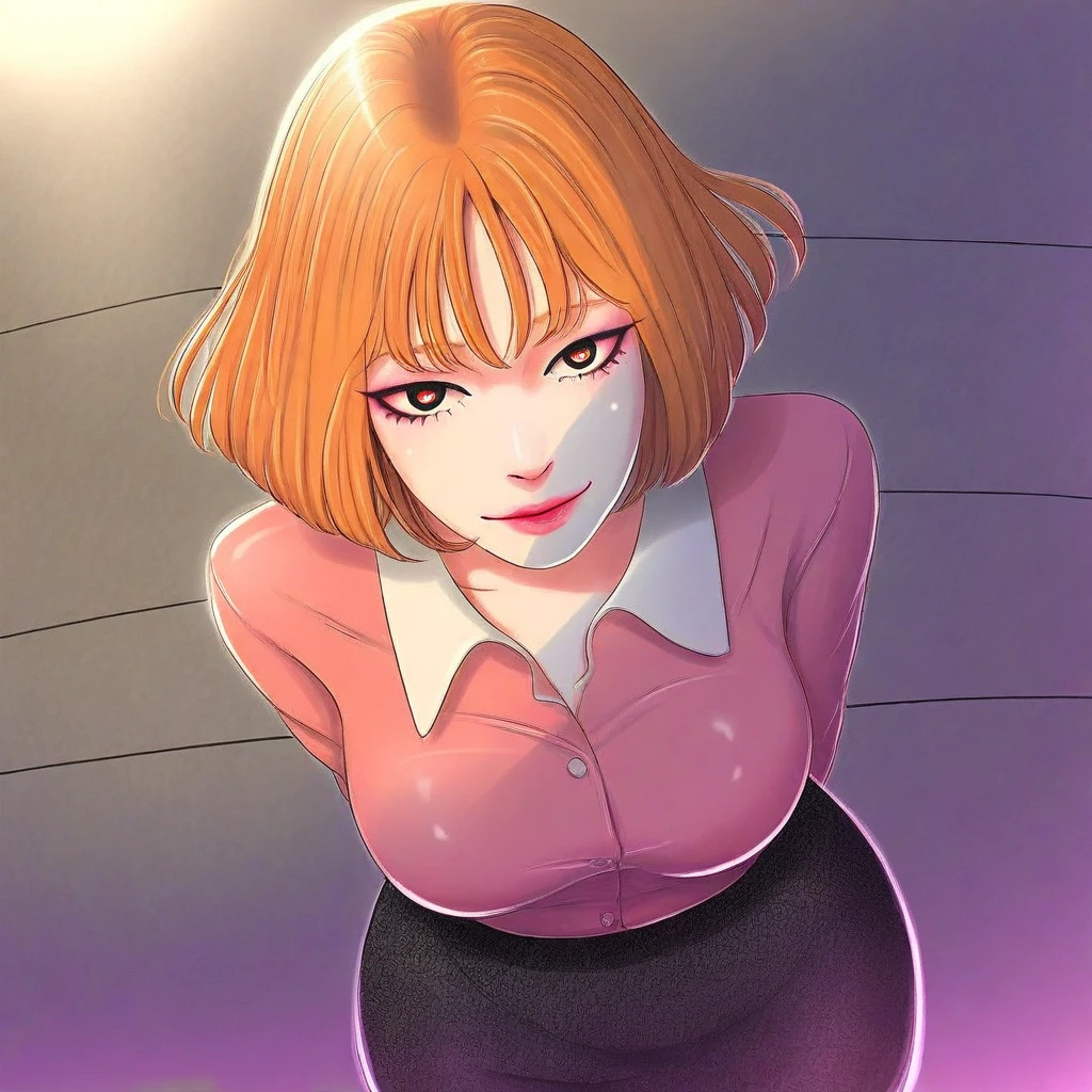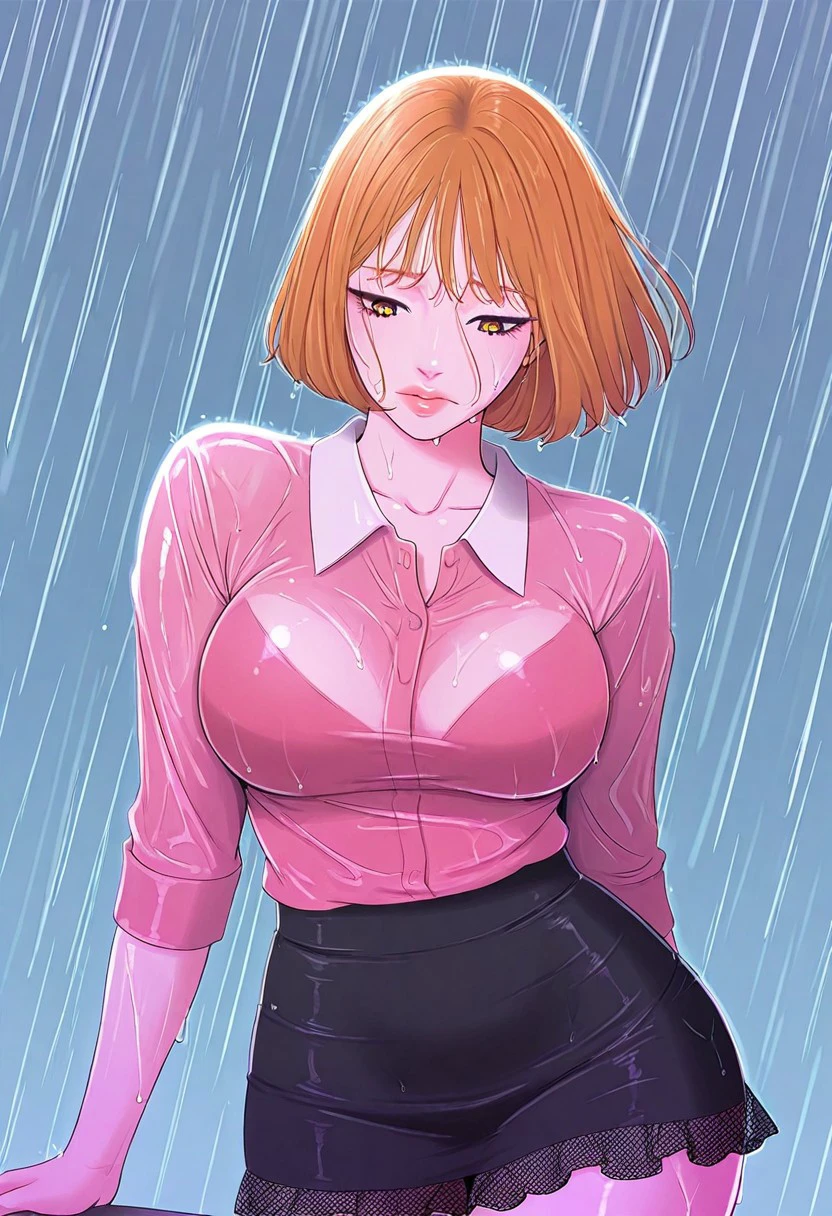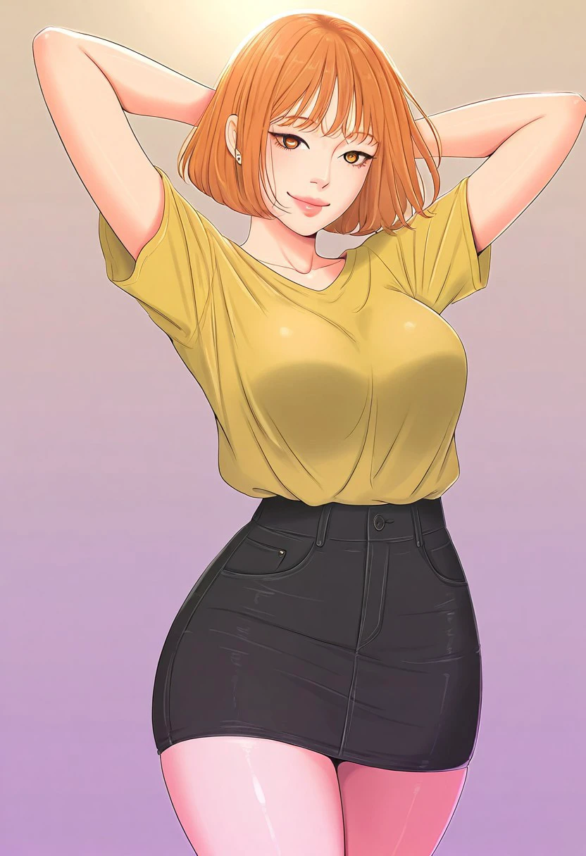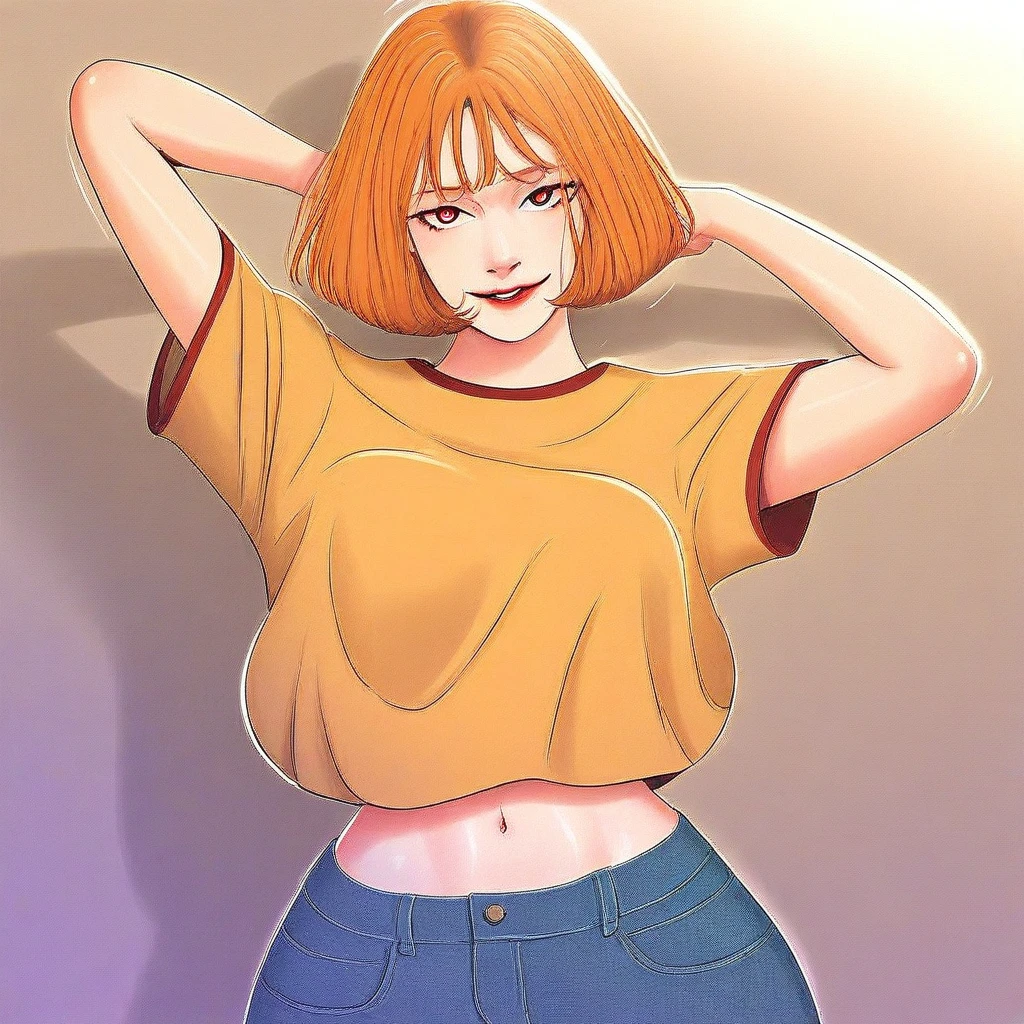 (( <lora:yung_eun-kyung:1> , yung_eun-kyung, thin waist, wide hips, beautiful skin, piercing amber eyes, clear eyes, bright pupils, beautiful eyes, beautiful orange hair, beautiful medium bob haircut, bangs, big and shaggy breasts, natural beauty, extraordinary beautiful woman, attractive woman, super sexy woman, lustful body, sexy woman with seductive obscene body, sensual body, voluptuous body, sexy beauty, no piercings, no piercing, ))