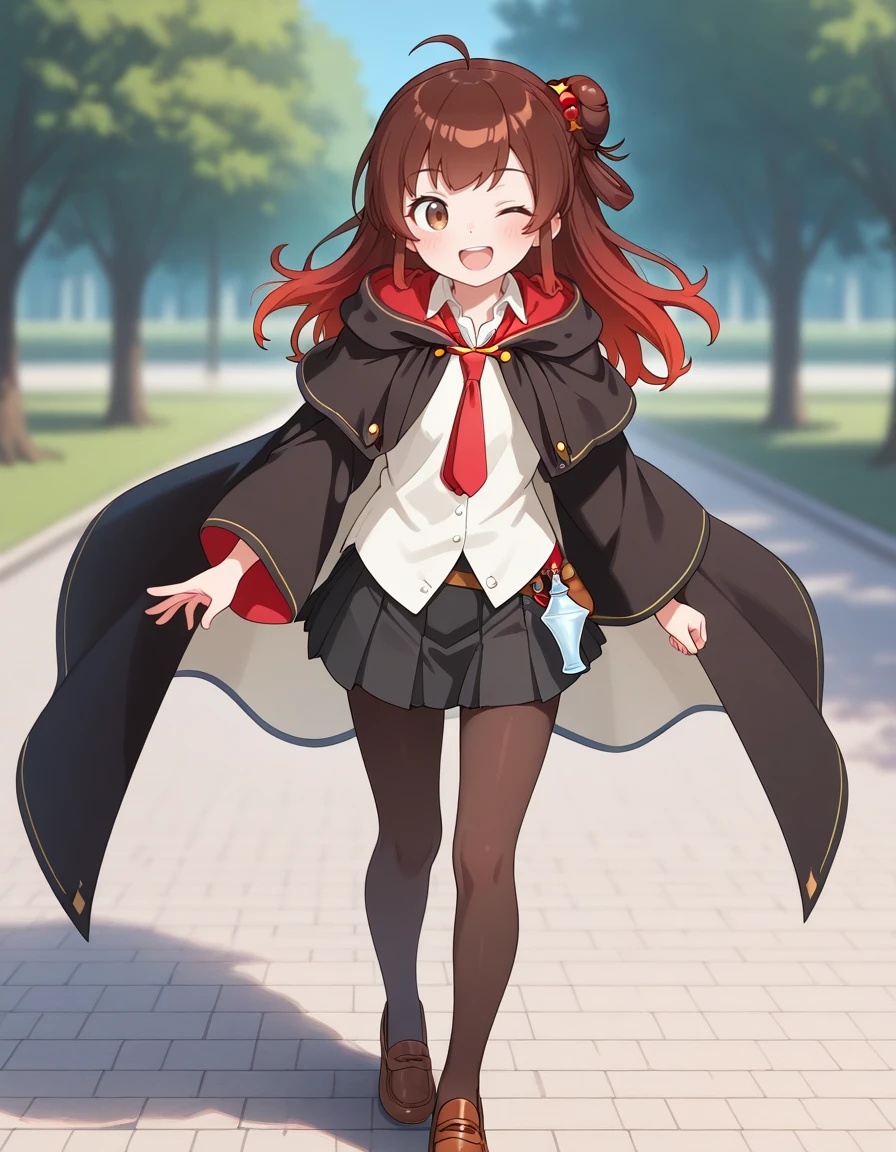 witch outfit, black cape, white collared shirt, red necktie, long sleeves, wide sleeves, belt, glass bottle, pleated skirt, black pantyhose, brown loafers