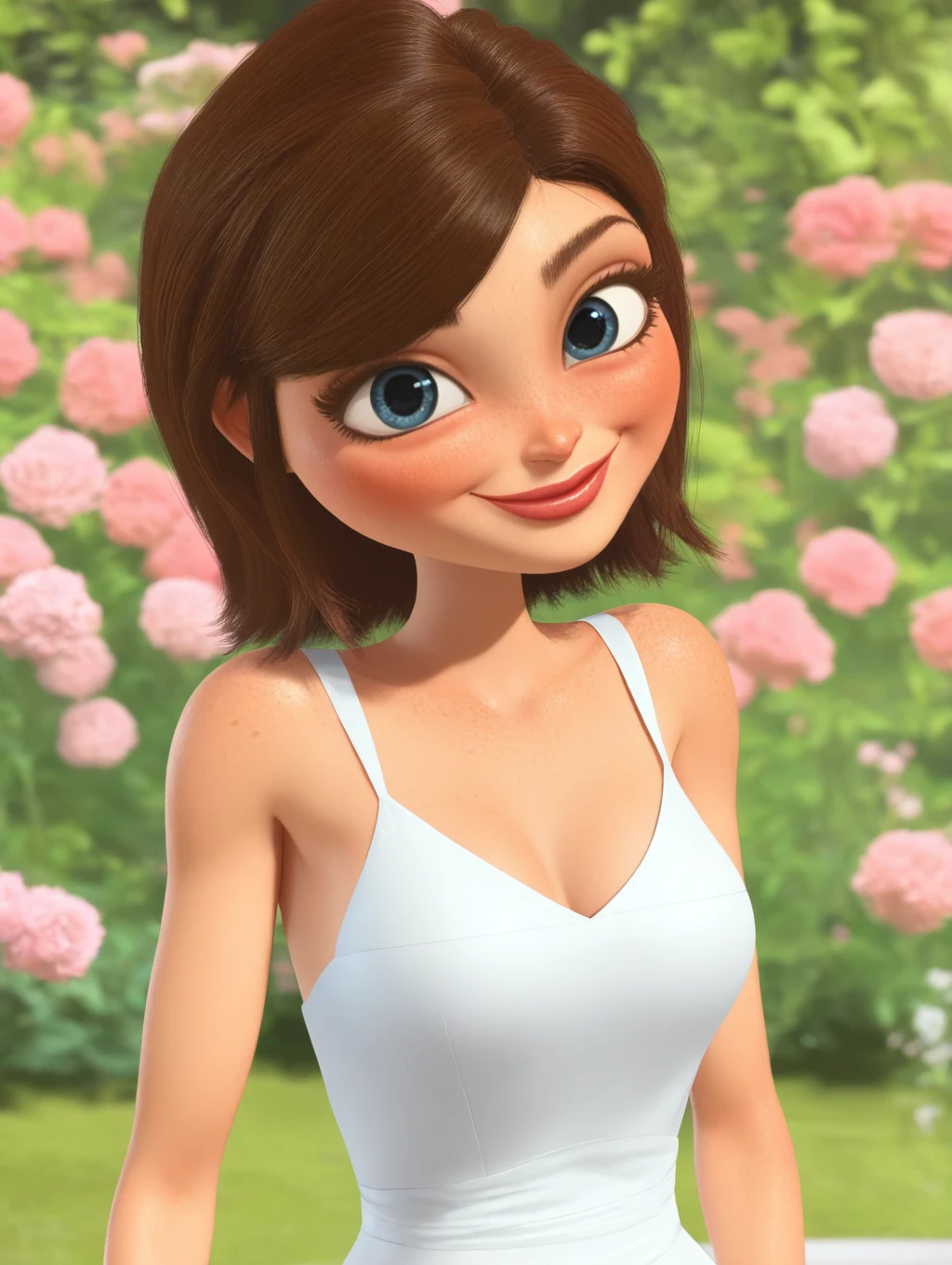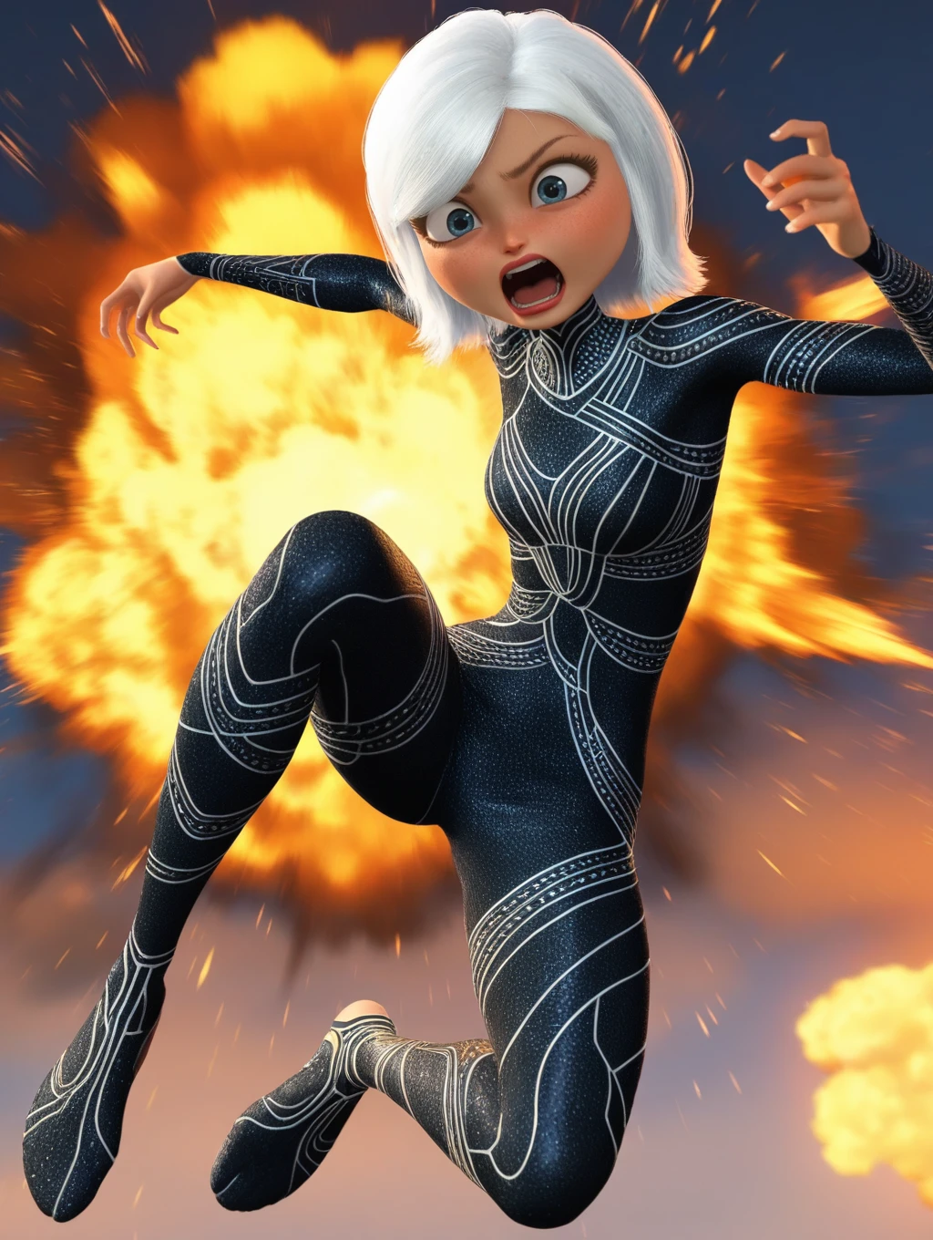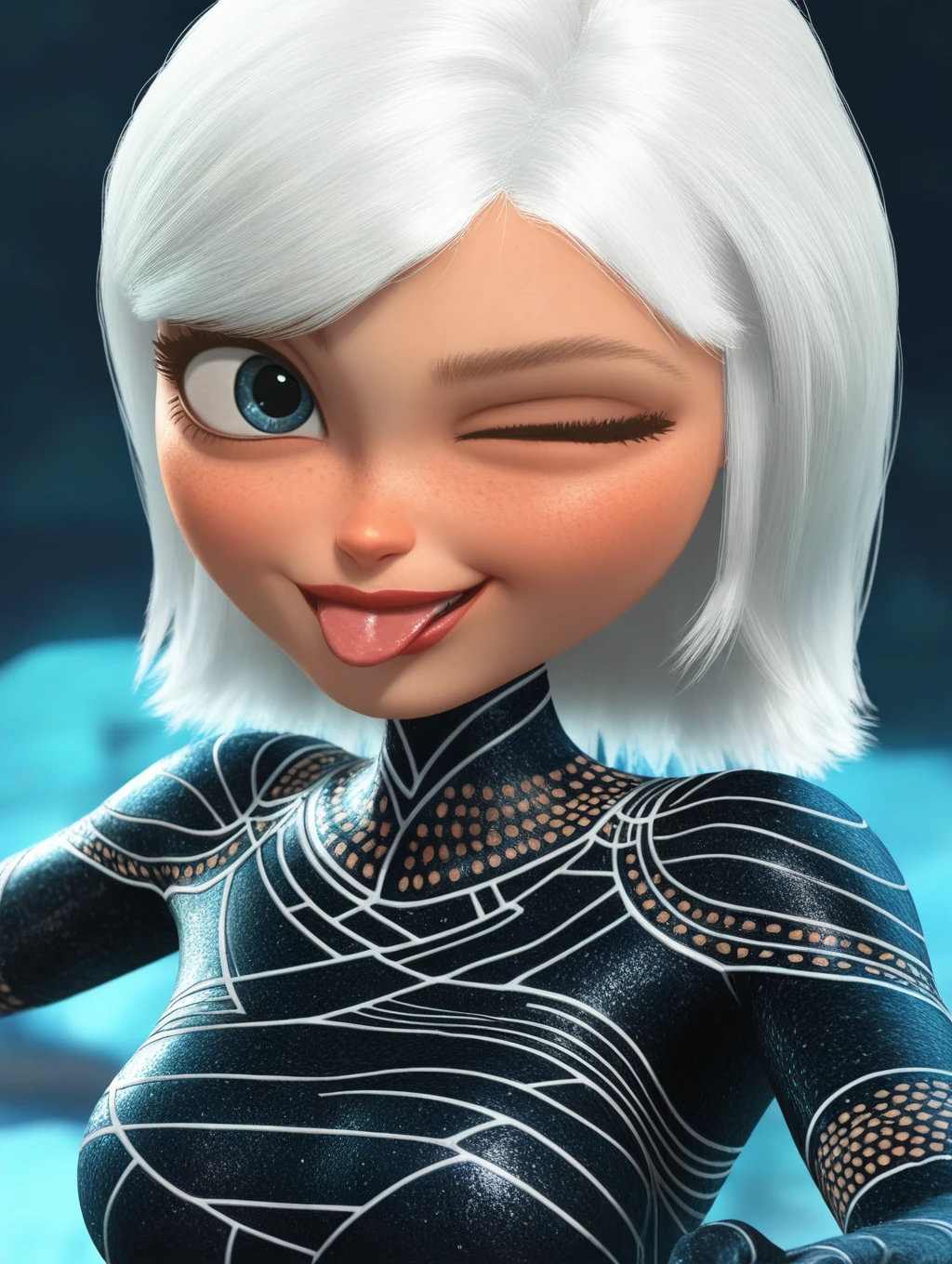 MvA_Susan, short hair, white hair, blue eyes, eyelashes, lips, 1girl, solo, swept bangs, freckles, official style, 3d, render