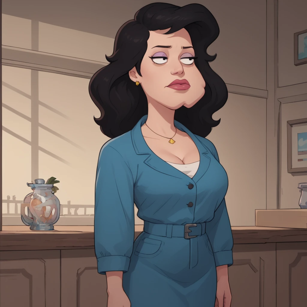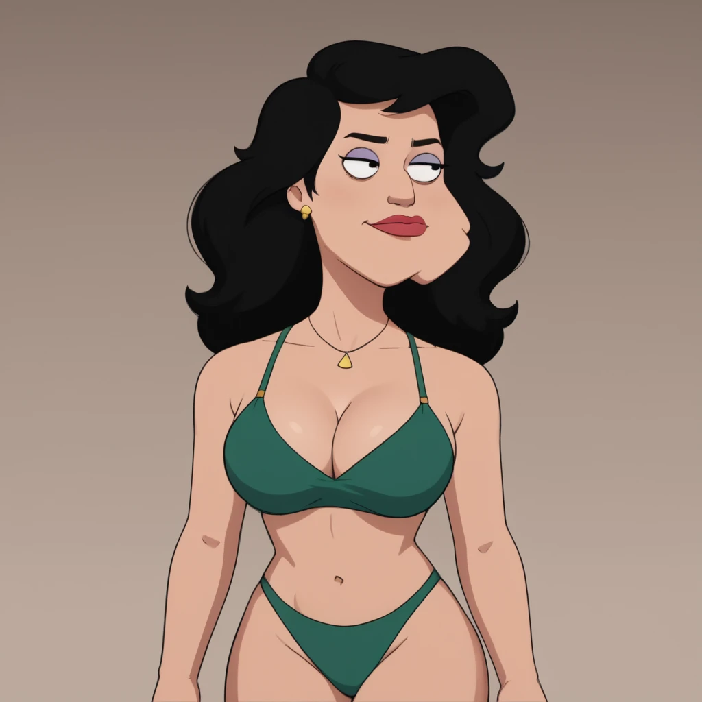 Female Stan Smith from the episode of American Dad where he turns into a woman. Activation tag is StanS63. Sometimes the eyes can come out weird so I recommend trying normal eyes or black pupils. Use this in the prompt as well - BLACK HAIR, JEWELRY, BREASTS, SOLO, EARRINGS, NECKLACE, CLEAVAGE, LIPSTICK.