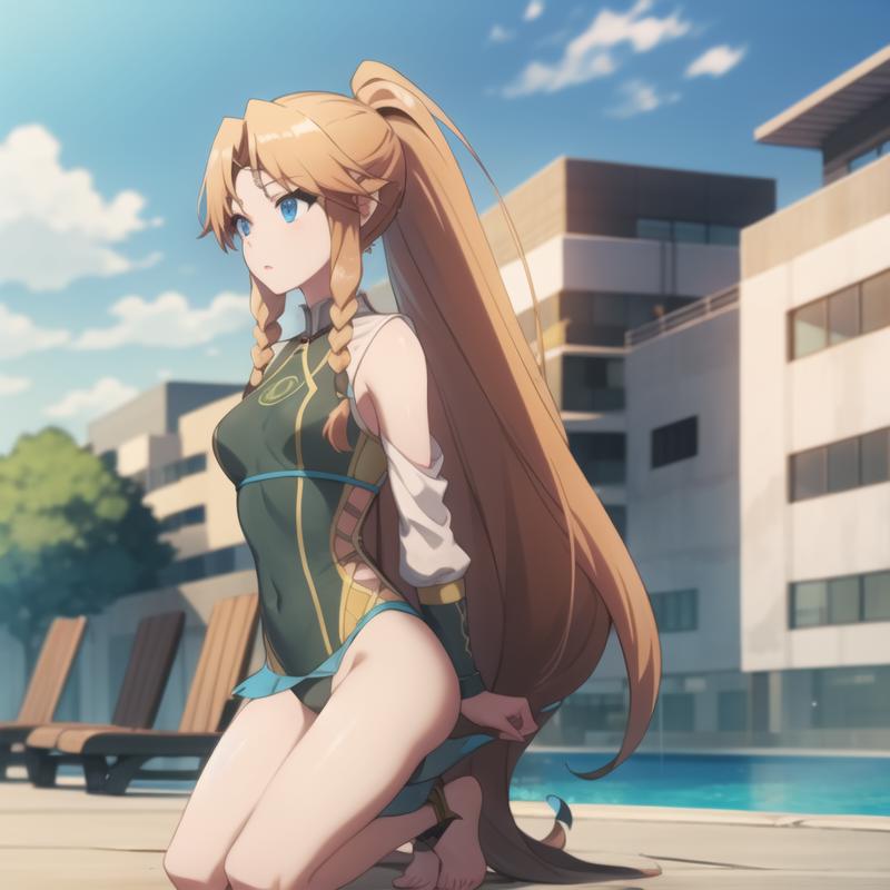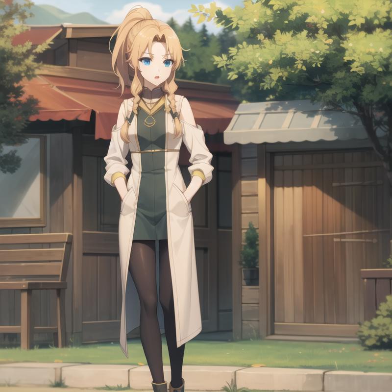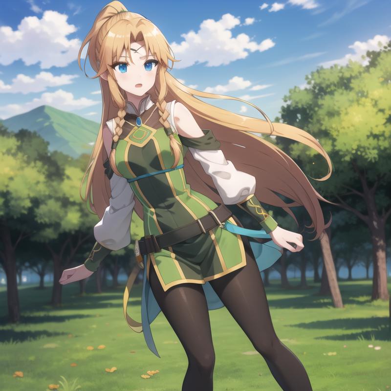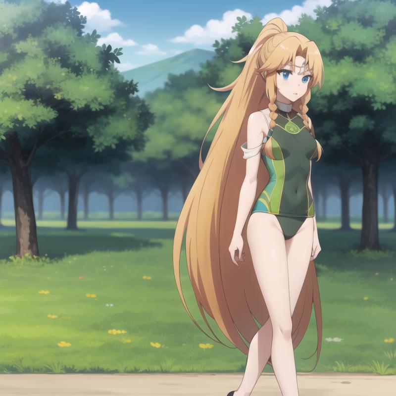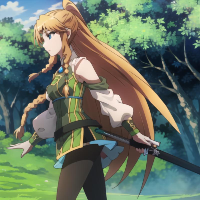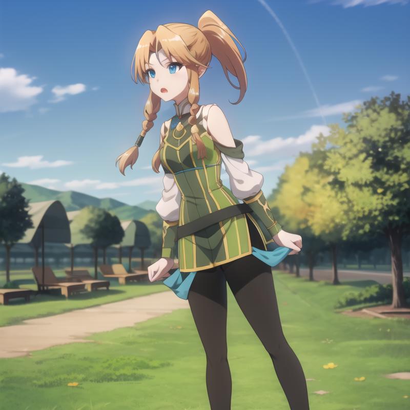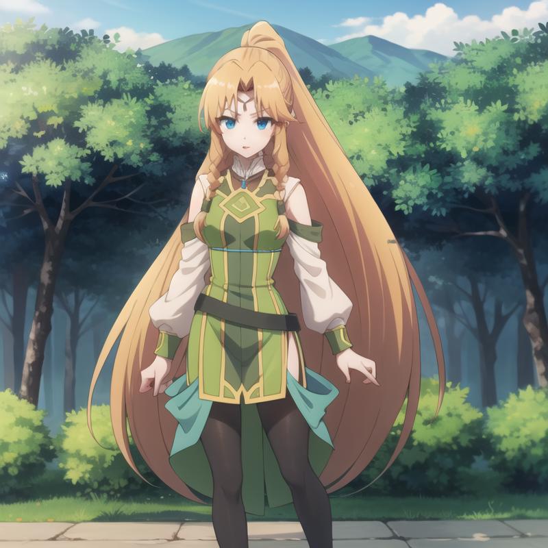 Trigger Word: icm-muller, long hair, blonde hair, blue eyes, twin braids, green dress pantyhose