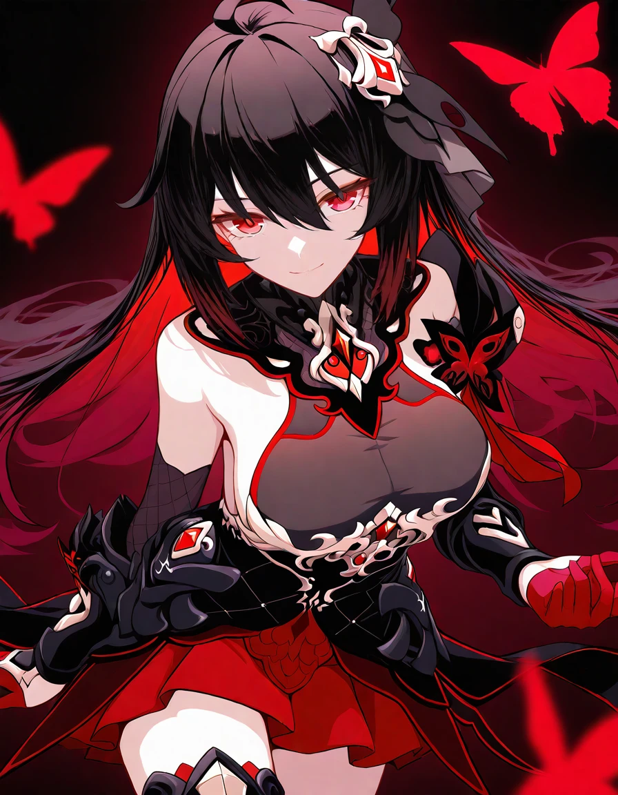 服饰:collar,necklace,red gems,butterfly decorations,red gloves,gauntlets,(sleeveless shirt,(gray top,gold underbust,black corset,red skirt,miniskirt,coattails)),thighstrap,black thighhighs,thigh boots,