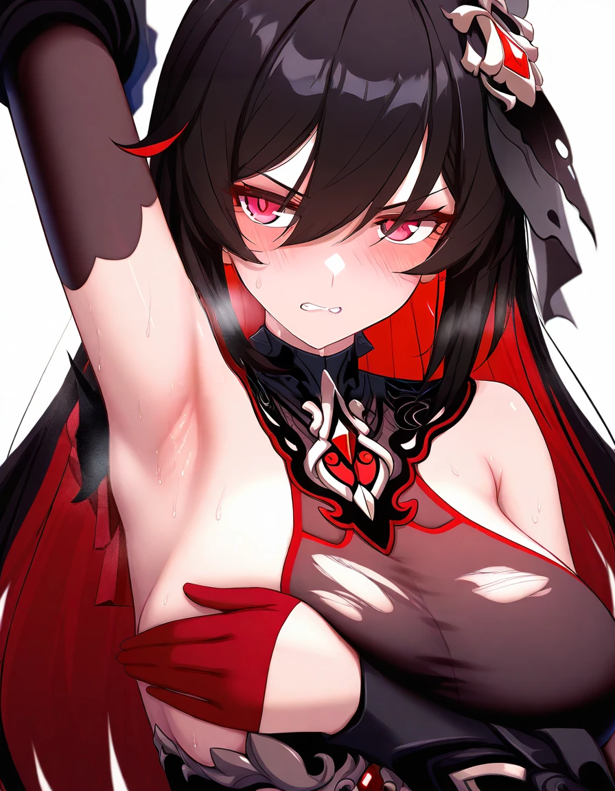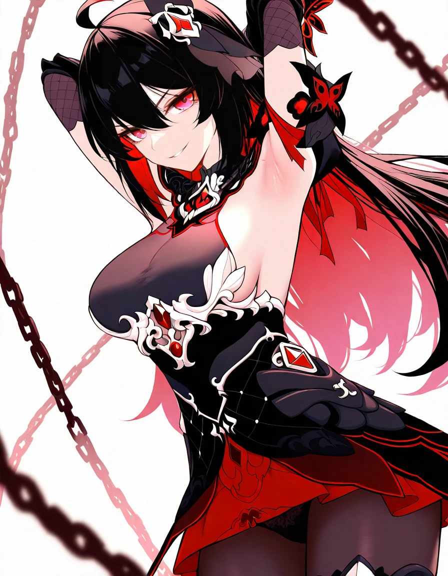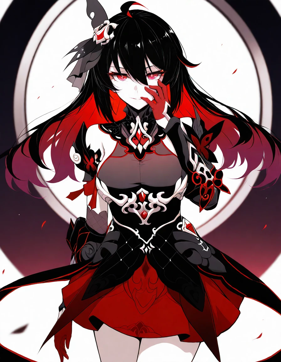 Appearance: ahoge,black hair,two-tone hair,multicolored hair,colored inner hair,[[red hair]],long hair,hair ornament,hair between eyes,bangs,red eyes,