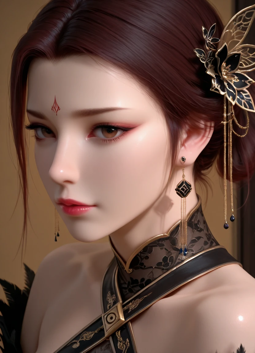 yafei, brown eyes,forehead mark,makeup,red lips, earrings,hair ornament, red hair,short hair, feather trim,halterneck, bare shoulders,black dress,bridal gauntlets, see-through, hyur,jewelry, realistic,