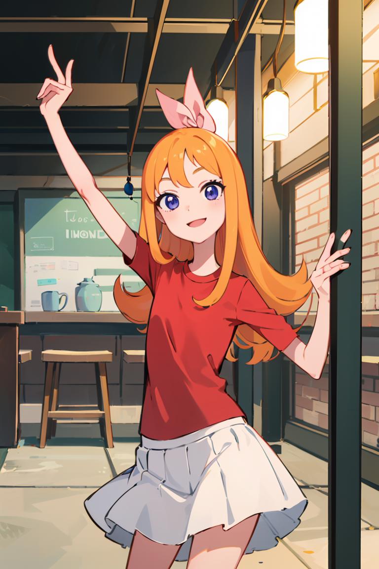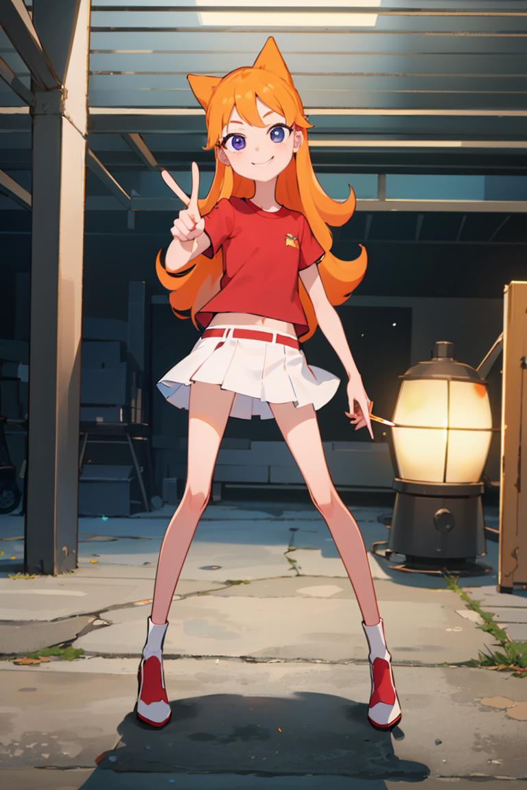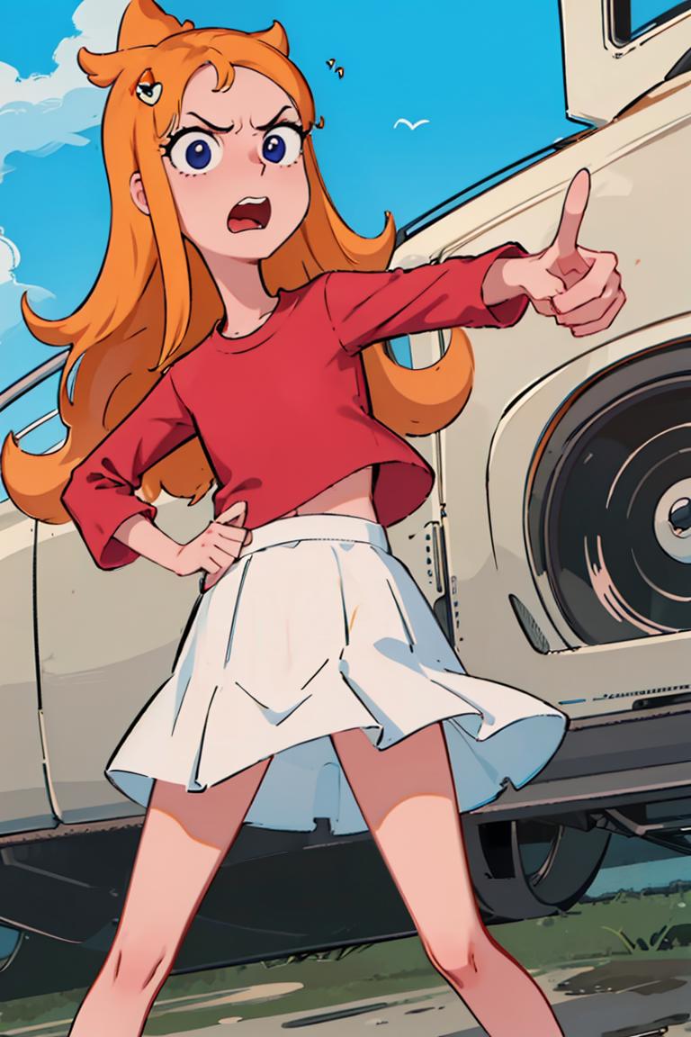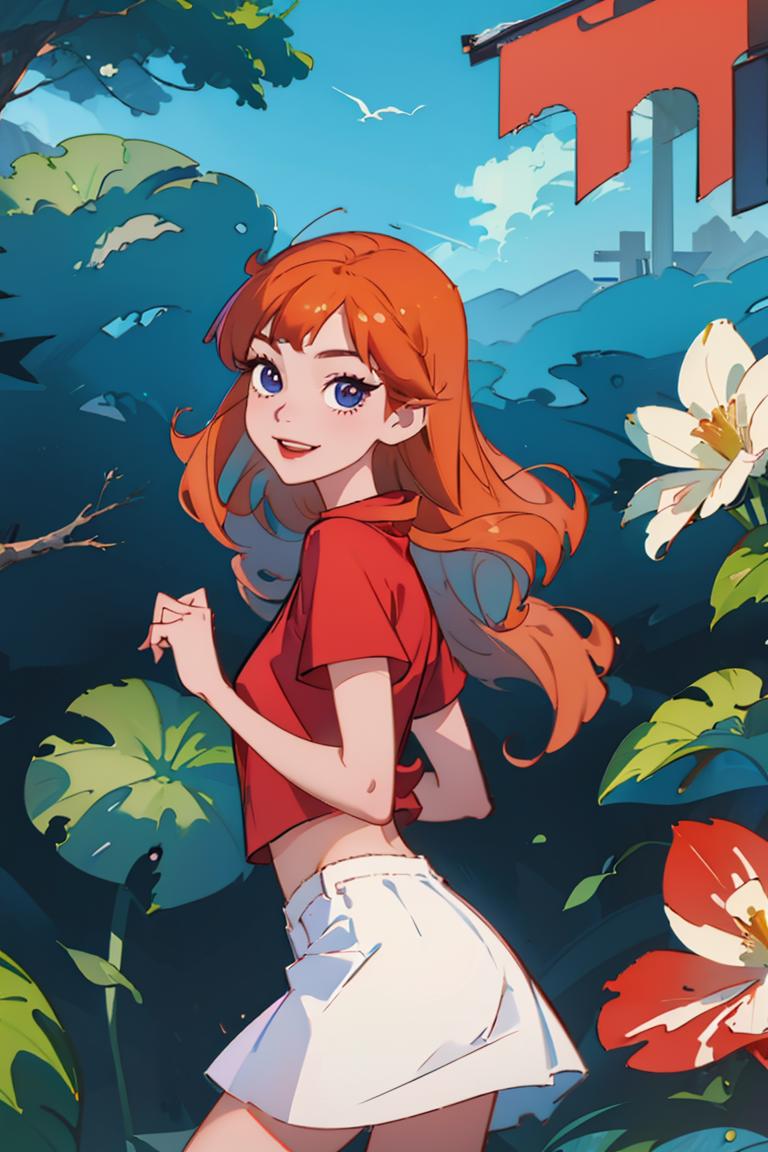 candace_flynn <lora:CandaceFlynn_v1:1>I recommend playing around with different checkpoints because her hair will most likely be interpreted differently depending on the checkpoint used, some ignore the shape, some create a ponytail or ahoge from her hairstyle, you can try adding these hairstyles to the negative prompt for less weird results.