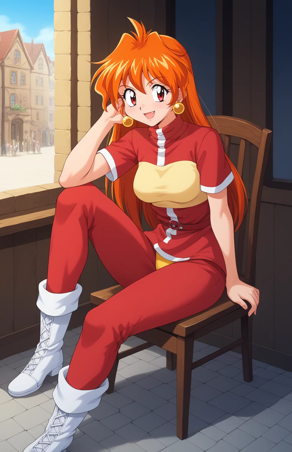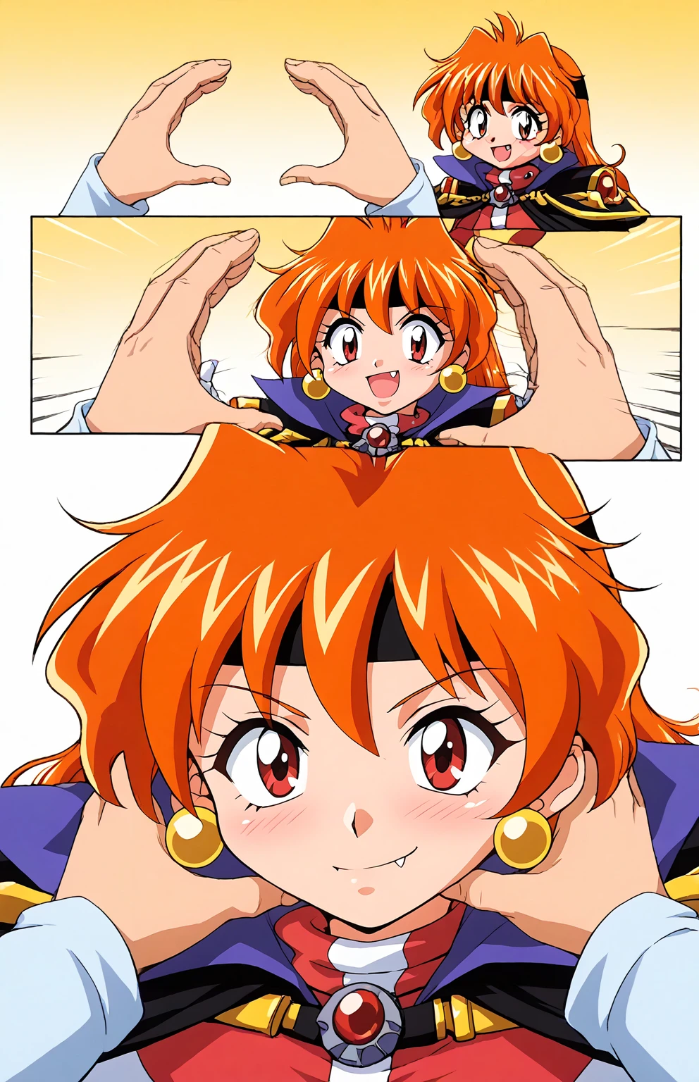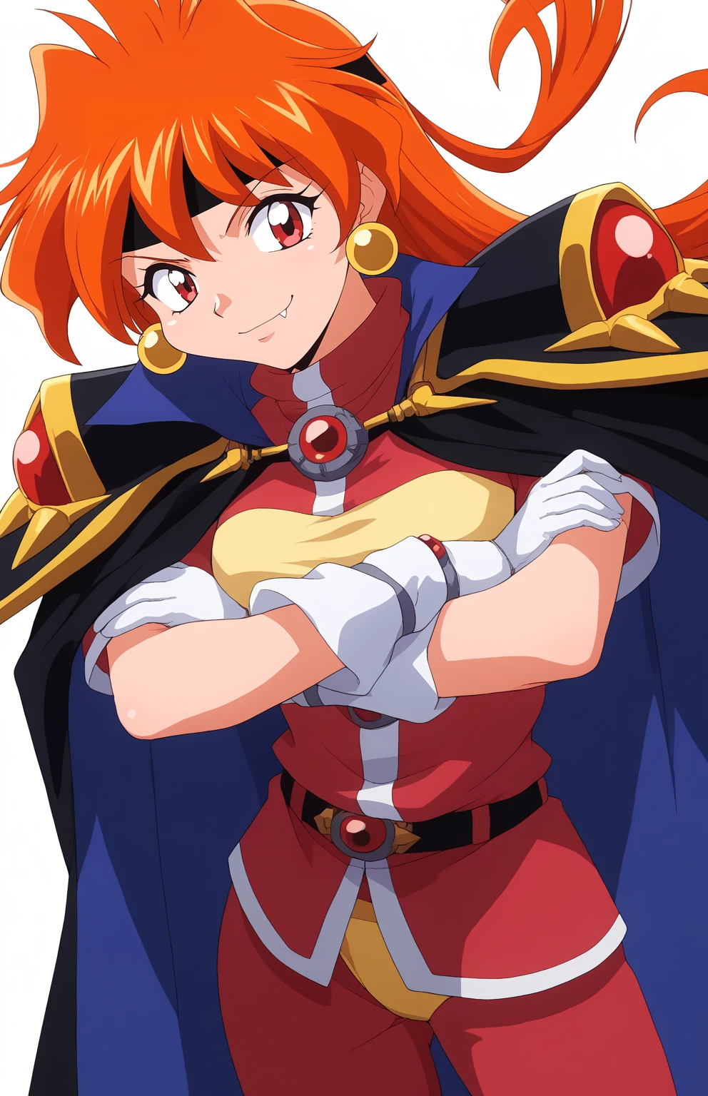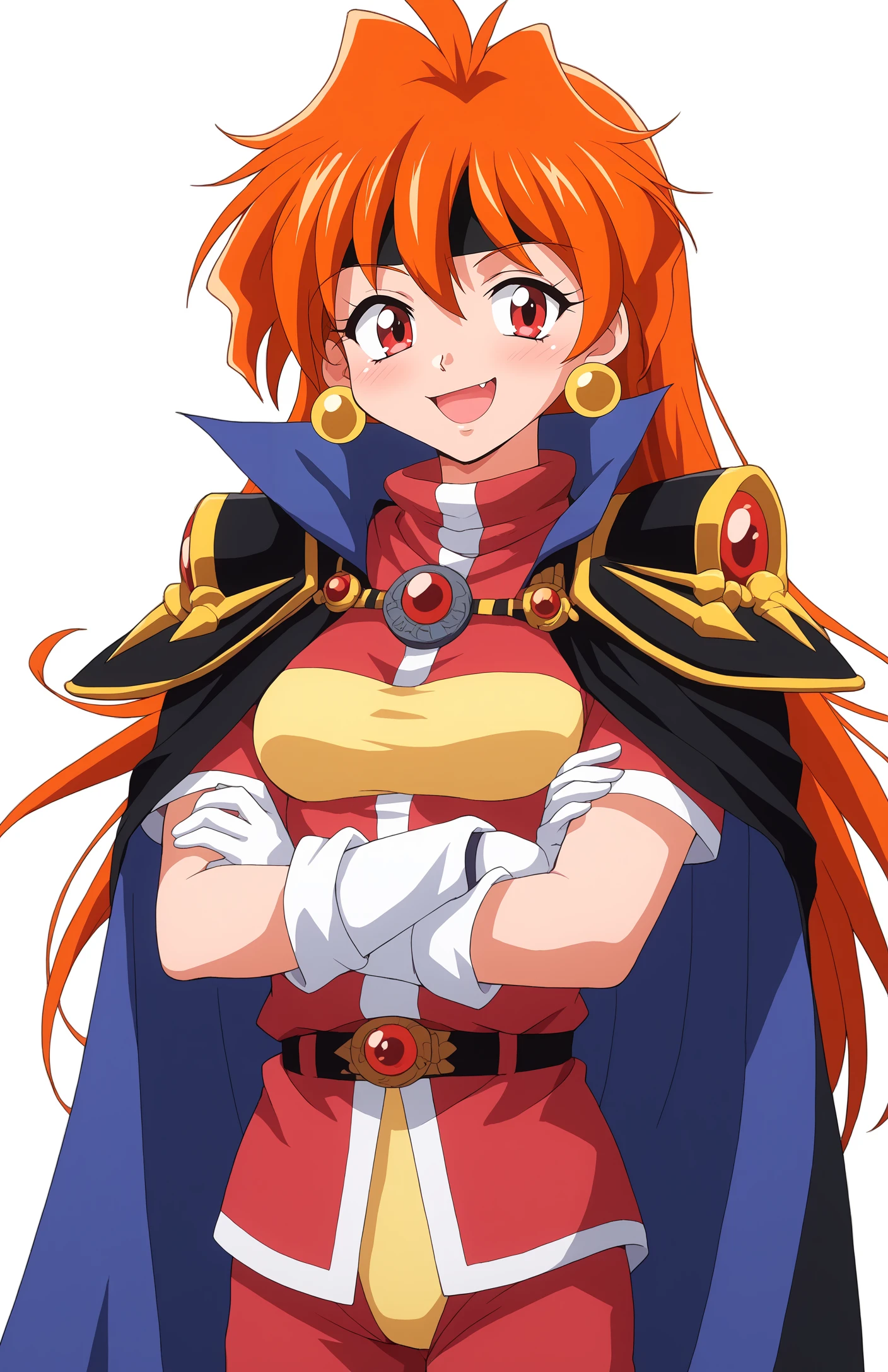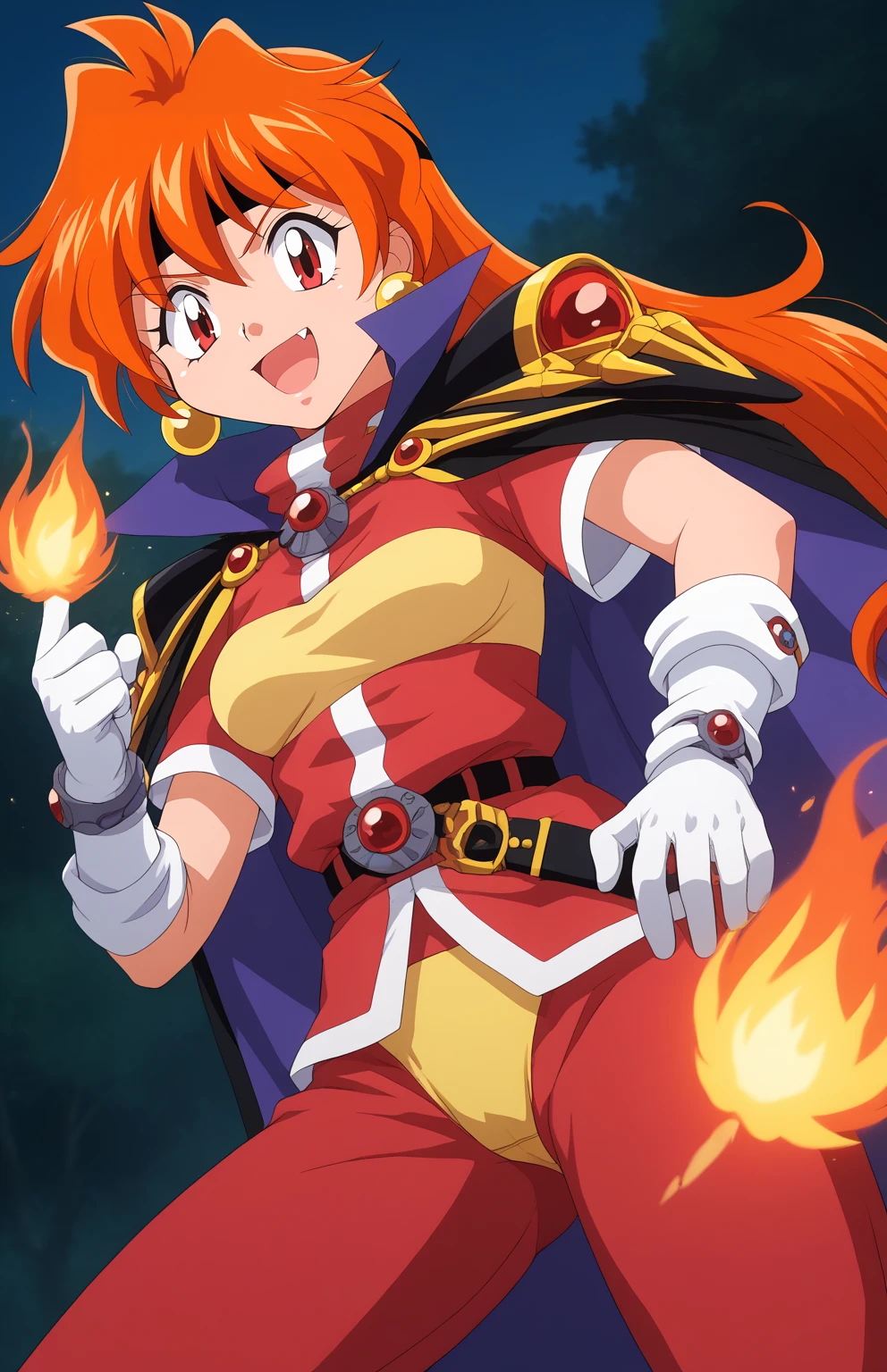lina inverse, retro artstyle, 1990s (style), 1girl, orange hair, long hair, BIG EYES, red eyes, fang, medium breasts,