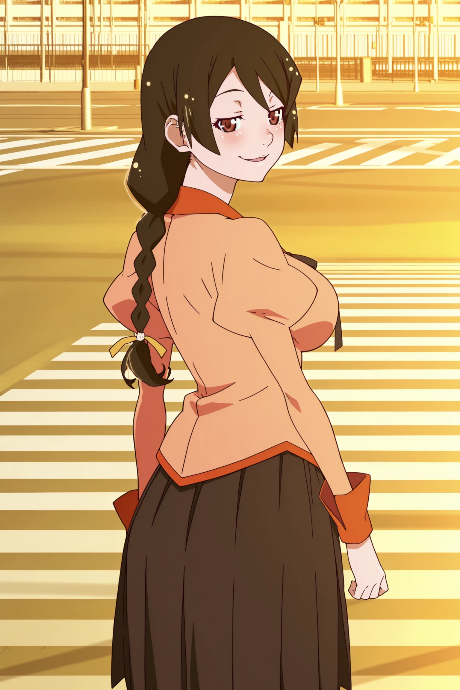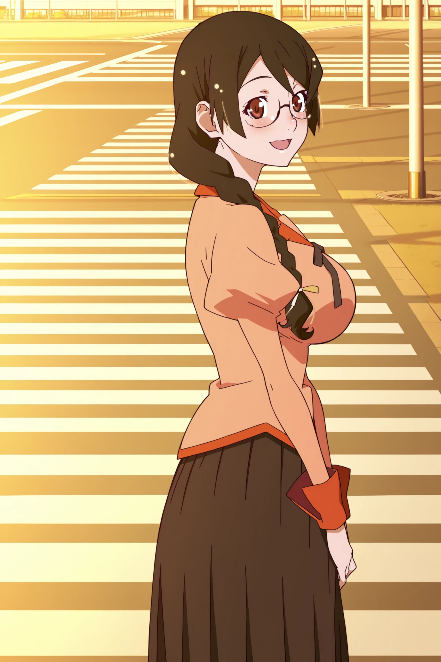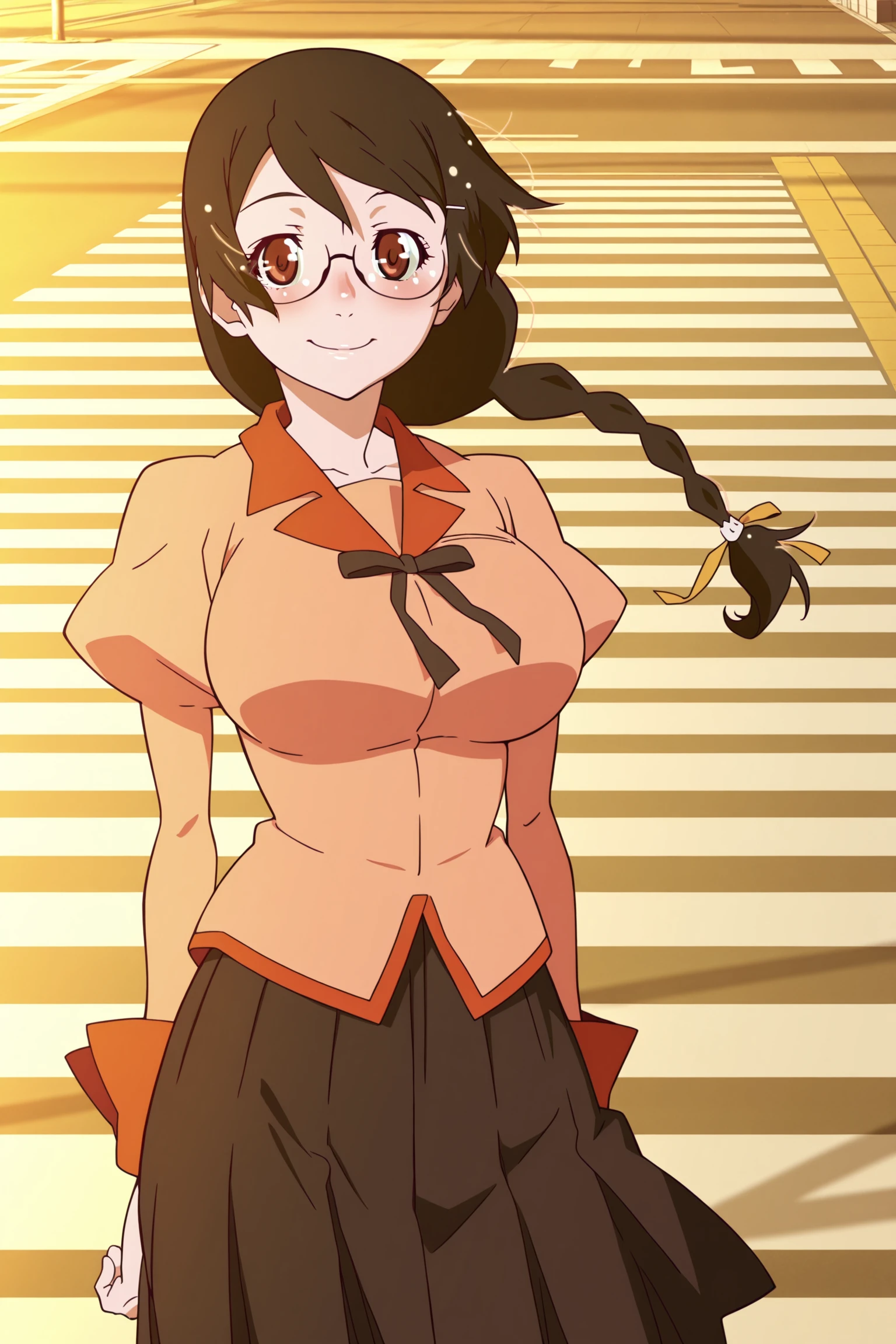 h&n3k&w&k1zumonogatari, 1girl, solo, long hair, black hair, braid, large breasts | glasses